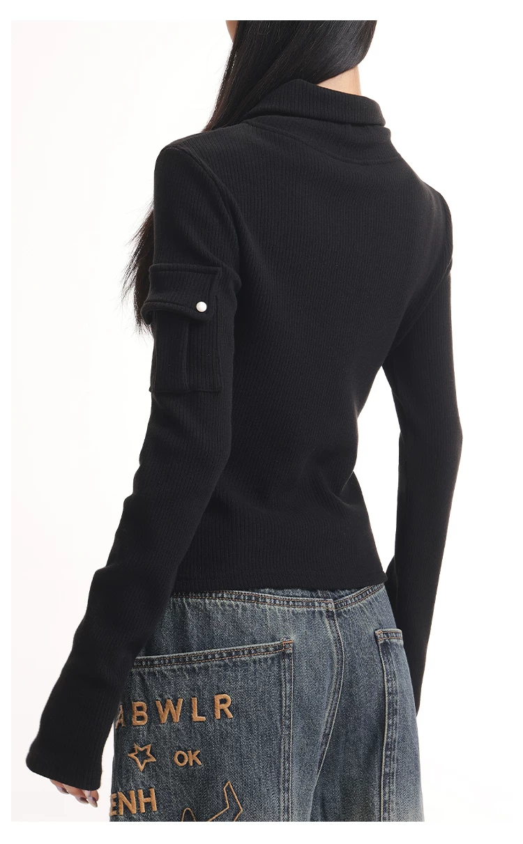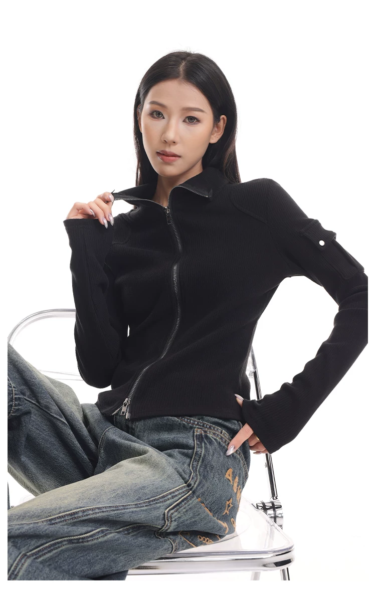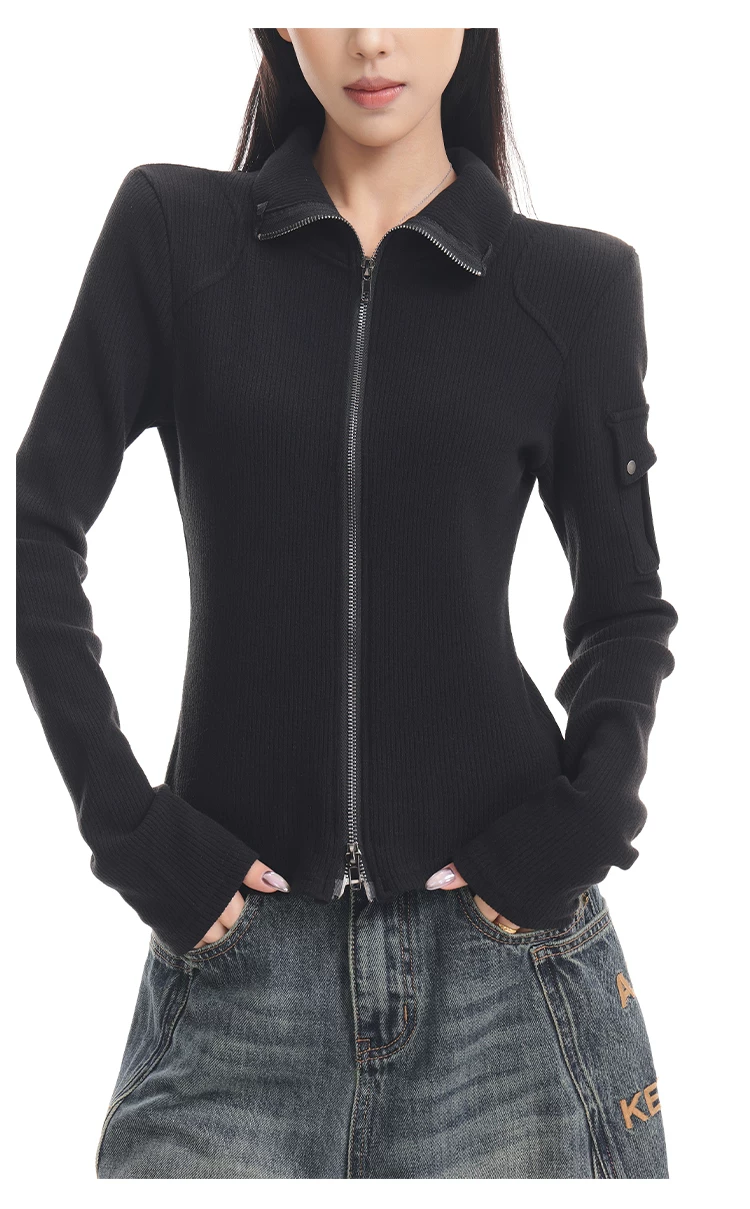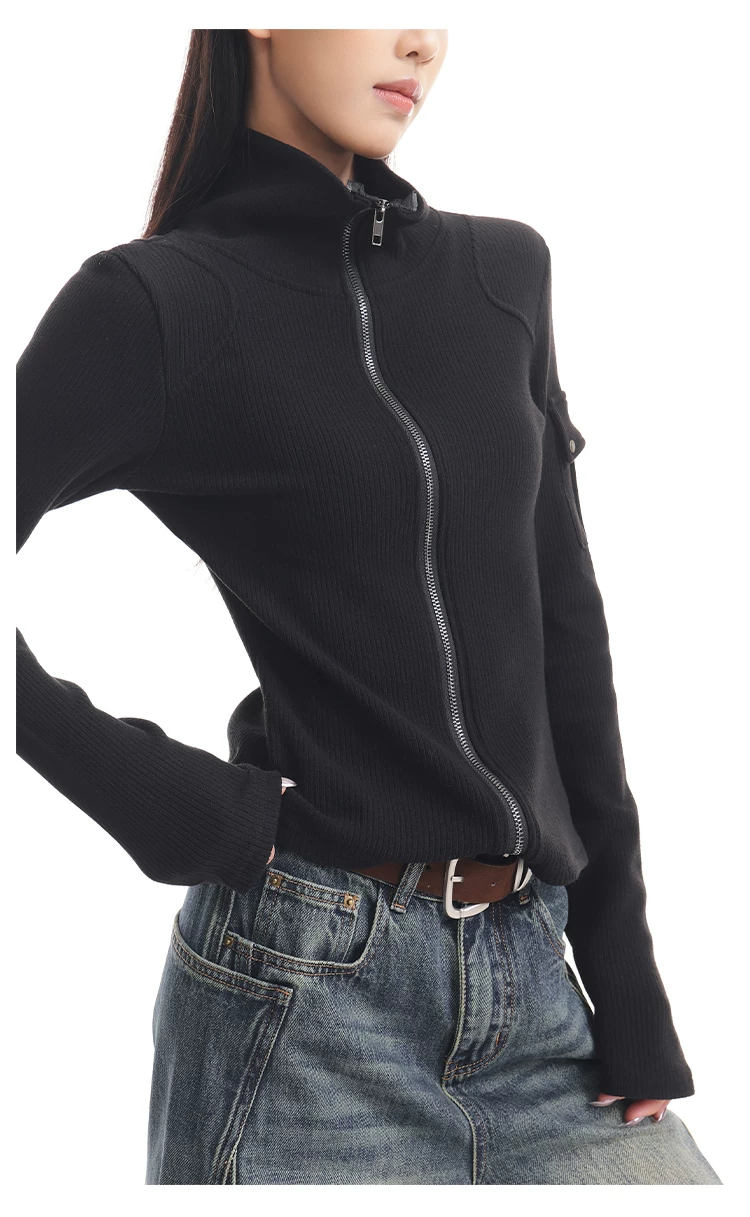 KEN STUDIO mới mùa thu đông màu đen dệt kim nữ có khóa kéo đôi có ve áo dáng ôm vừa vặn áo cardigan dài tay