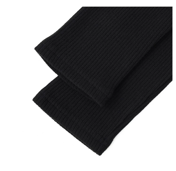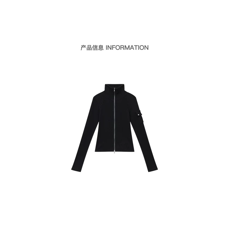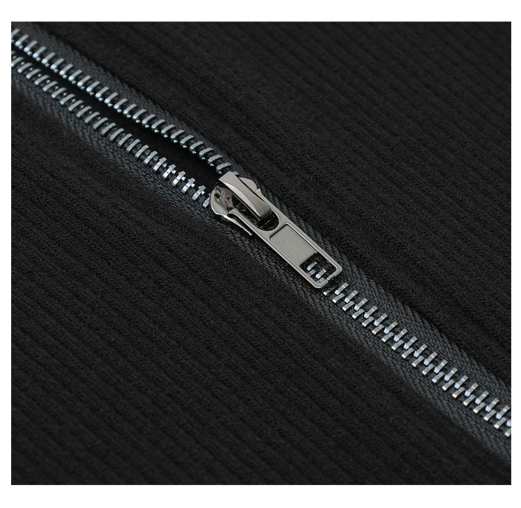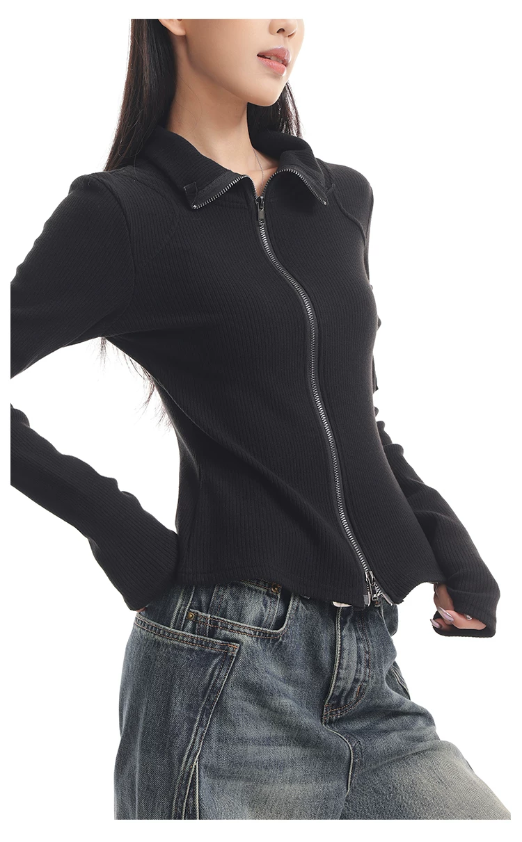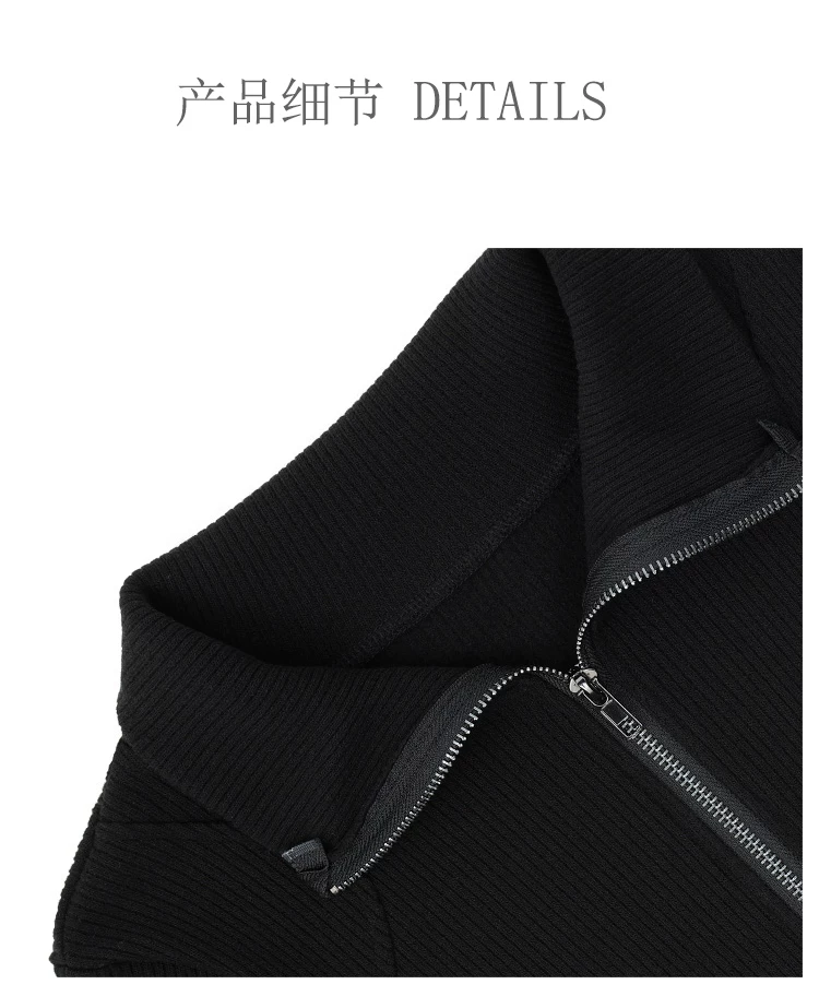 - KEN STUDIO mới mùa thu đông màu đen dệt kim nữ có khóa kéo đôi có ve áo dáng ôm vừa vặn áo cardigan dài tay