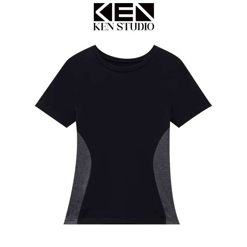 KEN STUDIO mùa hè mới áo thun cổ tròn phối màu ngắn tay dành cho nữ, áo sơ mi dáng ôm vừa vặn hợp thời trang