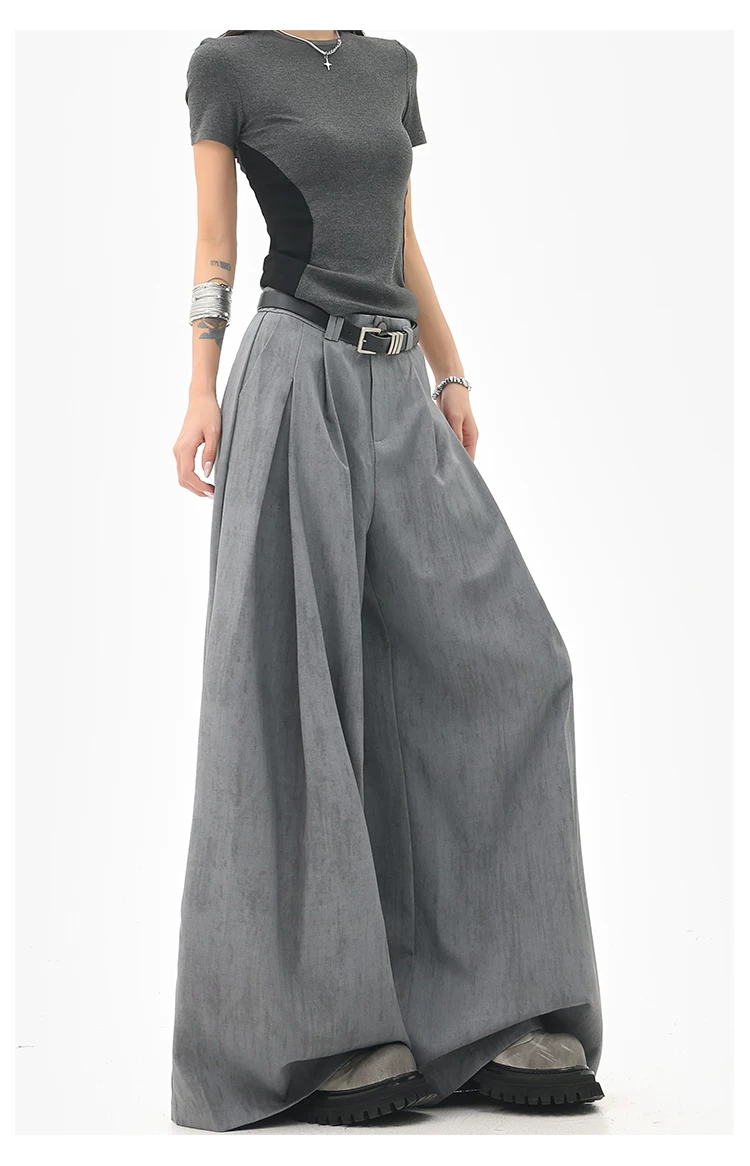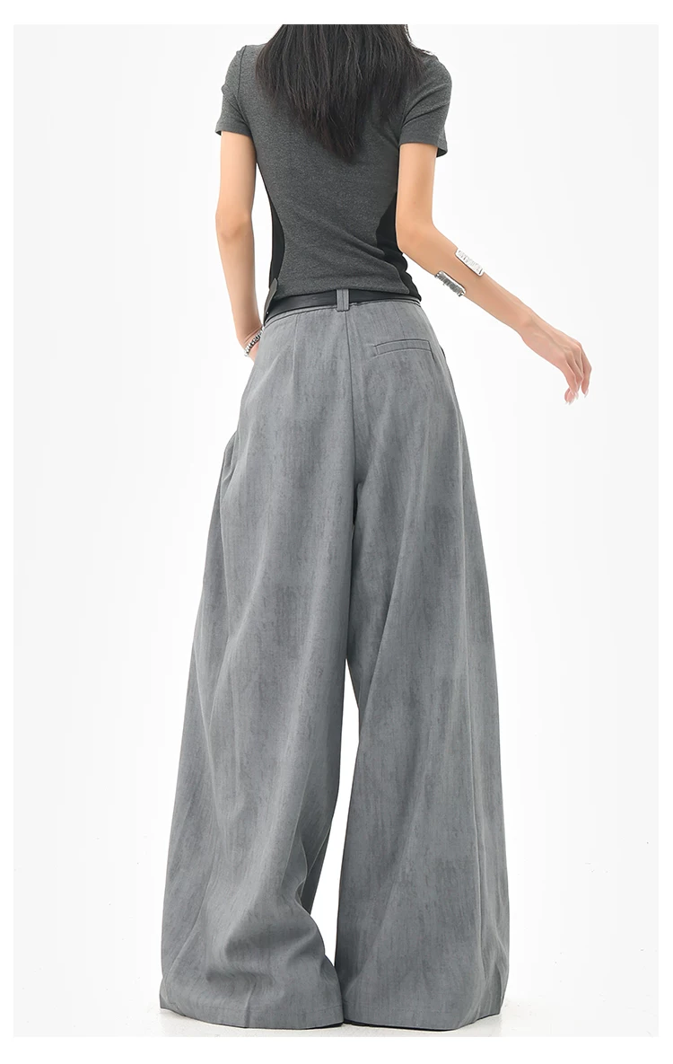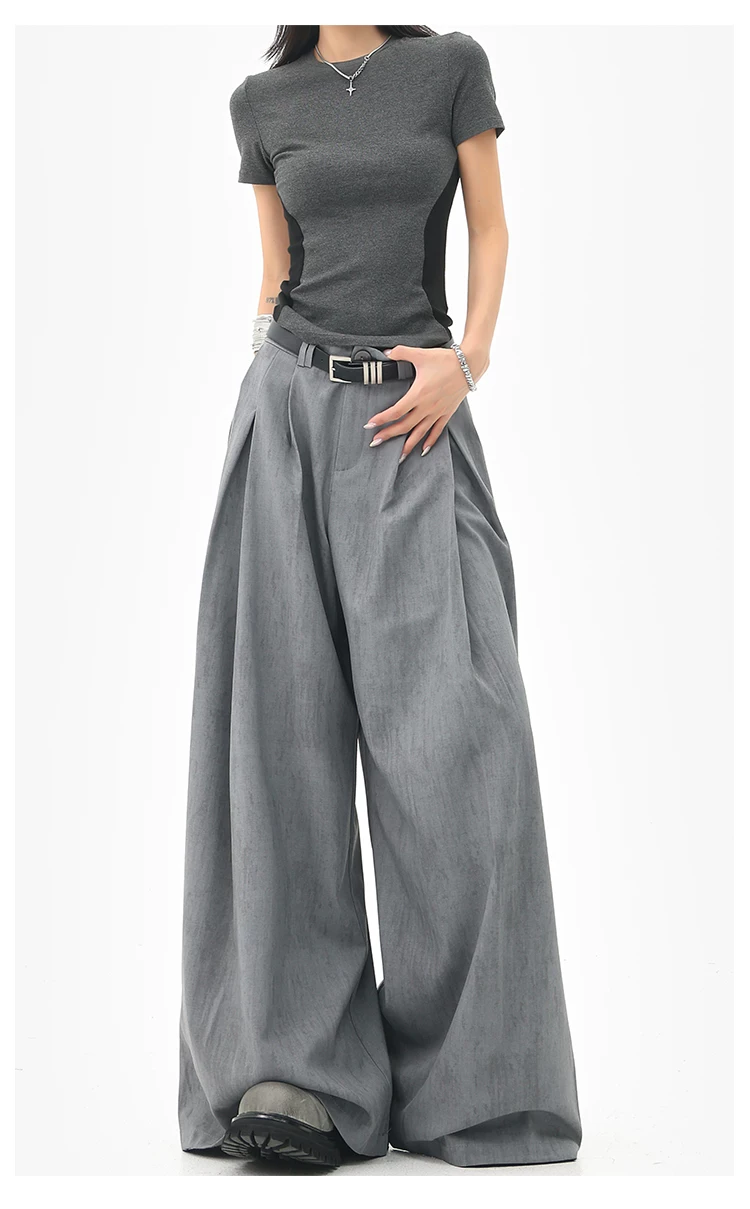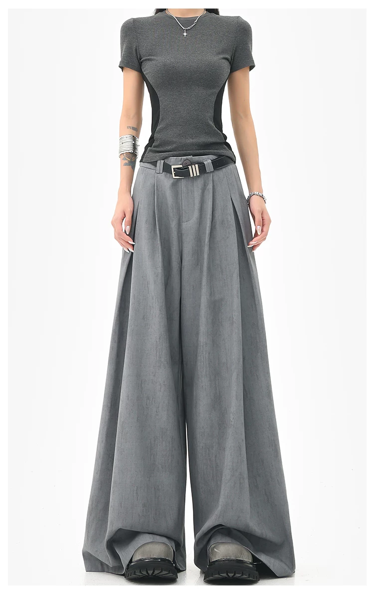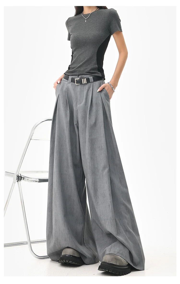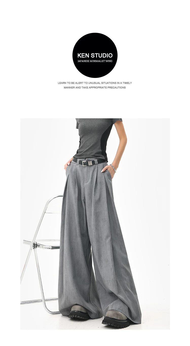 - KEN STUDIO mùa hè mới màu xám quần âu ống rộng xếp ly quần âu nữ thẳng dáng rộng quần âu quần âu thường ngày