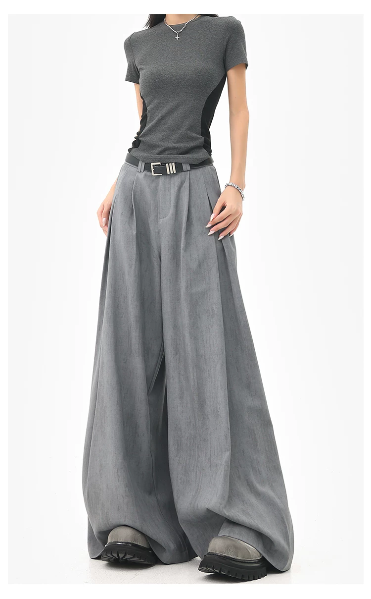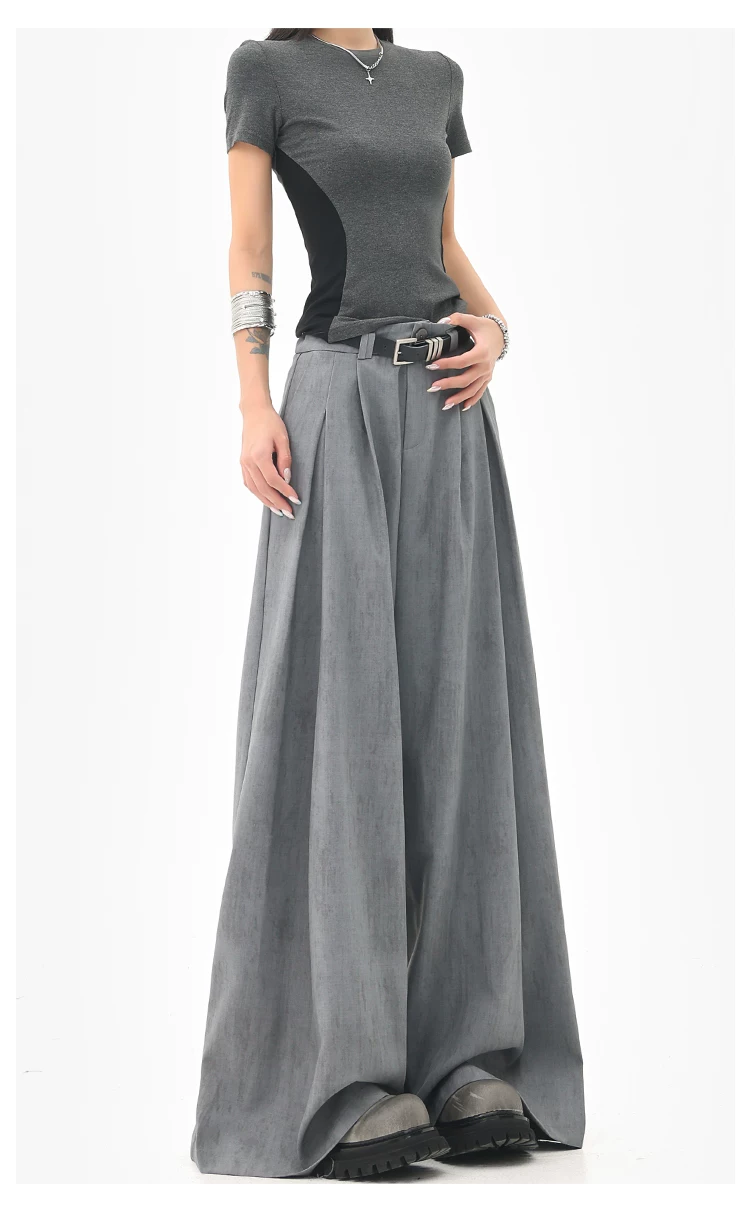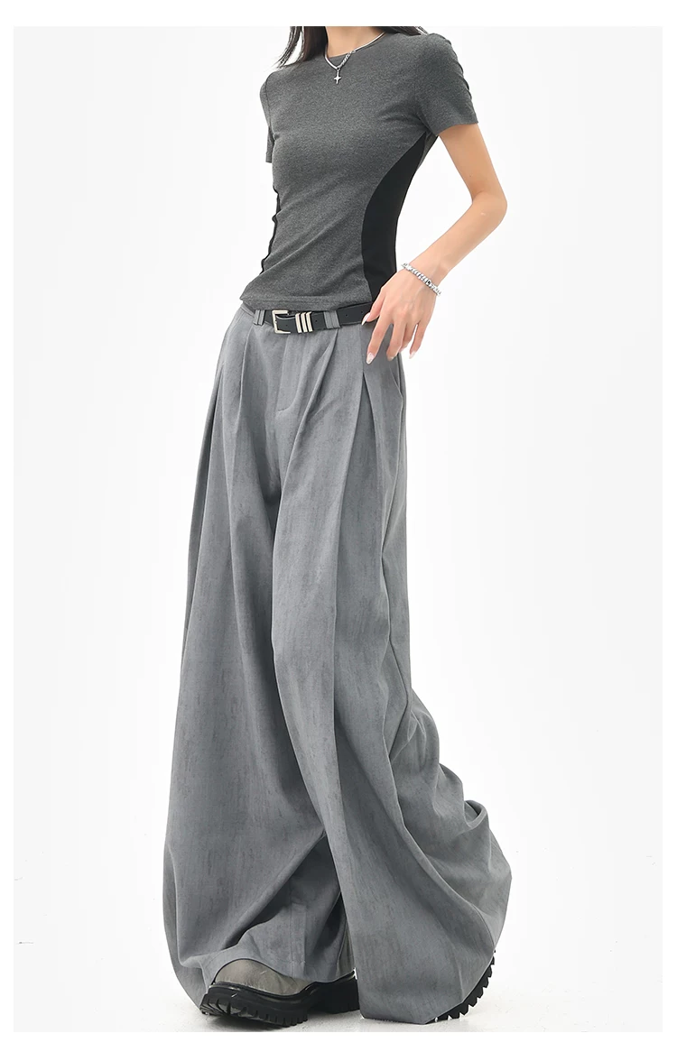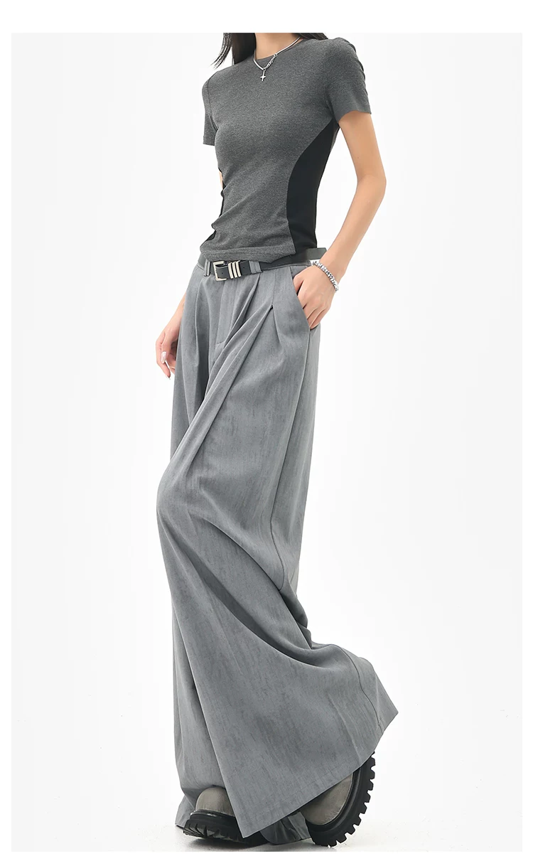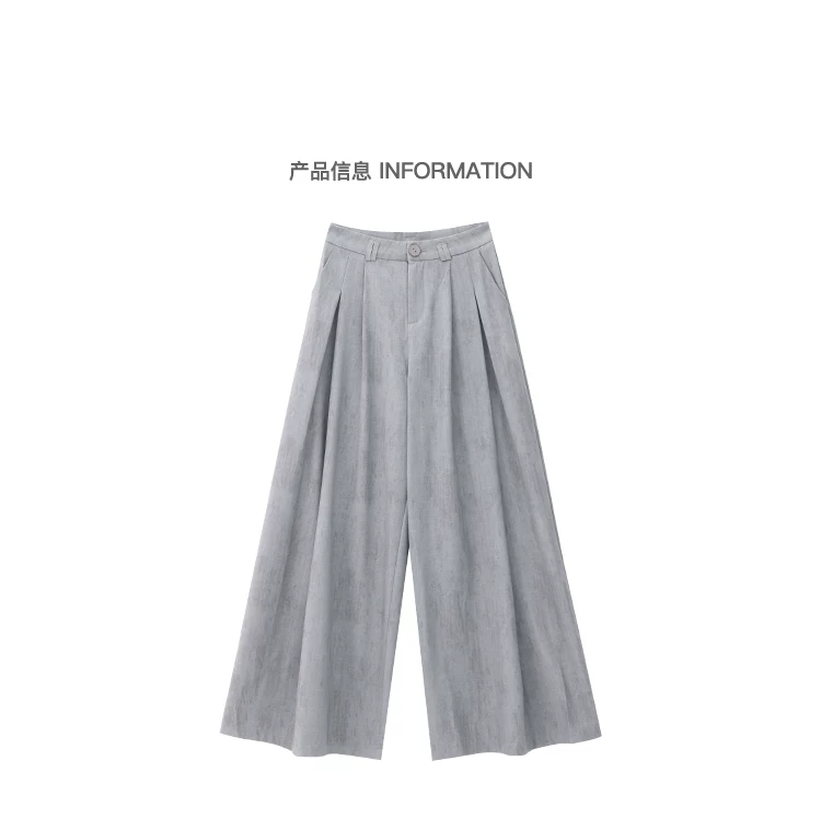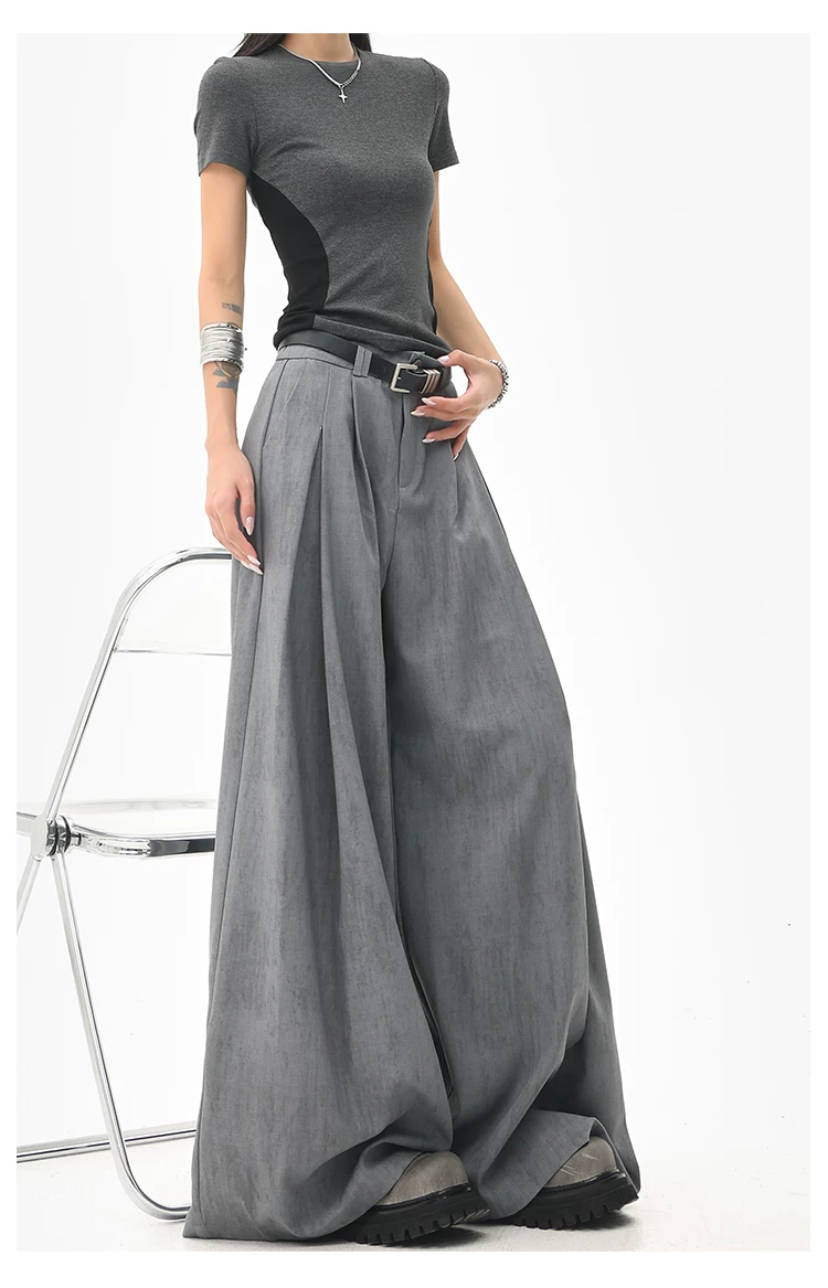 - KEN STUDIO mùa hè mới màu xám quần âu ống rộng xếp ly quần âu nữ thẳng dáng rộng quần âu quần âu thường ngày