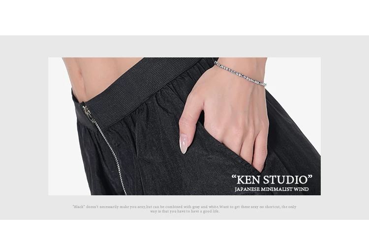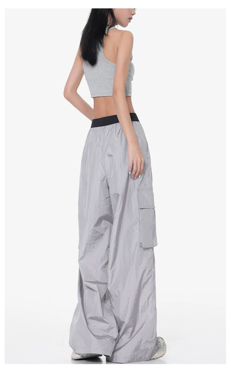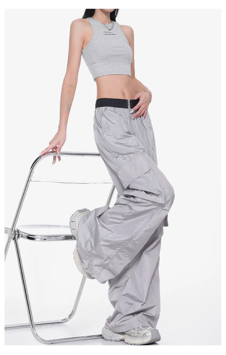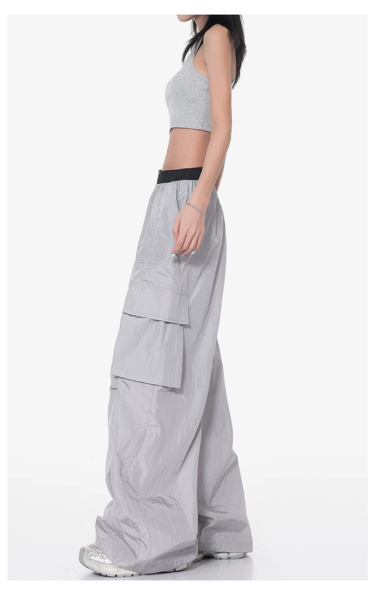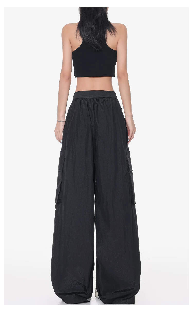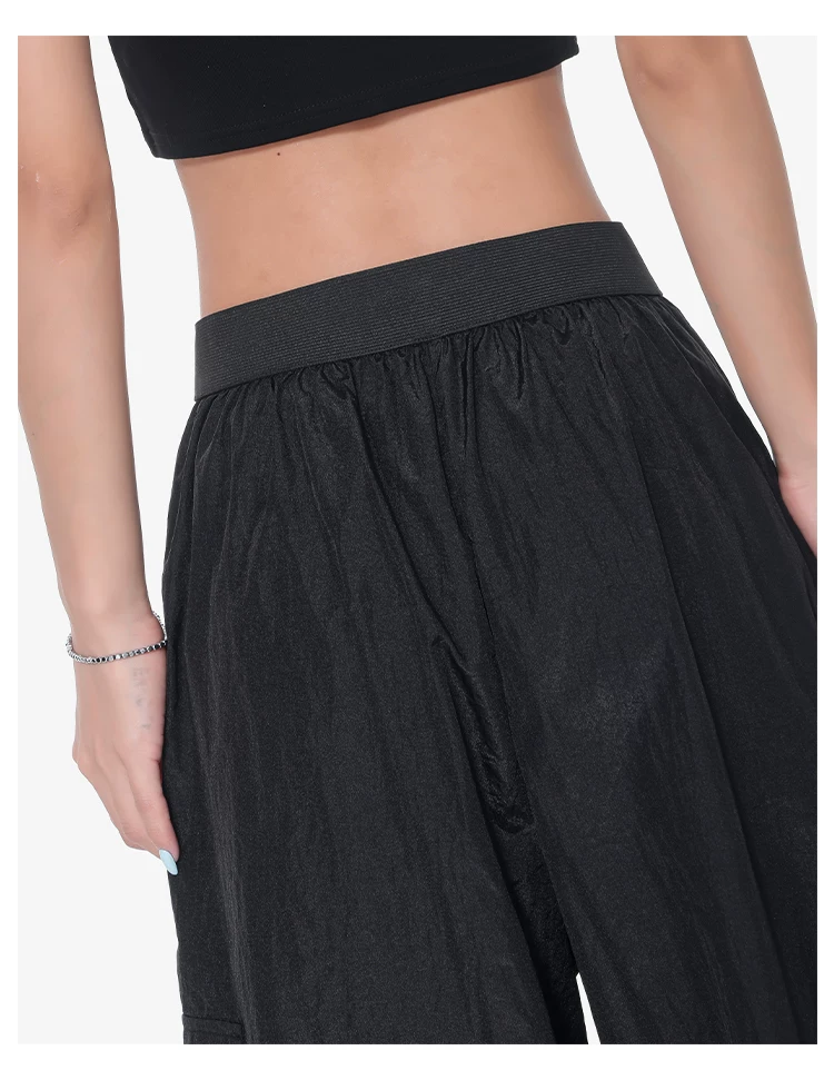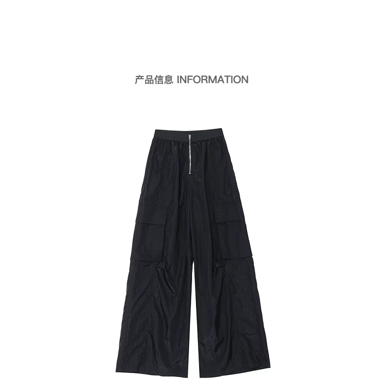 KEN STUDIO mùa hè mới quần cargo mỏng màu đen dành cho nữ có lưng thun, quần ống rộng, quần ống rộng lưng cao, quần thường ngày rộng rãi