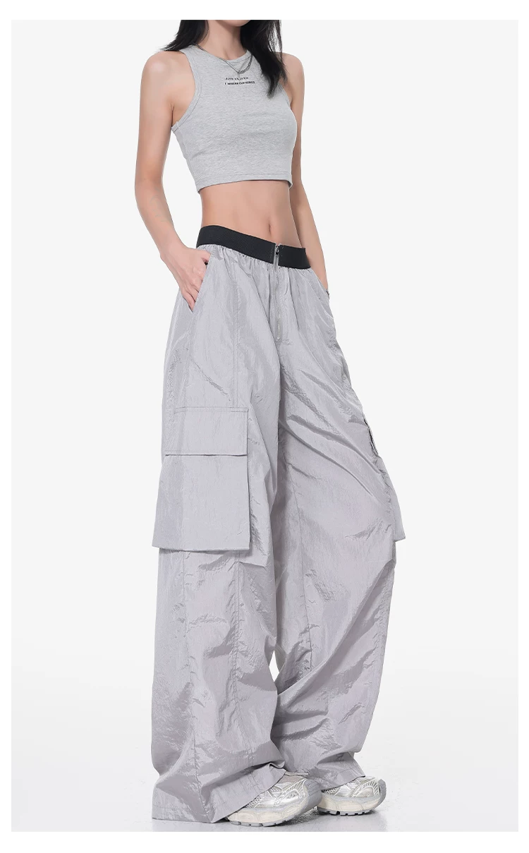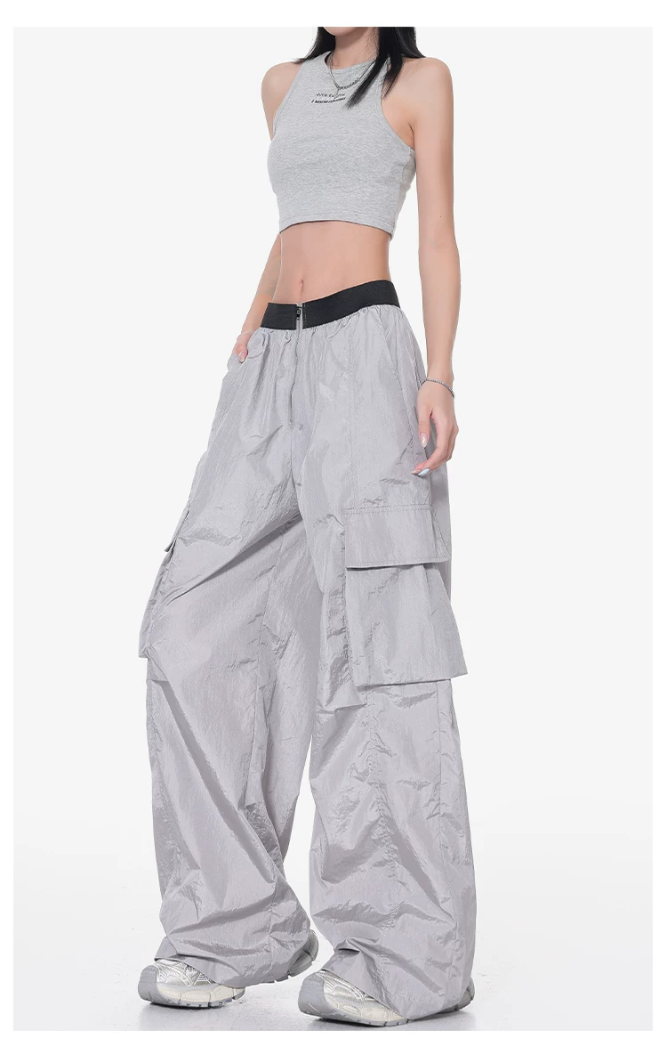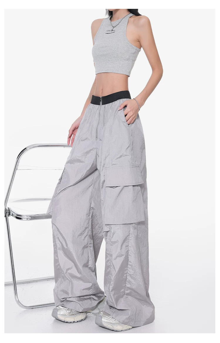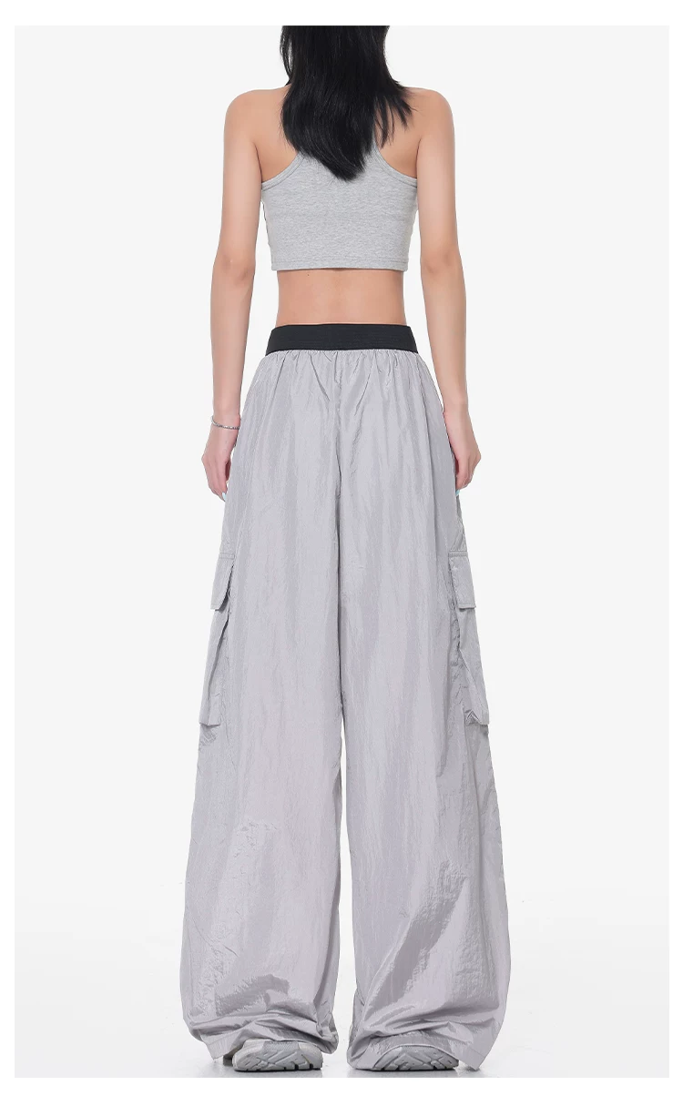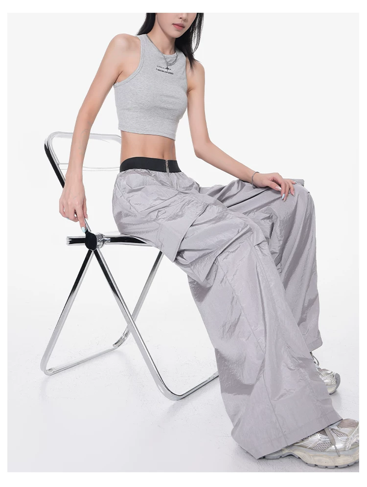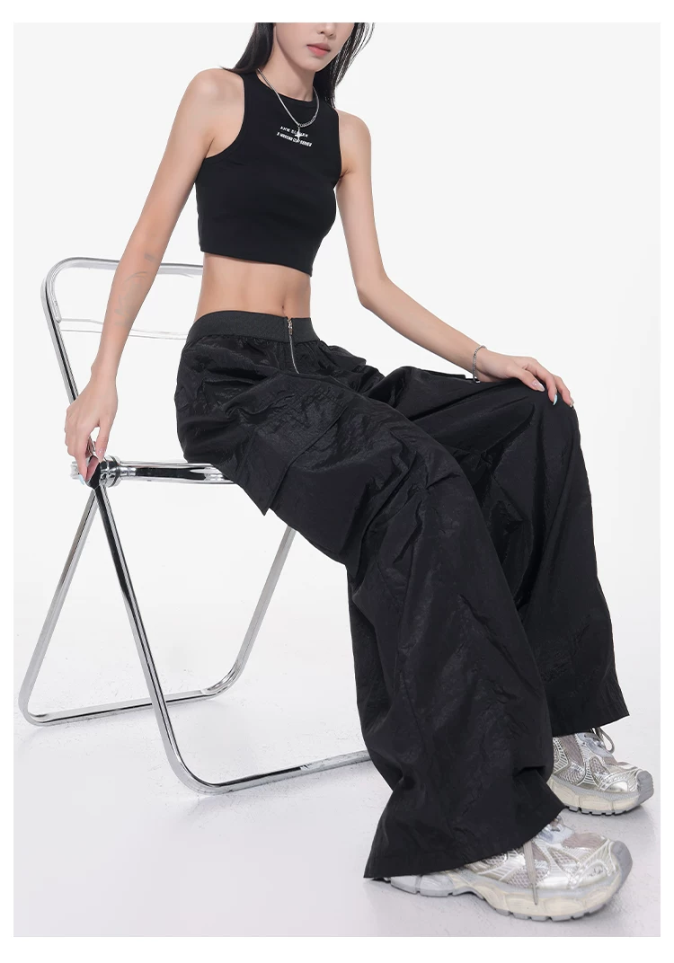 KEN STUDIO mùa hè mới quần cargo mỏng màu đen dành cho nữ có lưng thun, quần ống rộng, quần ống rộng lưng cao, quần thường ngày rộng rãi