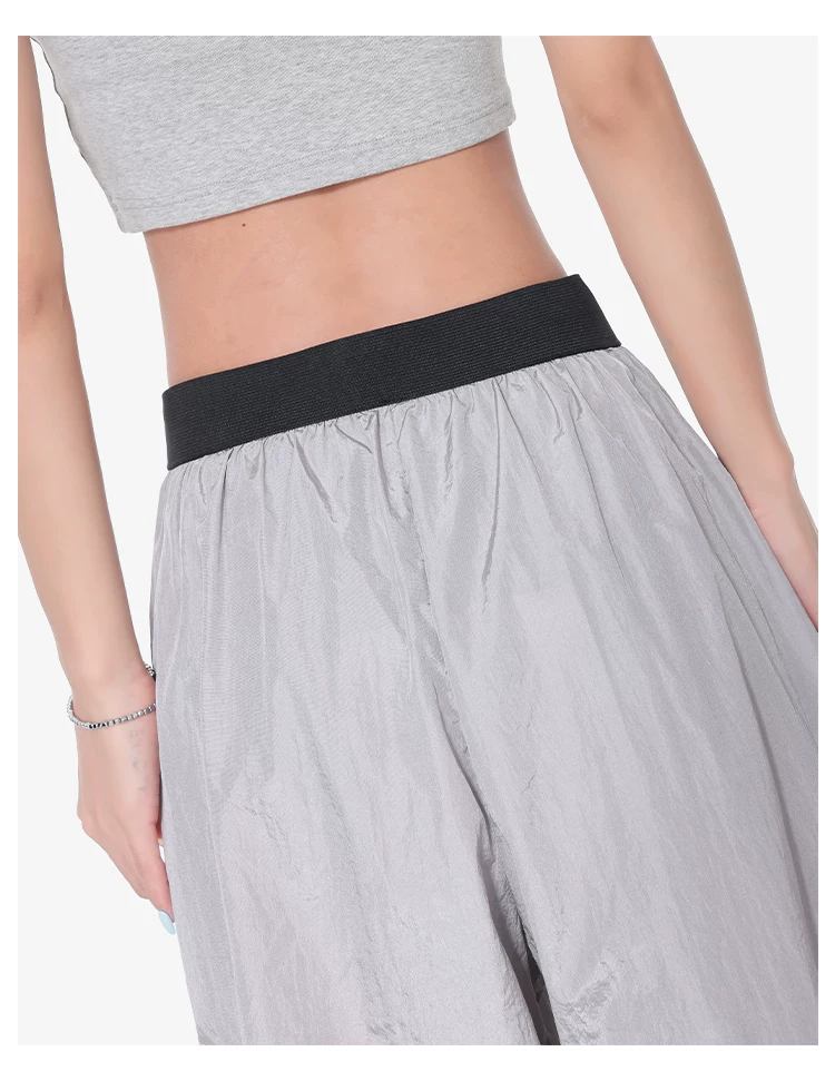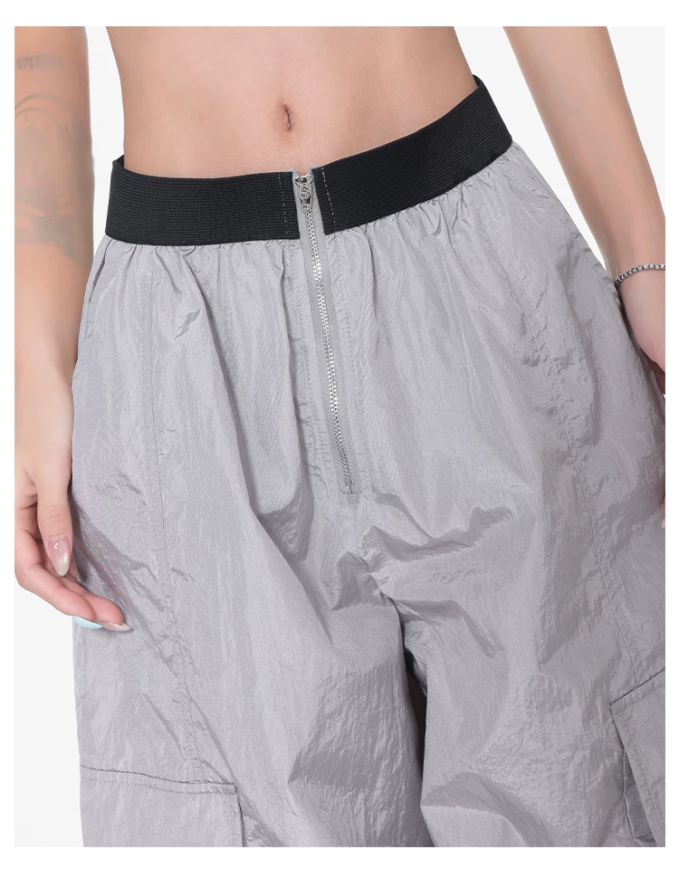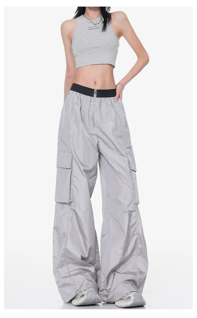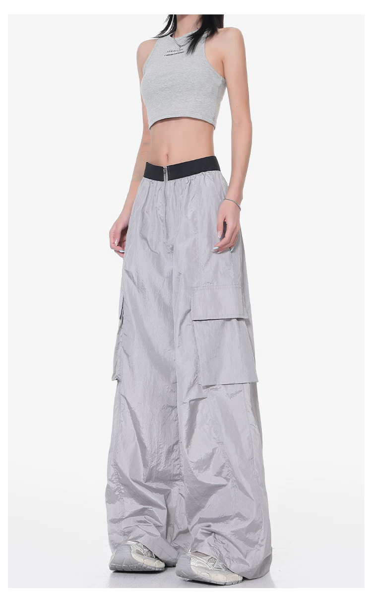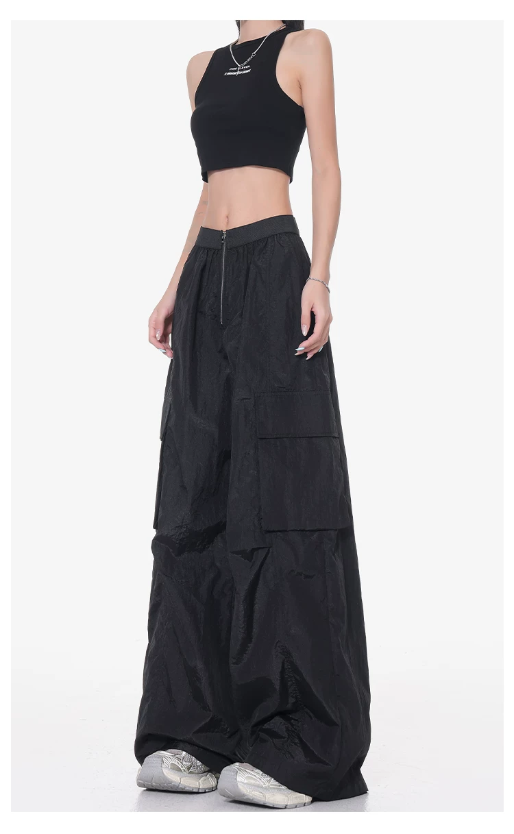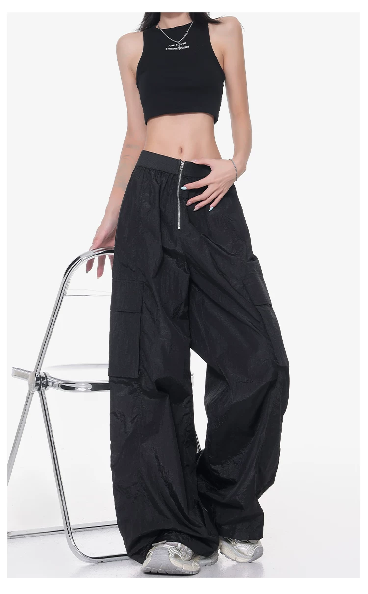 KEN STUDIO mùa hè mới quần cargo mỏng màu đen dành cho nữ có lưng thun, quần ống rộng, quần ống rộng lưng cao, quần thường ngày rộng rãi