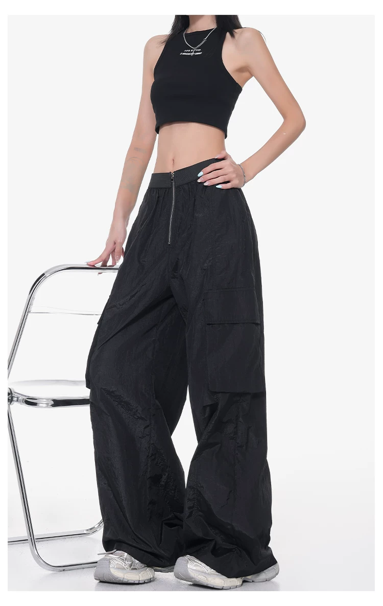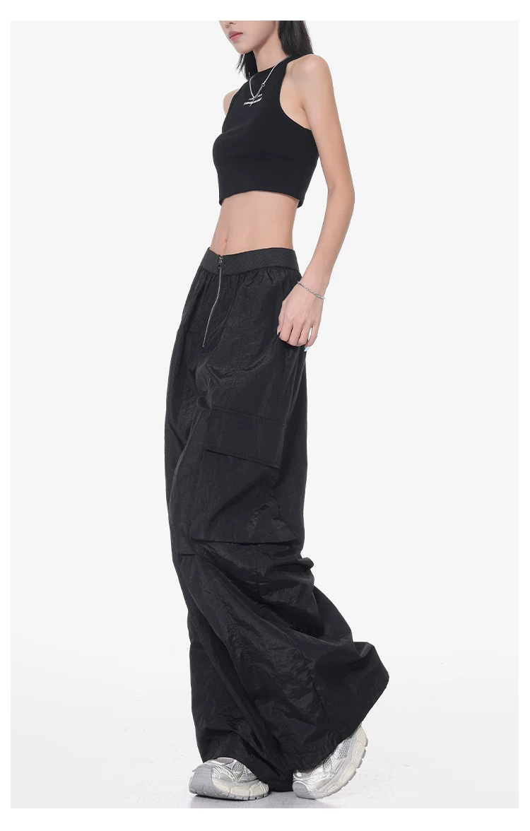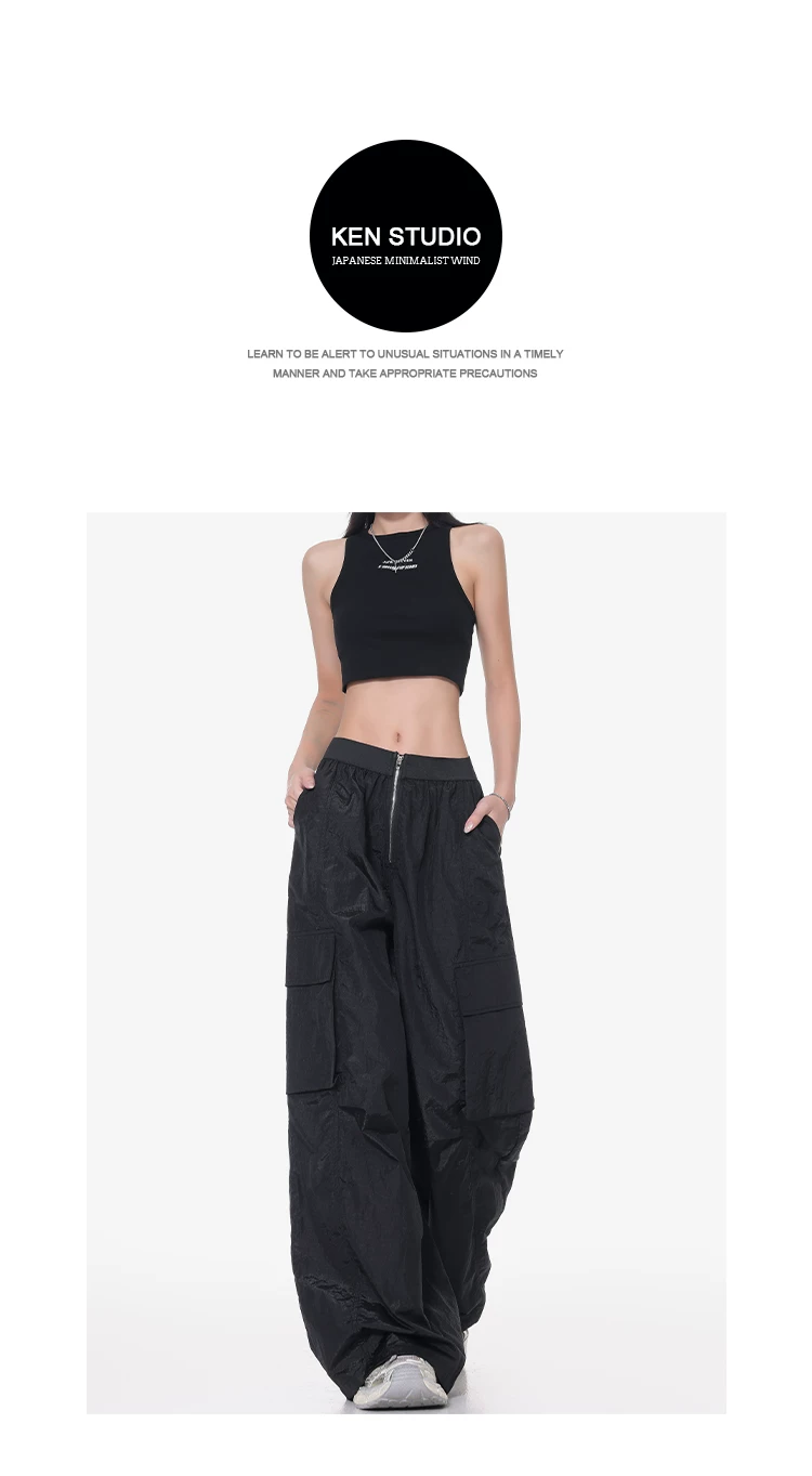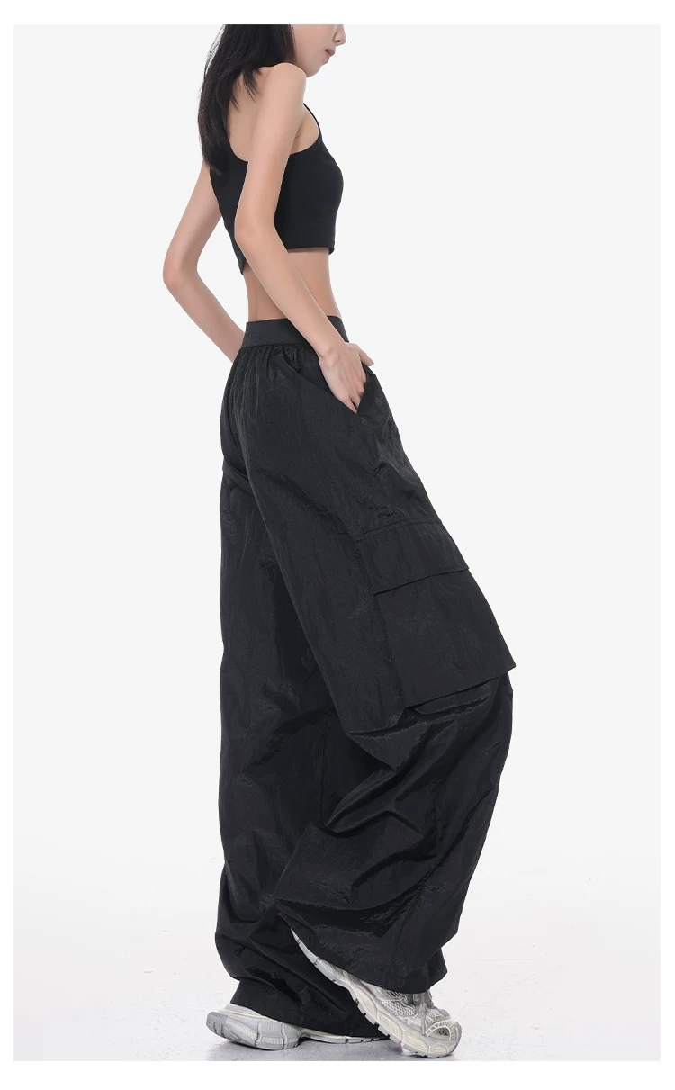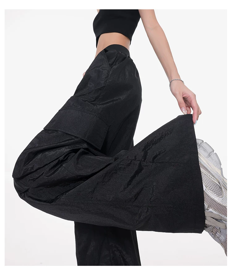 - KEN STUDIO mùa hè mới quần cargo mỏng màu đen dành cho nữ có lưng thun, quần ống rộng, quần ống rộng lưng cao, quần thường ngày rộng rãi