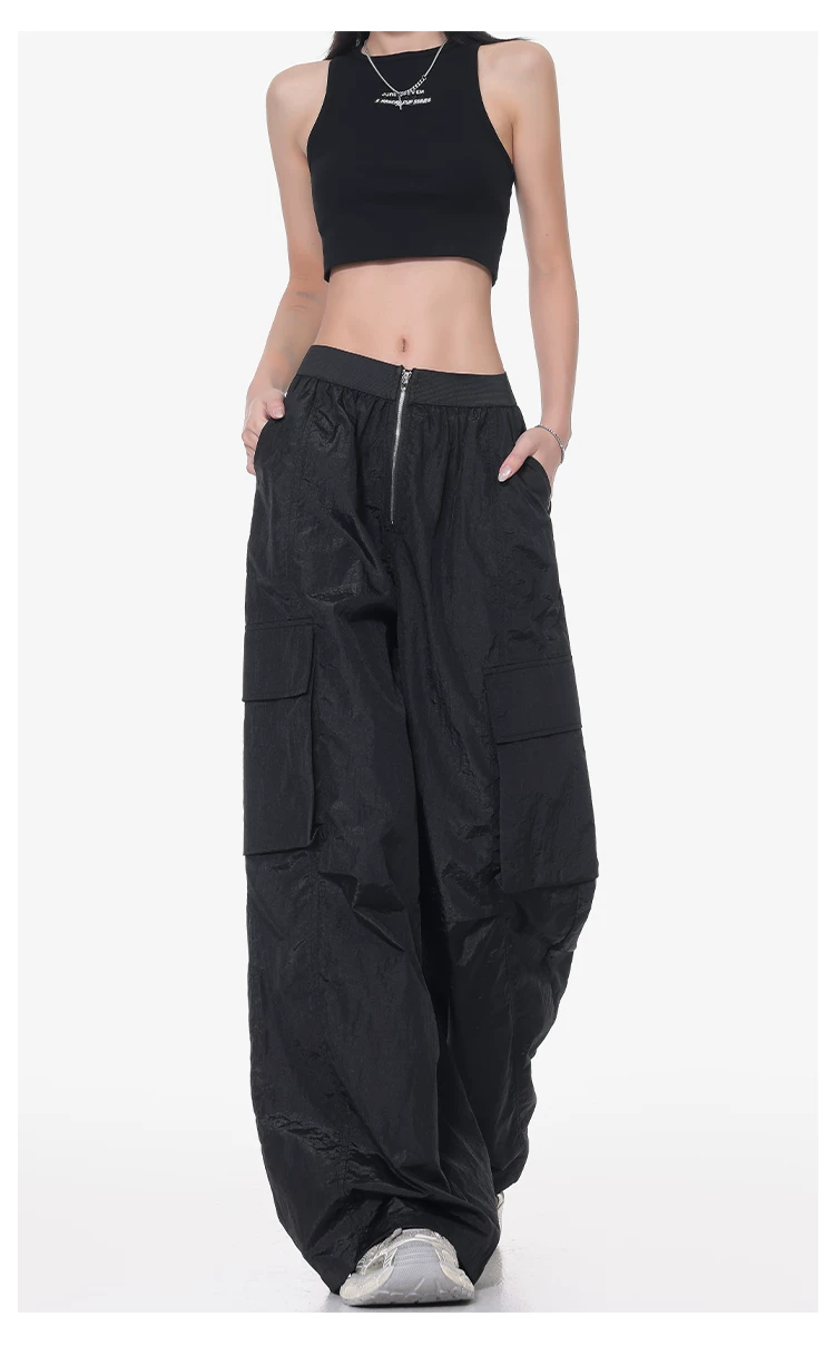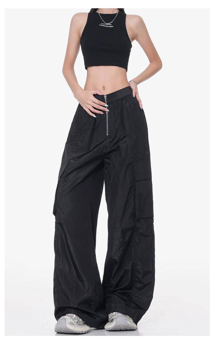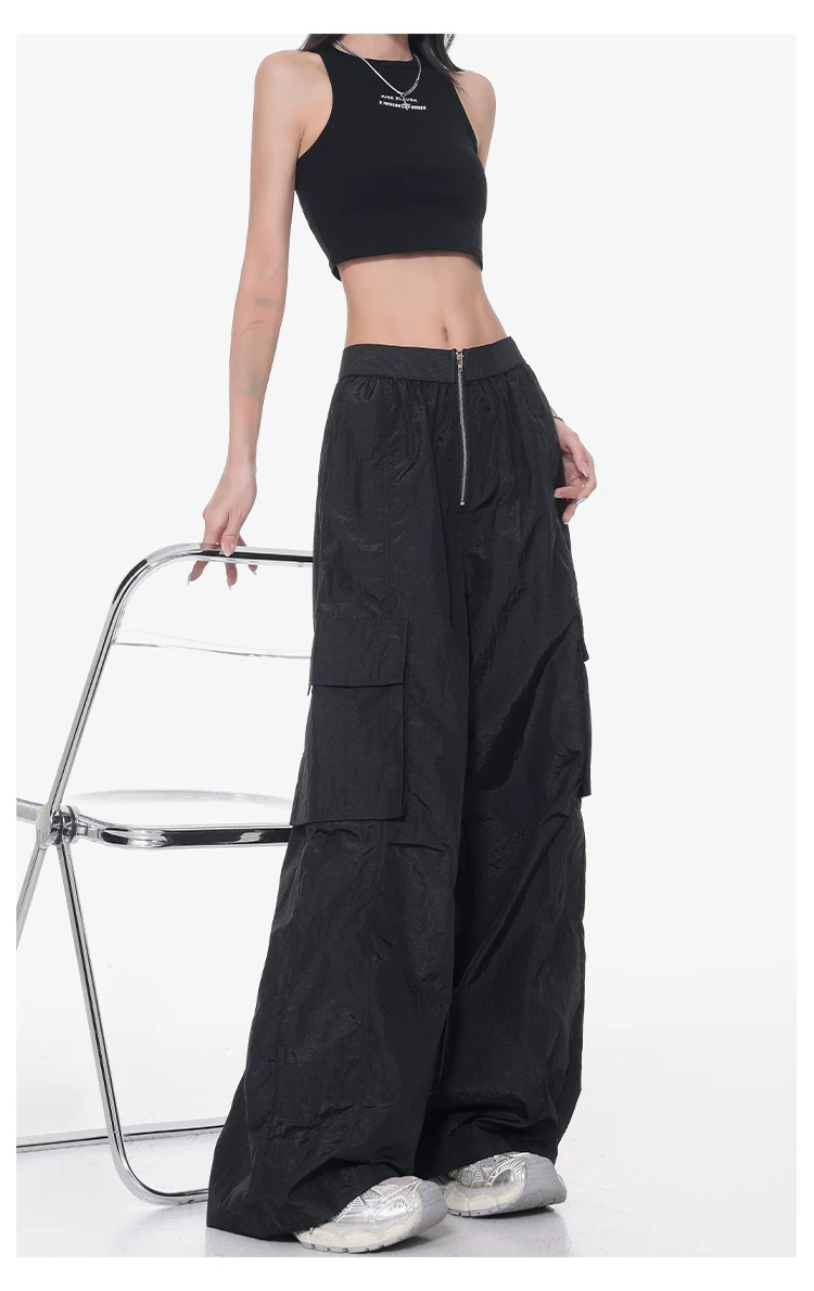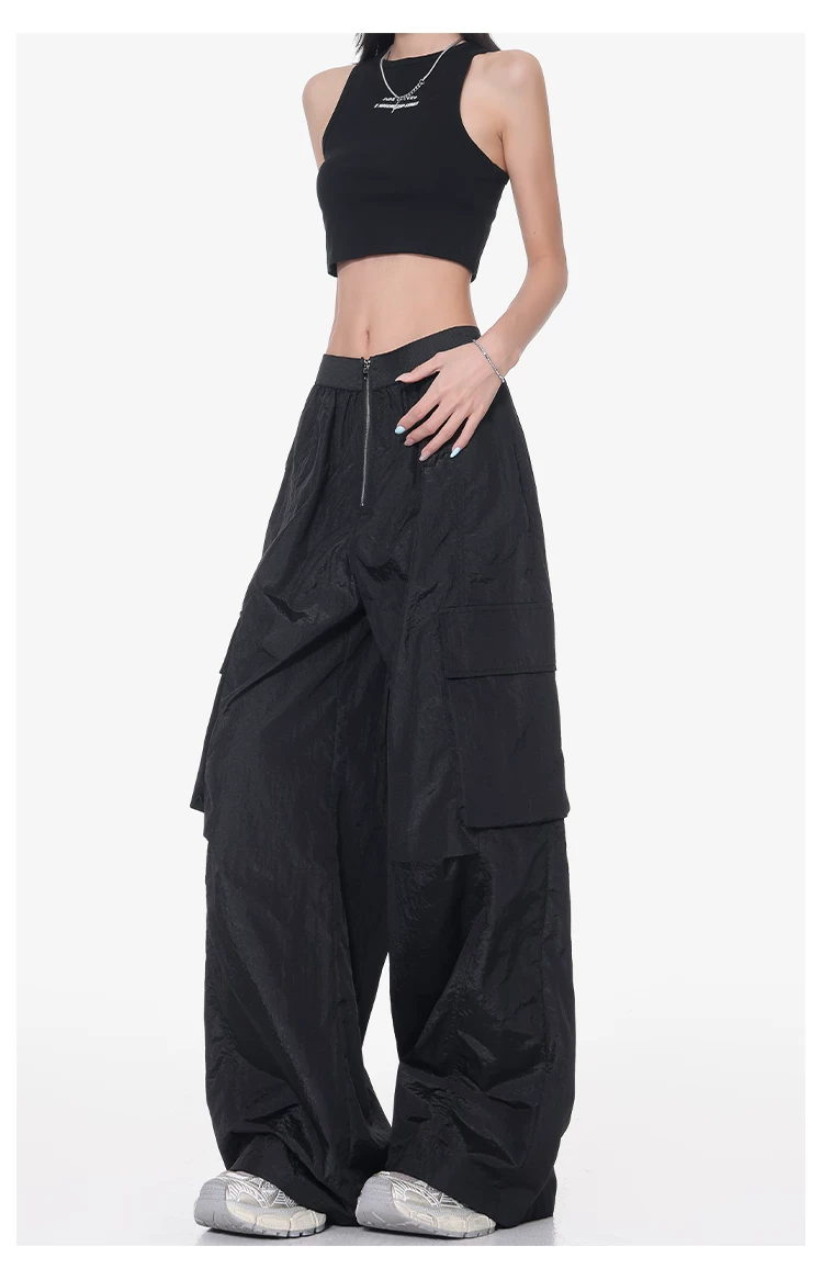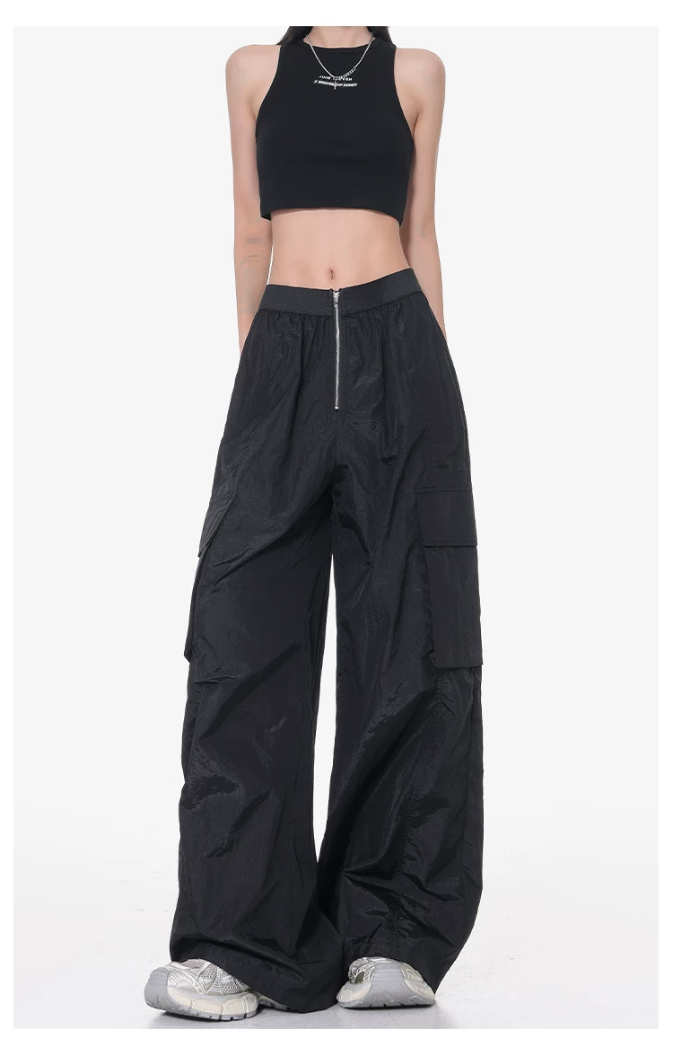 - KEN STUDIO mùa hè mới quần cargo mỏng màu đen dành cho nữ có lưng thun, quần ống rộng, quần ống rộng lưng cao, quần thường ngày rộng rãi