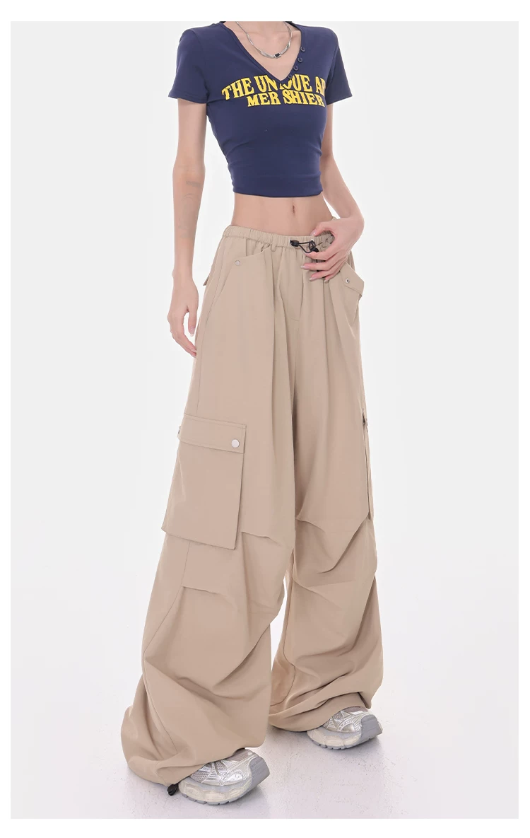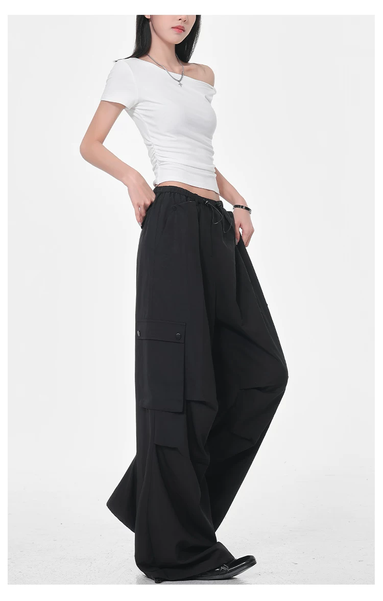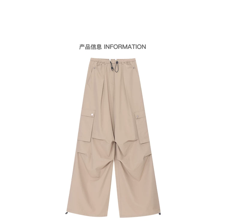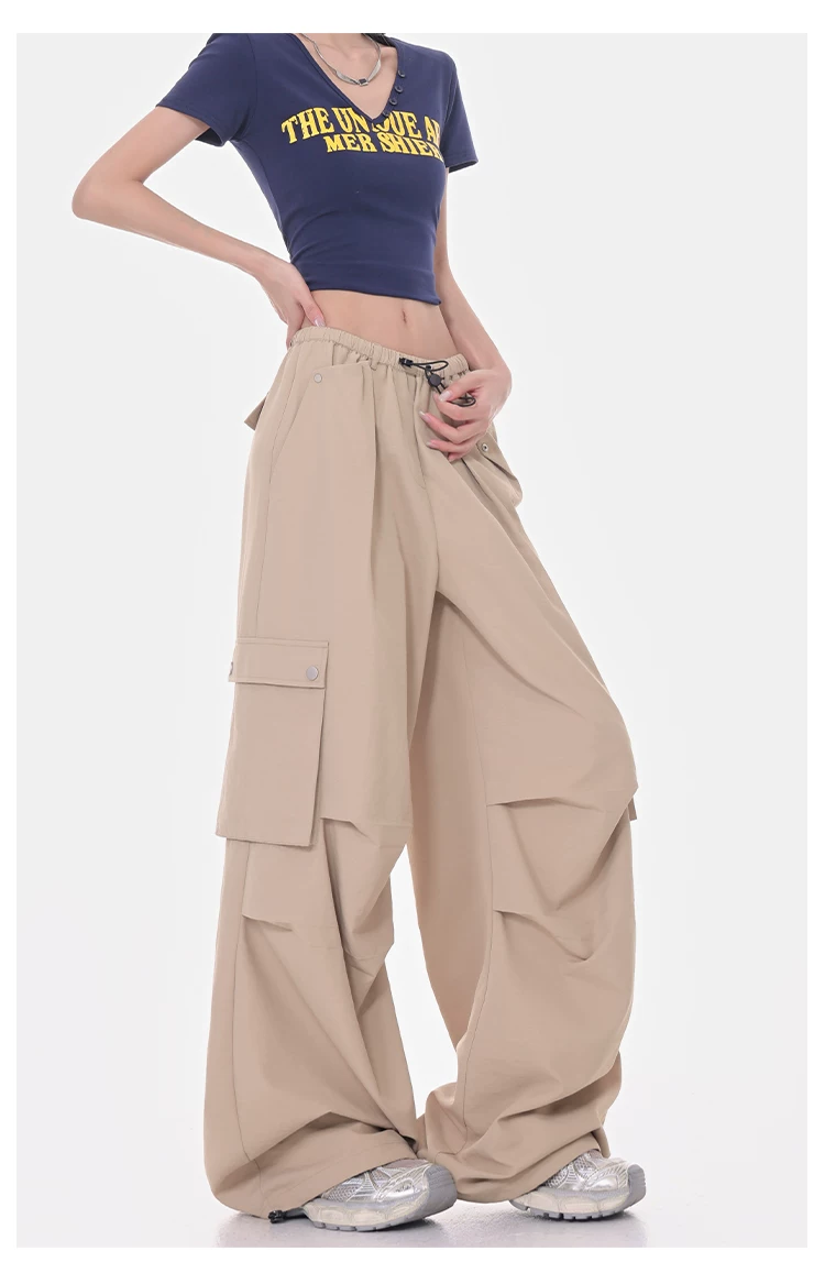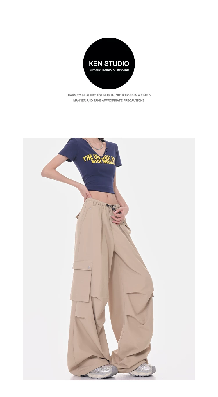 - KEN STUDIO mùa hè mới quần cargo ống rộng xếp ly theo phong cách retro Mỹ dành cho nữ, quần jogger ống thẳng dài đến sàn kiểu lính dù