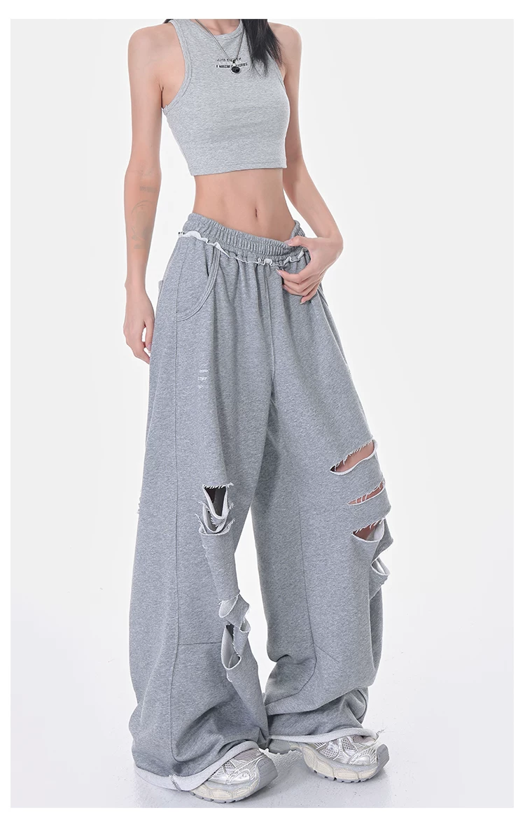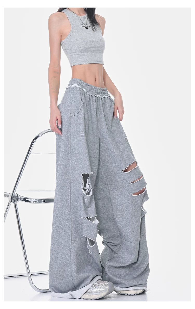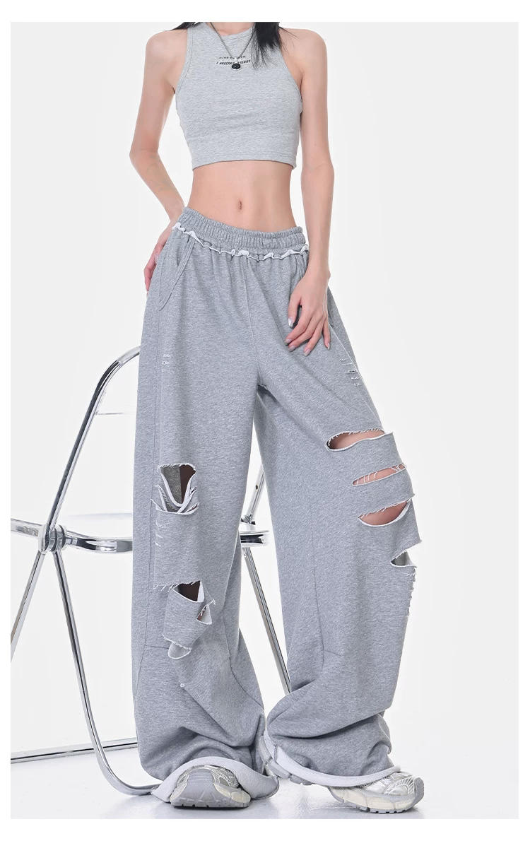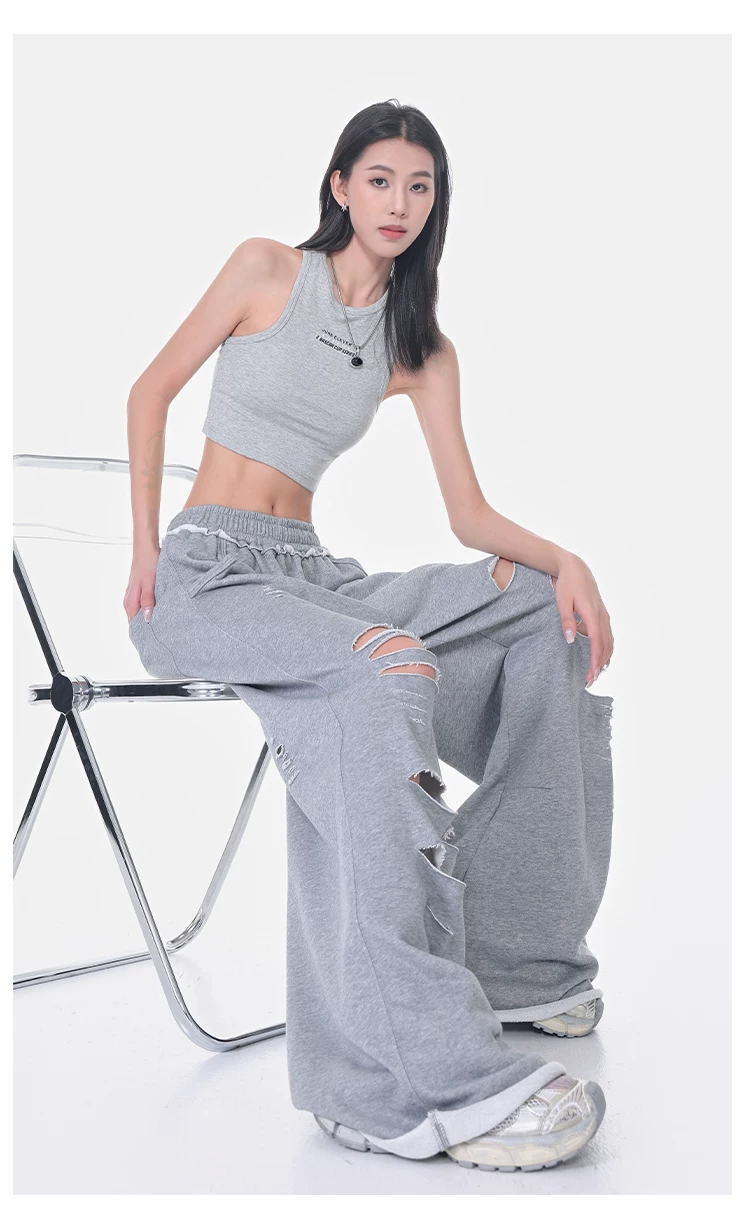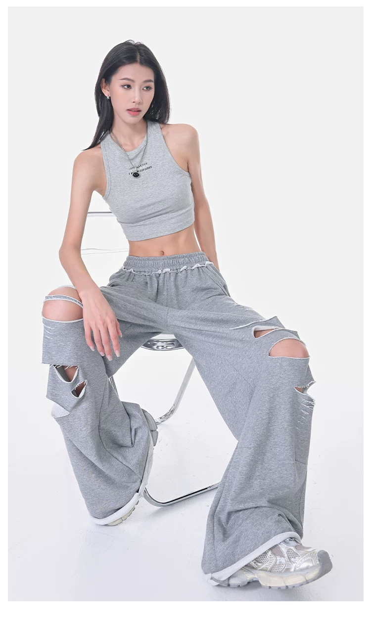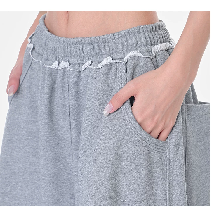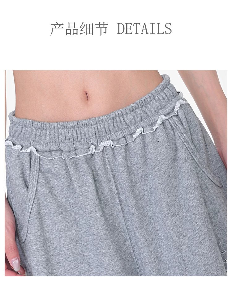 - KEN STUDIO mùa hè phong cách mới quần thể thao xẻ tà màu xám quần thể thao dáng rộng lưng cao quần ống rộng cho nữ