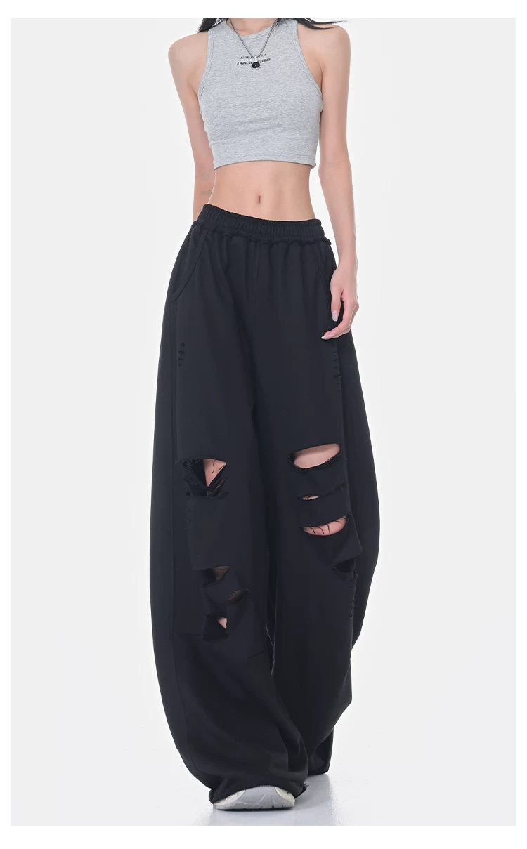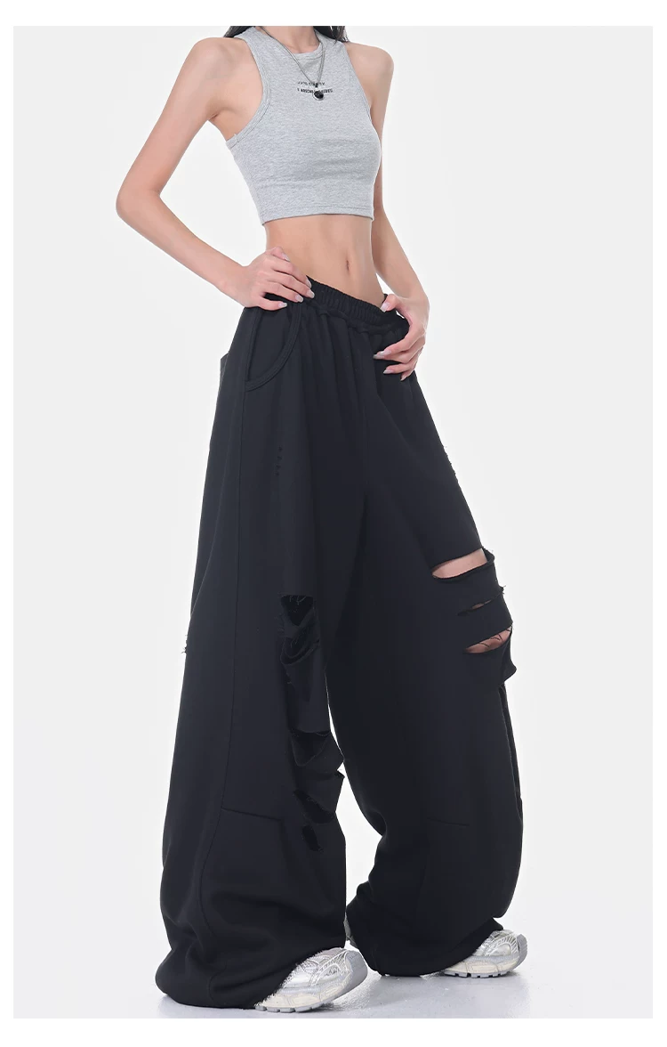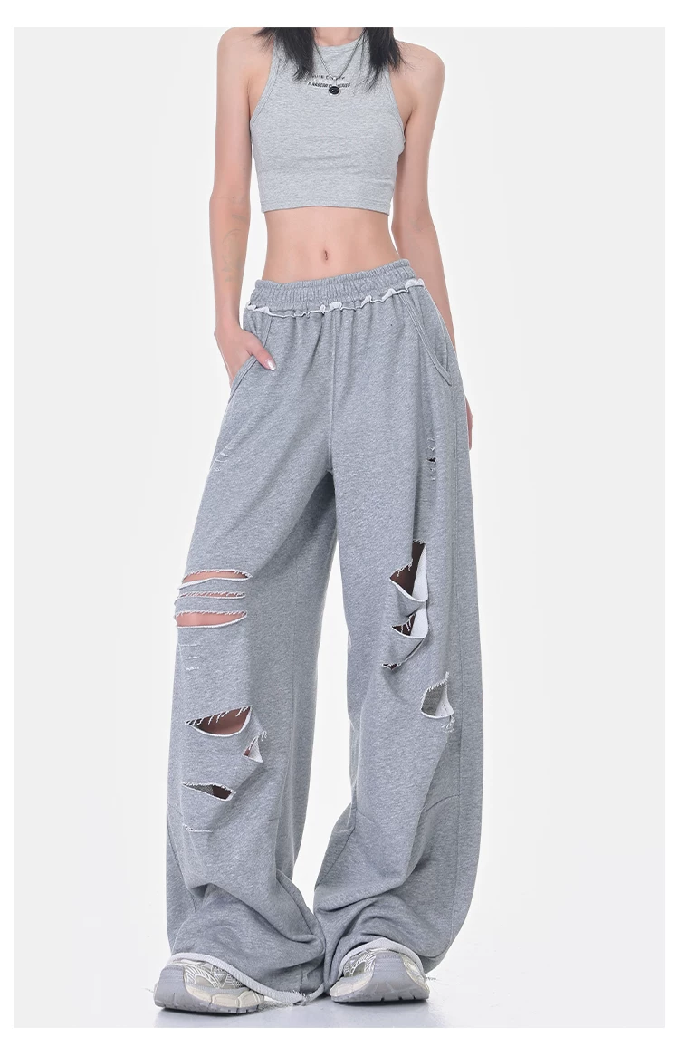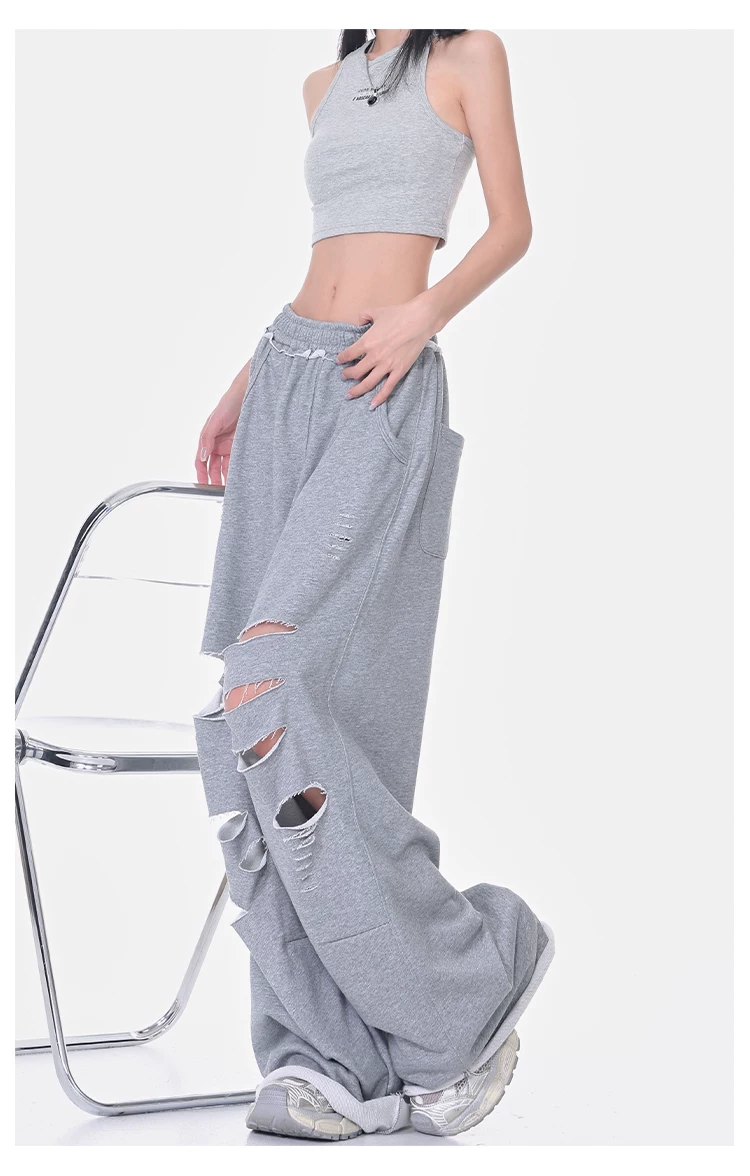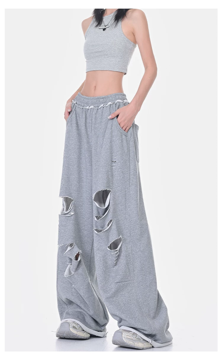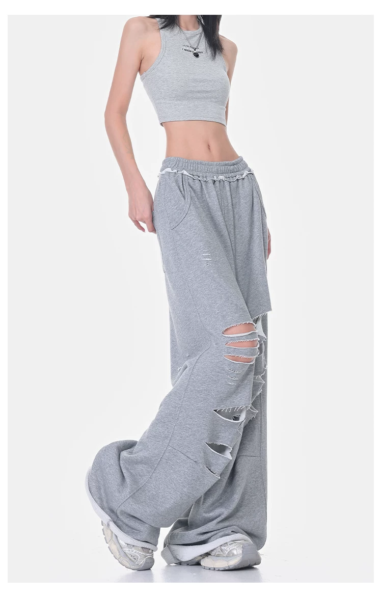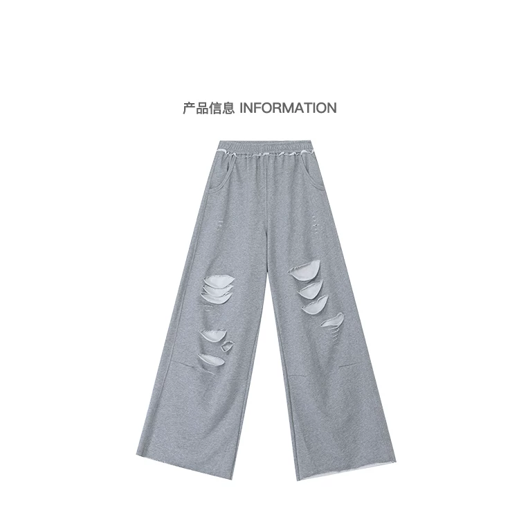 - KEN STUDIO mùa hè phong cách mới quần thể thao xẻ tà màu xám quần thể thao dáng rộng lưng cao quần ống rộng cho nữ