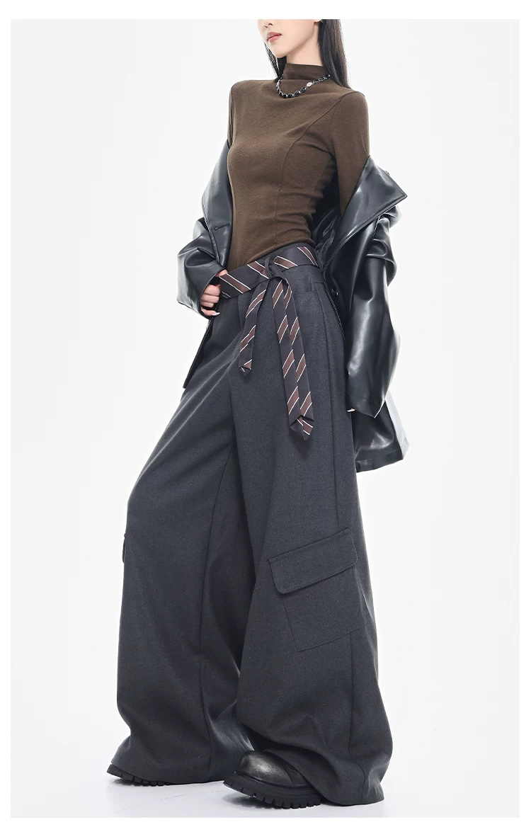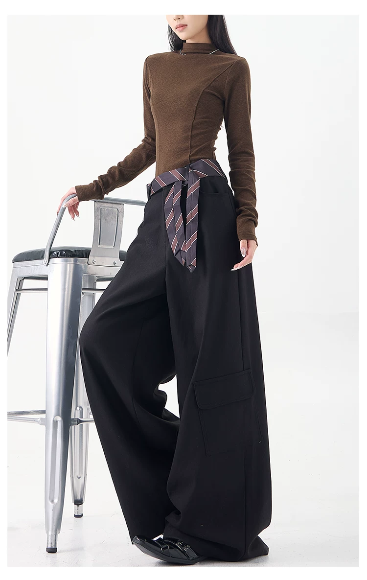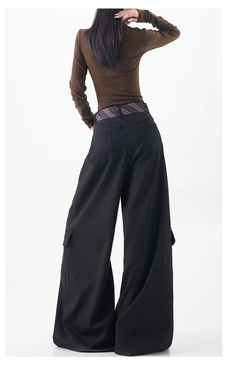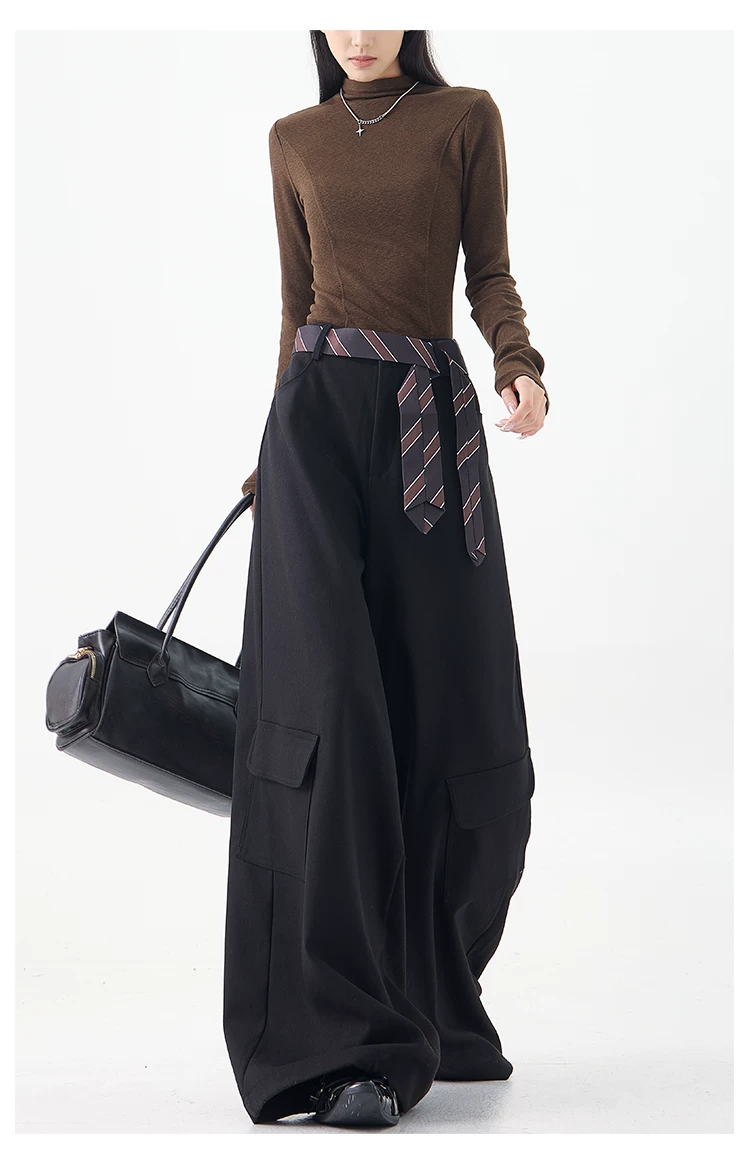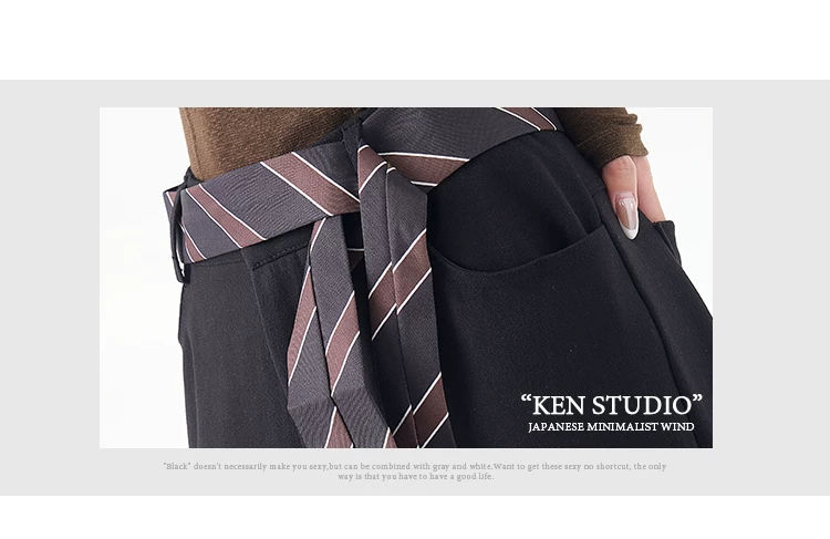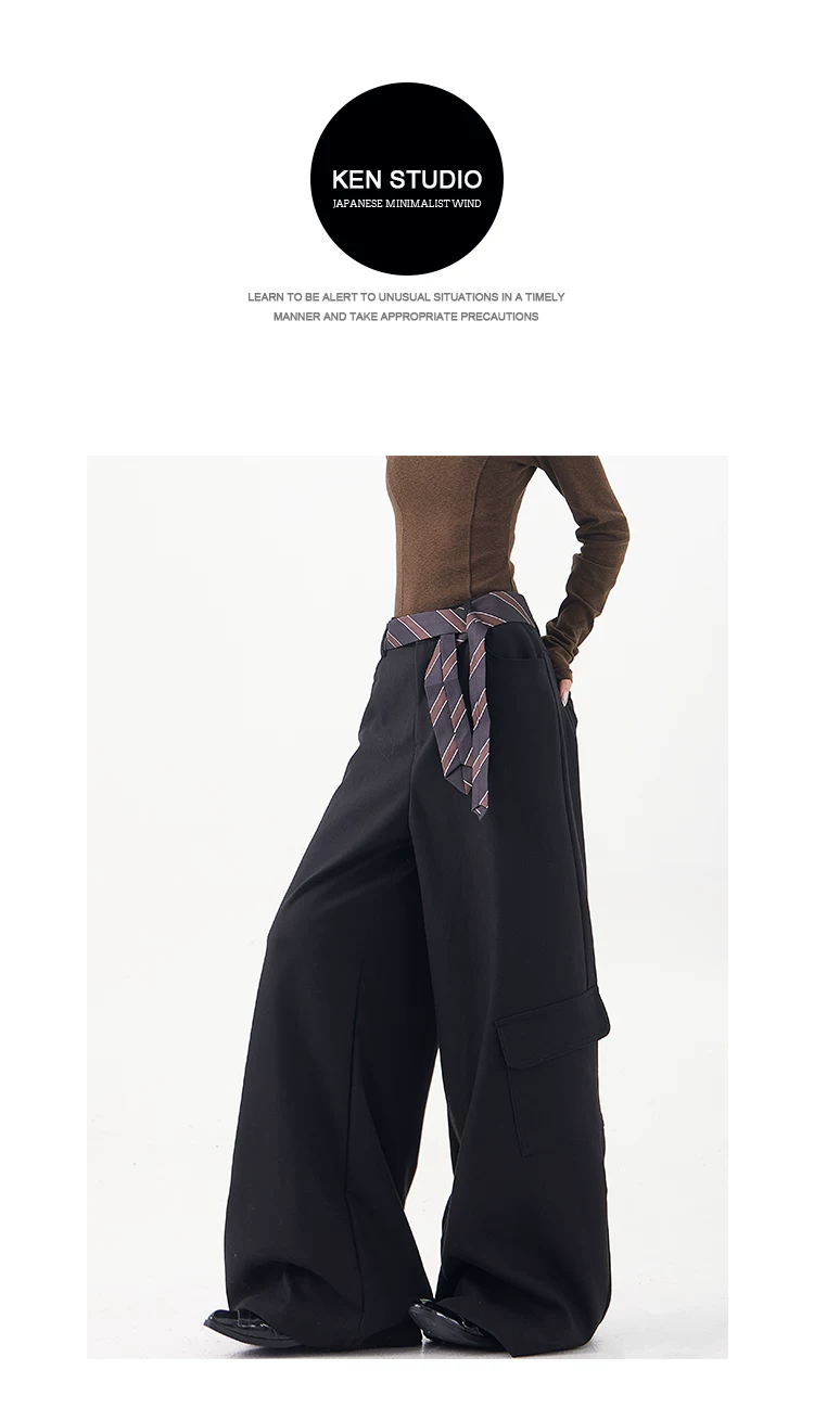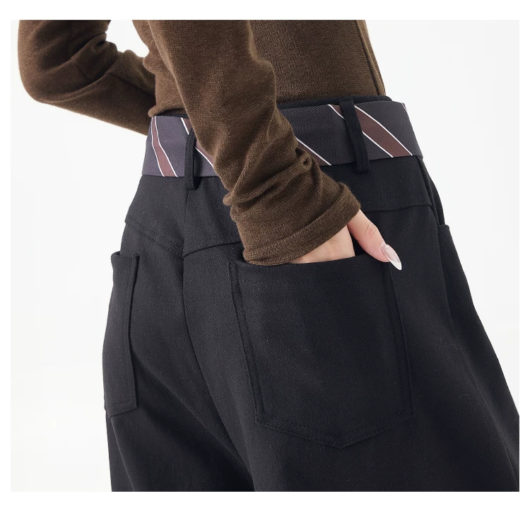 - KEN STUDIO mùa thu đông mới màu đen dày dặn quần âu thường ngày dành cho nữ quần ống rộng lưng cao thẳng dáng rộng