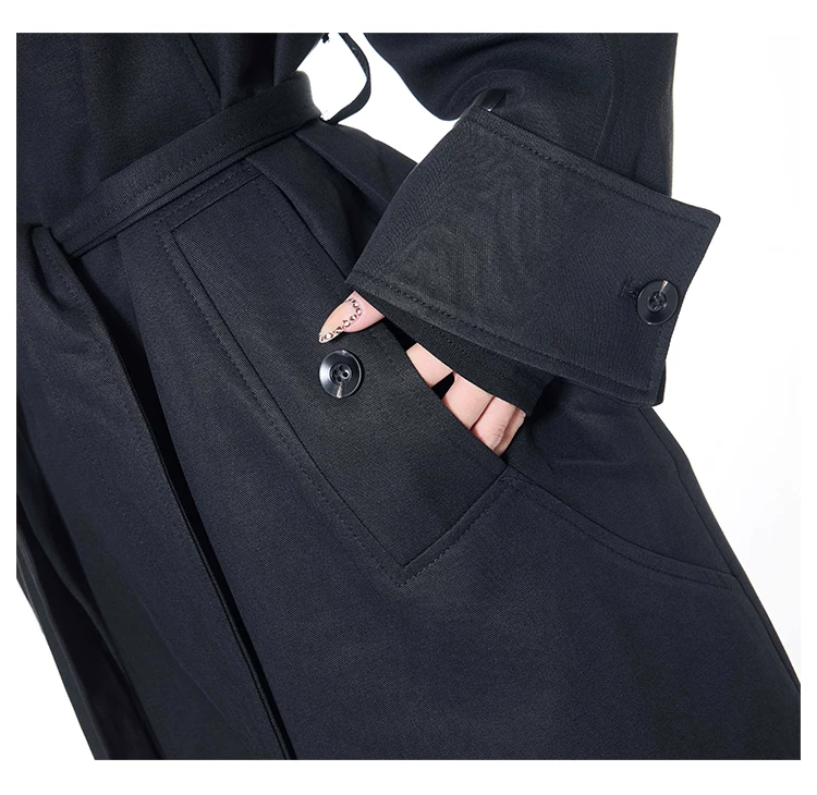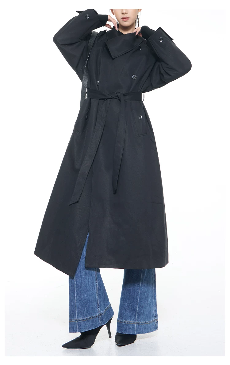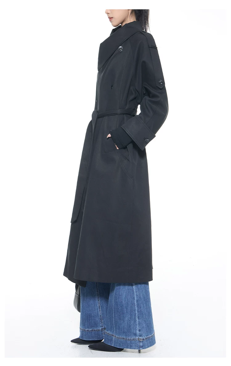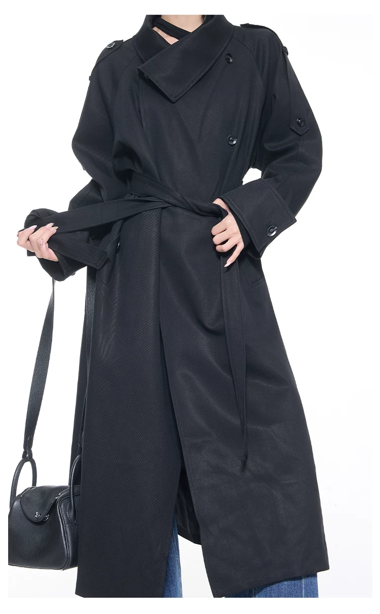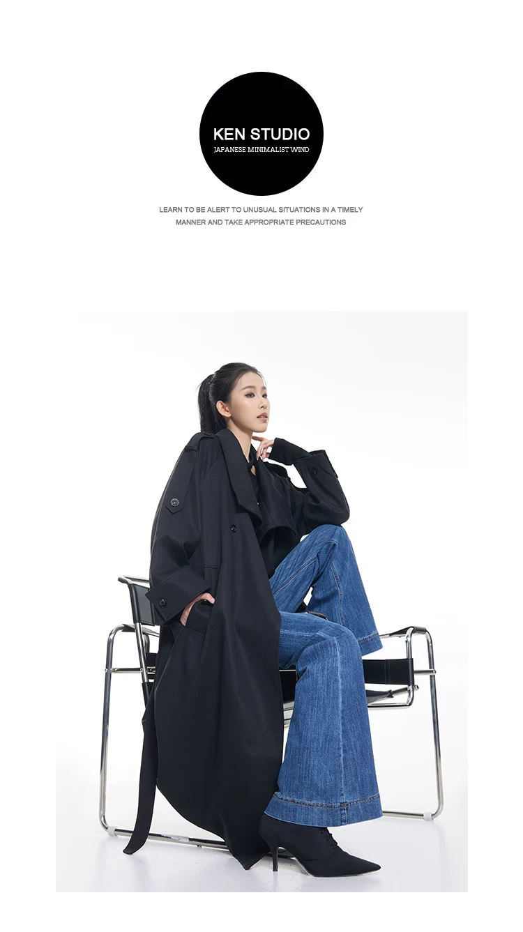 KEN STUDIO mùa thu đông mới phong cách Anh quốc áo khoác dài có ve áo màu đen dành cho nữ áo khoác dáng rộng dài vừa phải