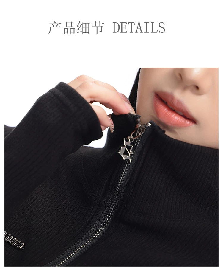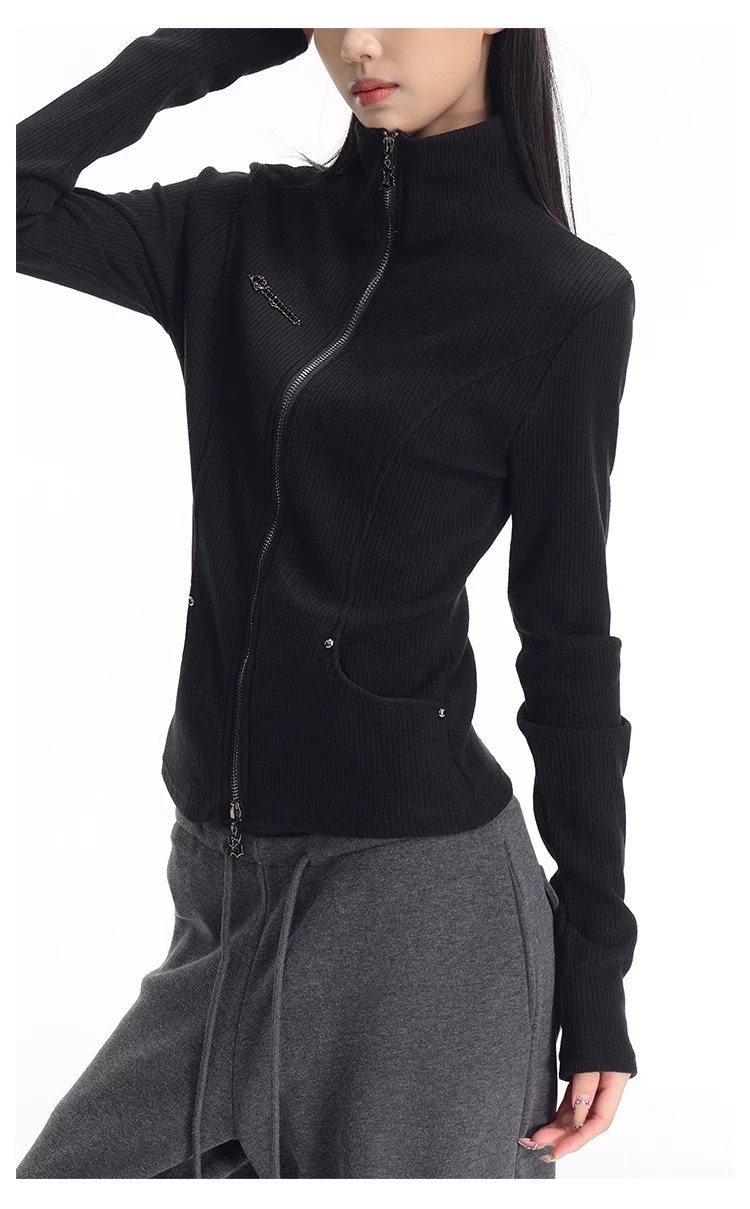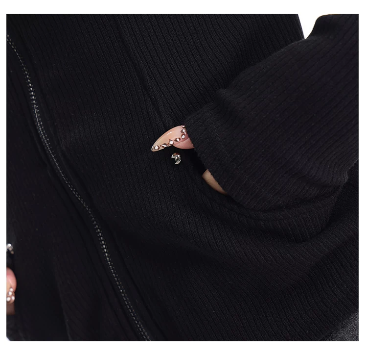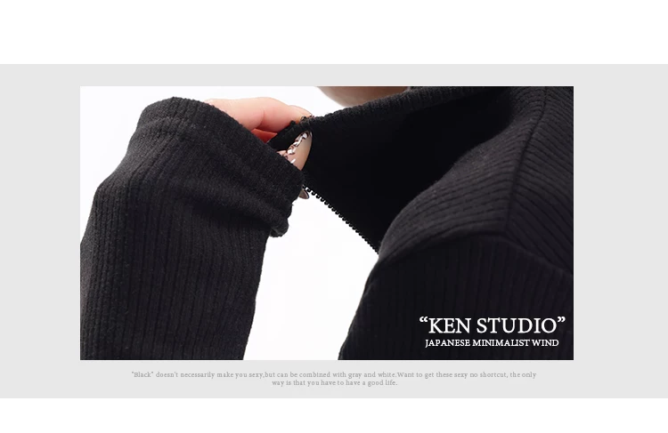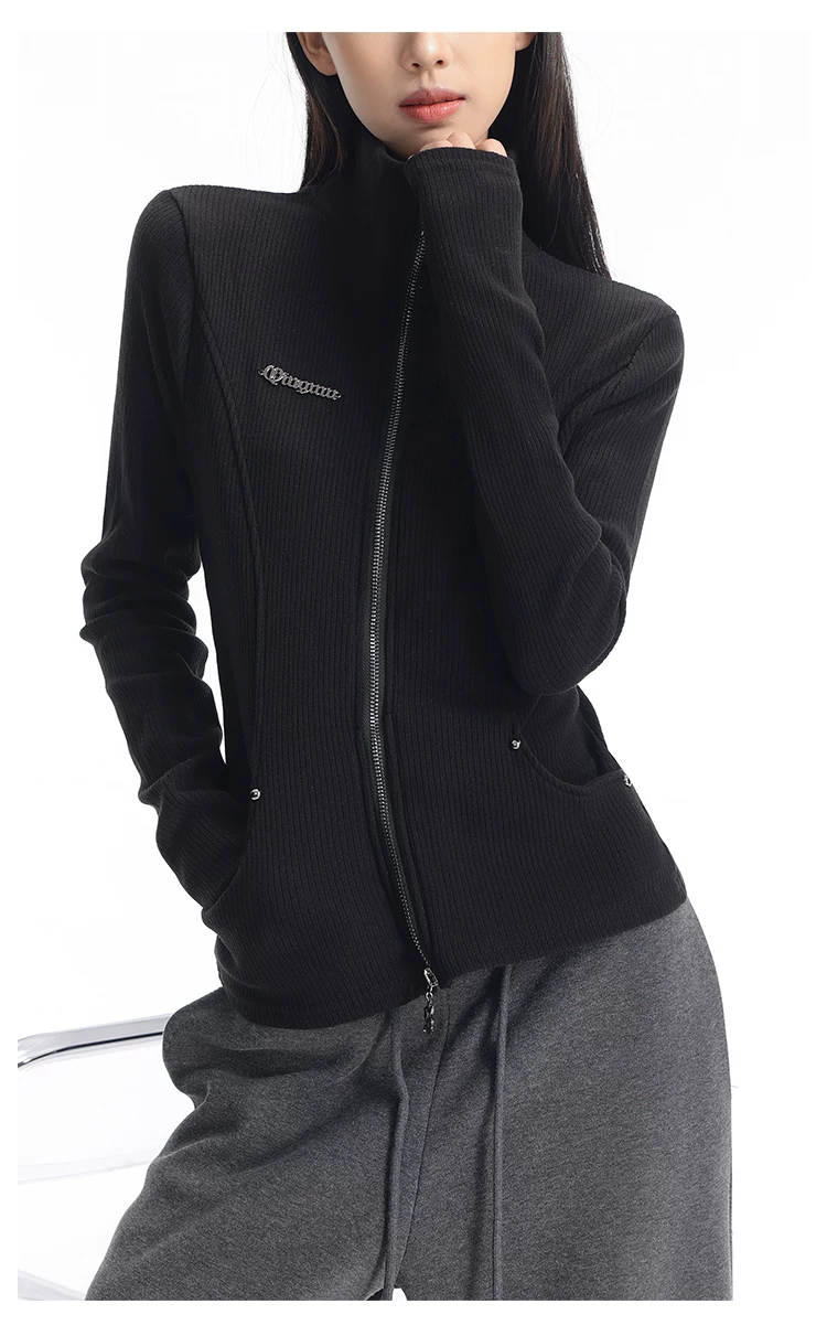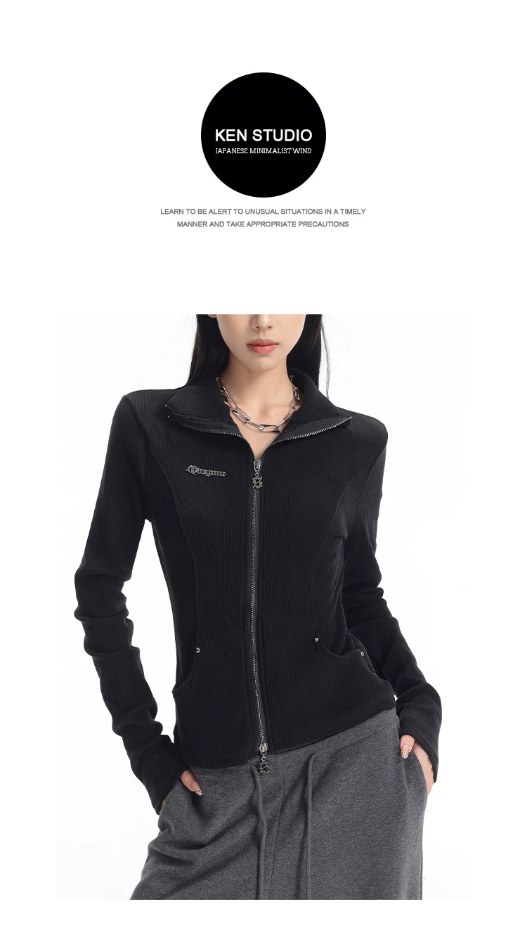 KEN STUDIO mùa thu đông mới phong cách Mỹ áo khoác cardigan dệt kim màu đen dành cho nữ dáng ôm vừa vặn áo dài tay sọc