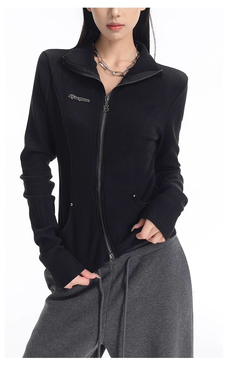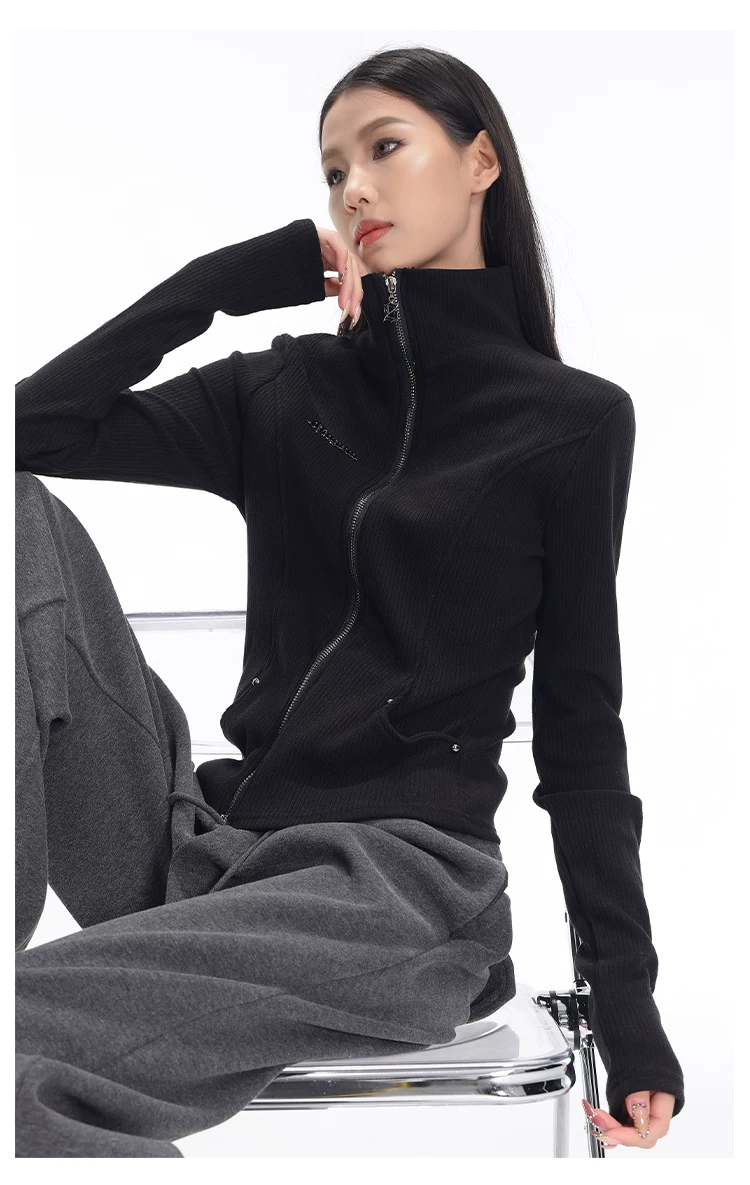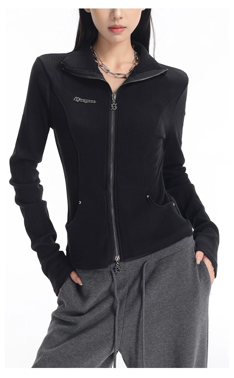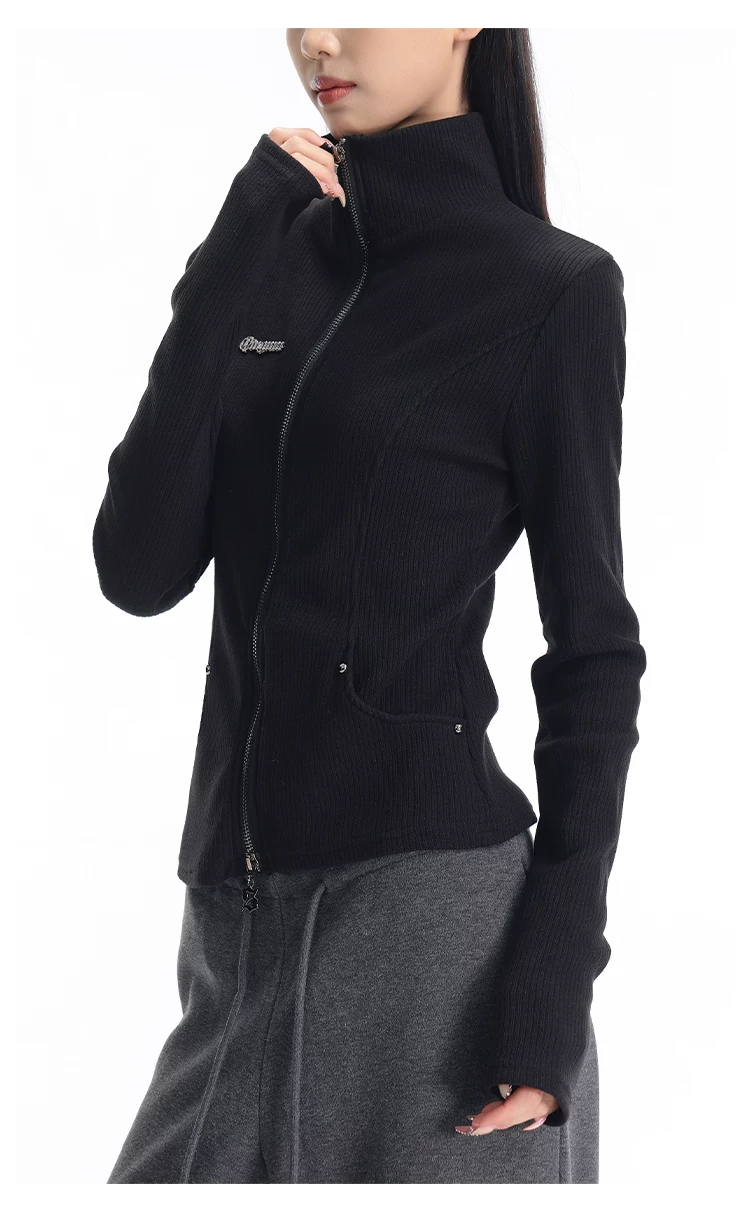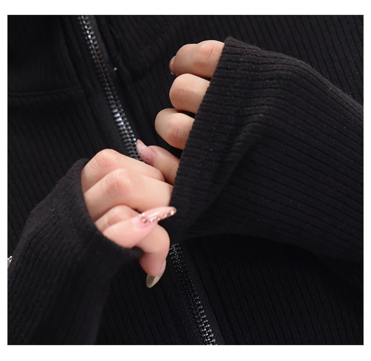 KEN STUDIO mùa thu đông mới phong cách Mỹ áo khoác cardigan dệt kim màu đen dành cho nữ dáng ôm vừa vặn áo dài tay sọc