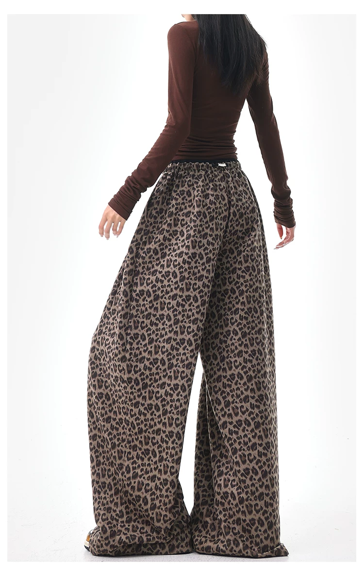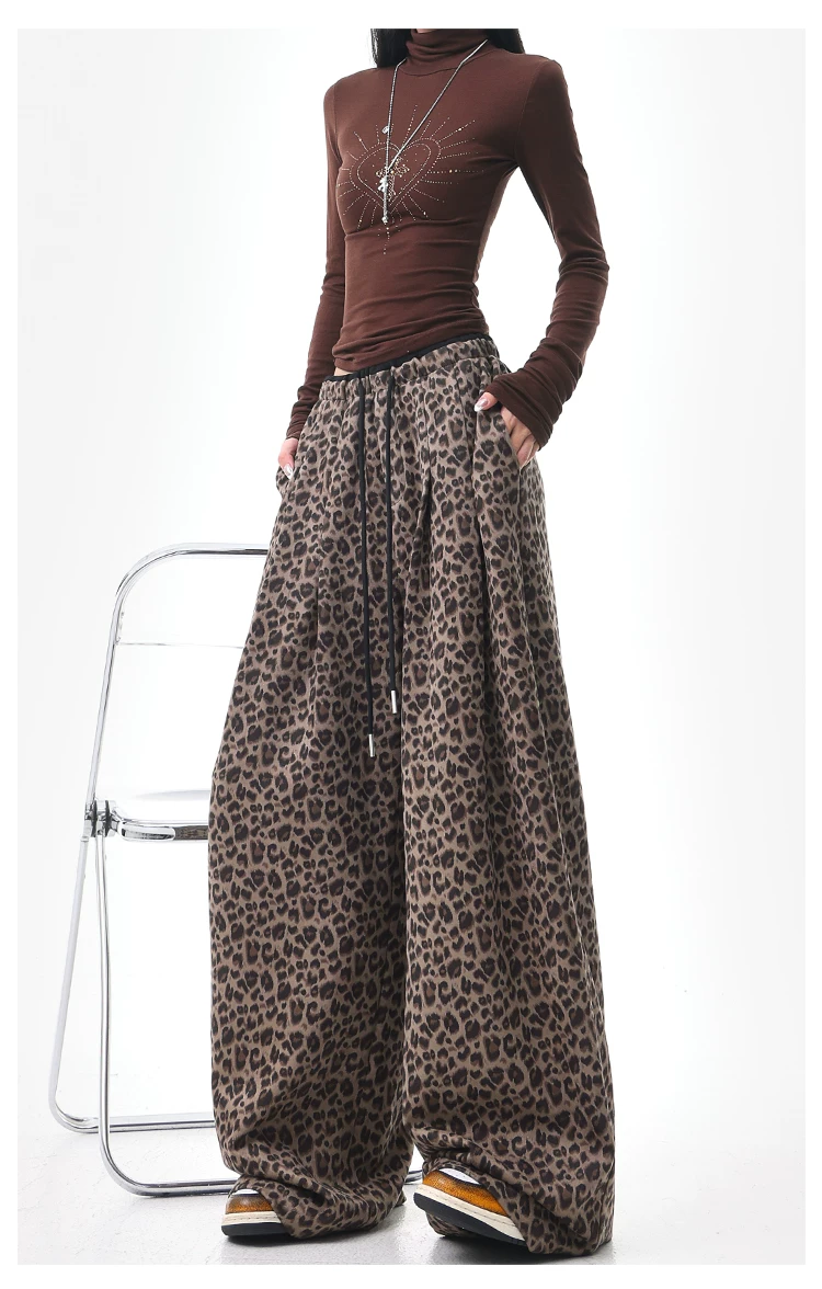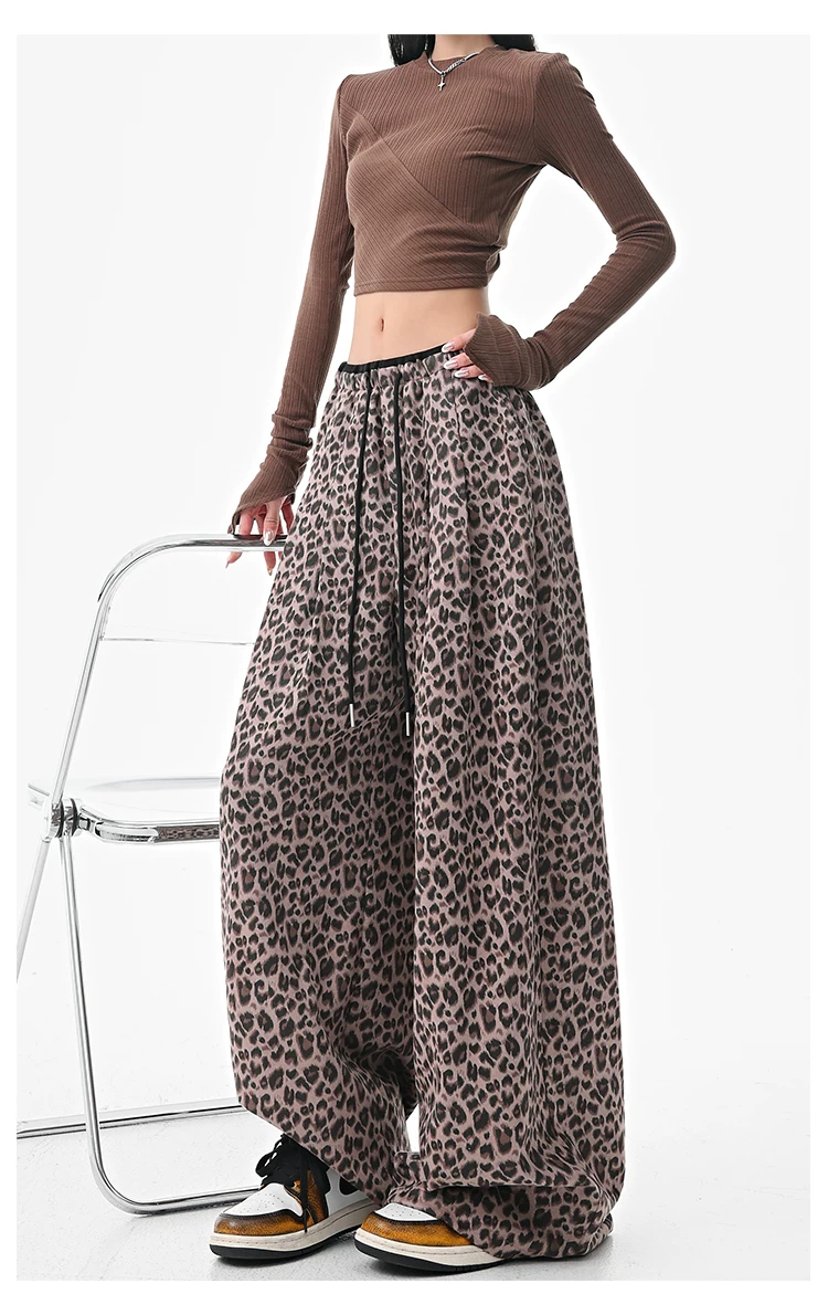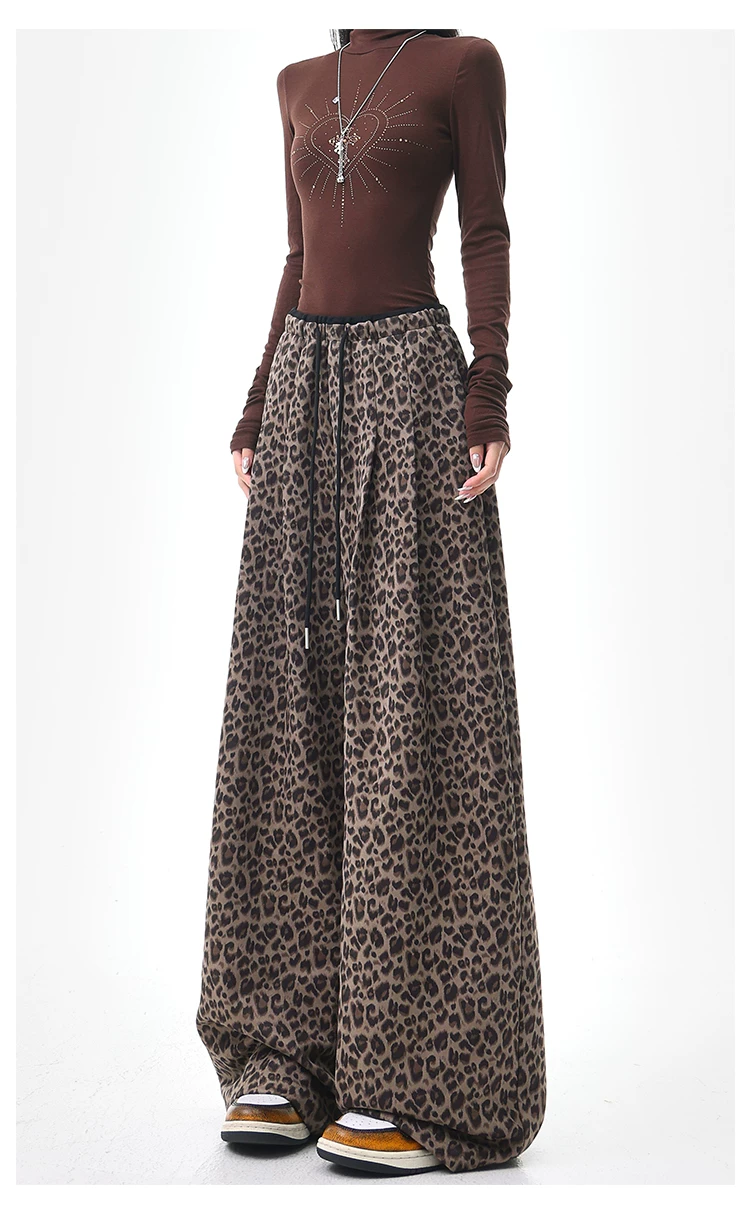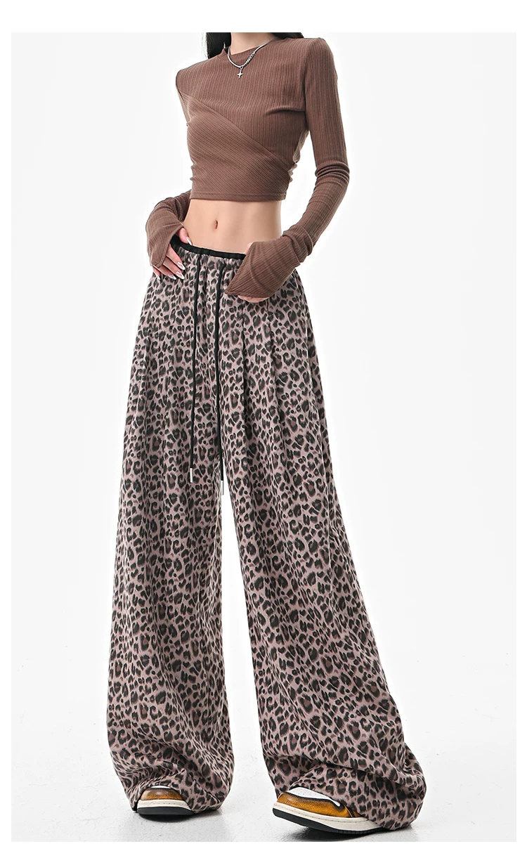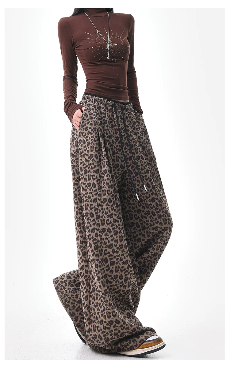 - KEN STUDIO mùa thu đông mới phong cách retro da lộn in họa tiết da báo quần âu nữ lưng cao dáng rộng quần ống rộng giảm béo