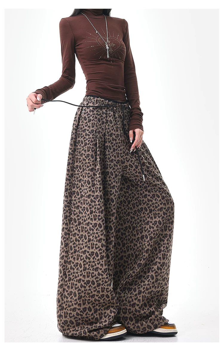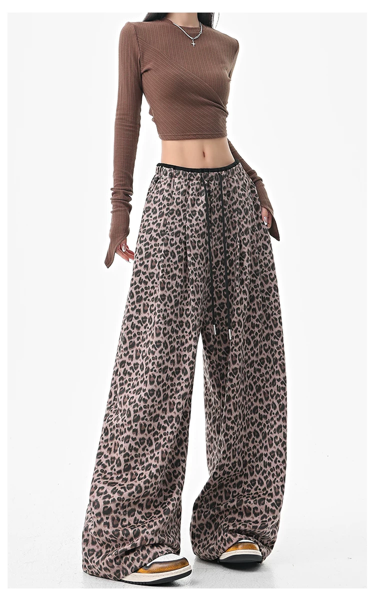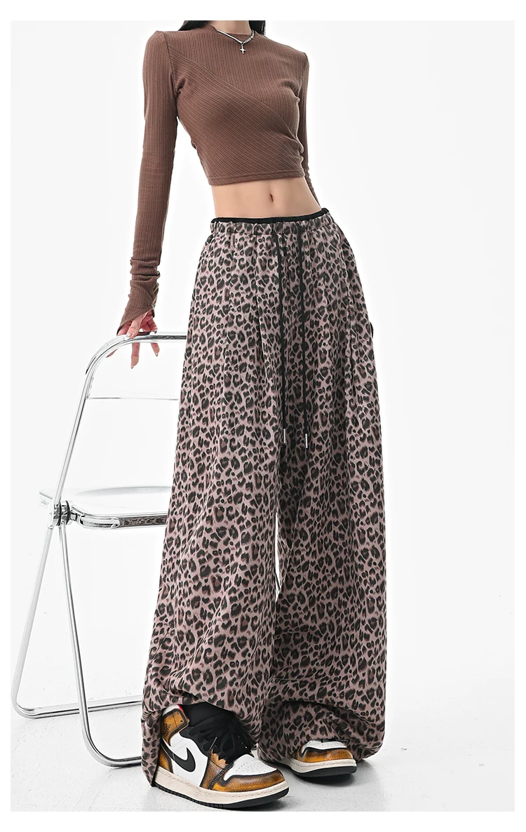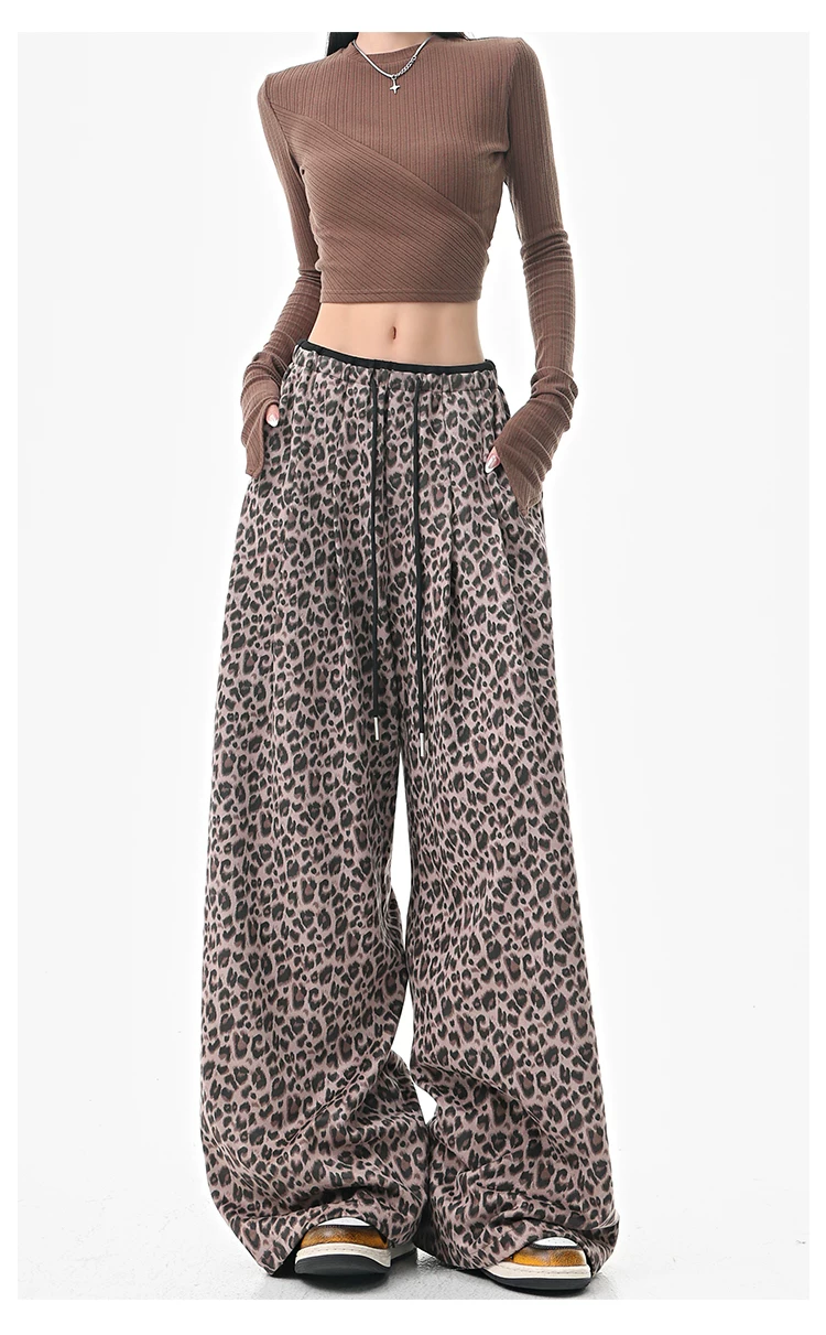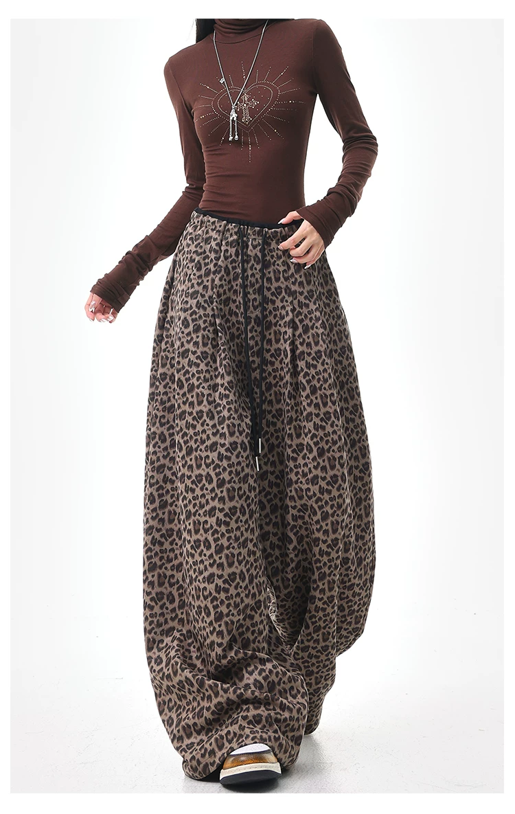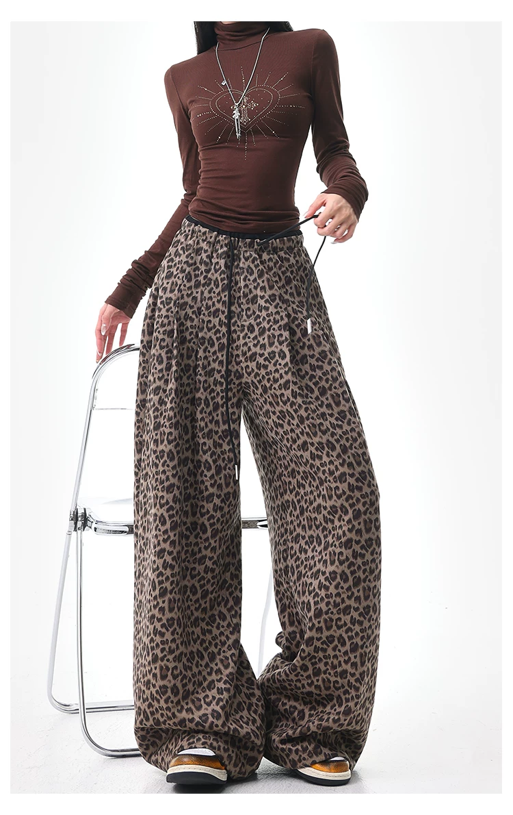 - KEN STUDIO mùa thu đông mới phong cách retro da lộn in họa tiết da báo quần âu nữ lưng cao dáng rộng quần ống rộng giảm béo