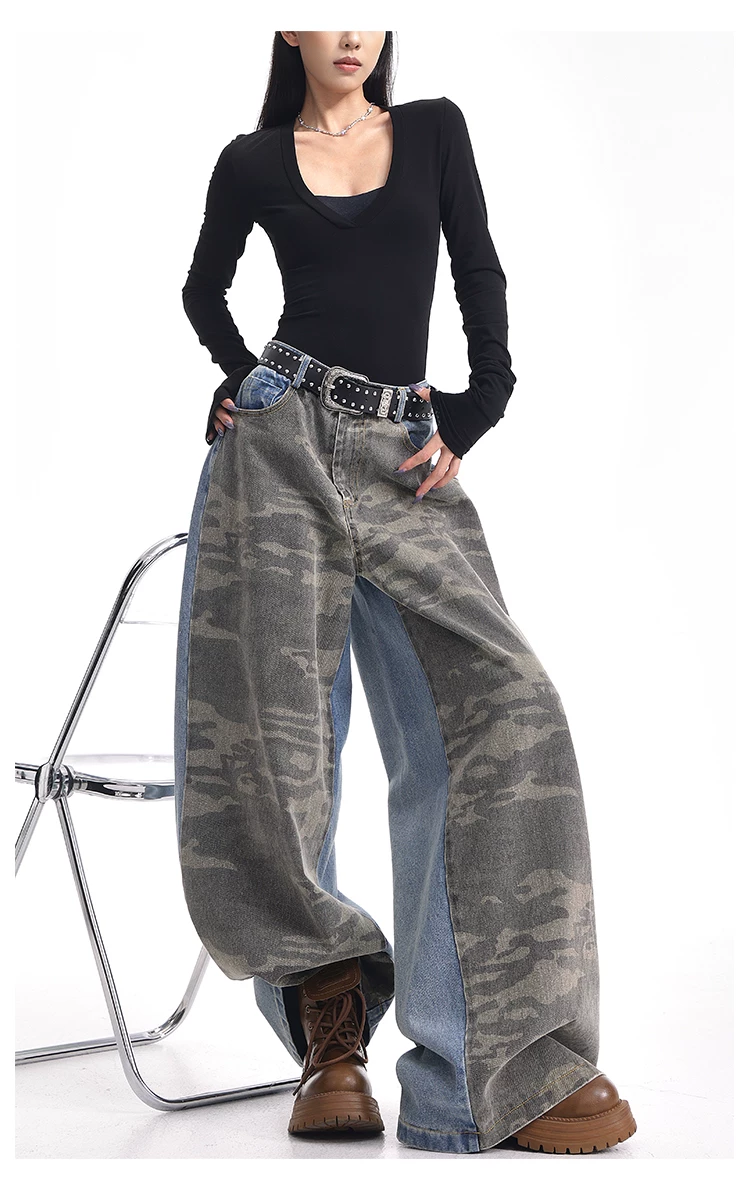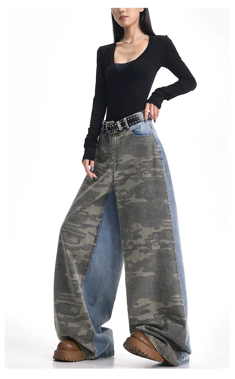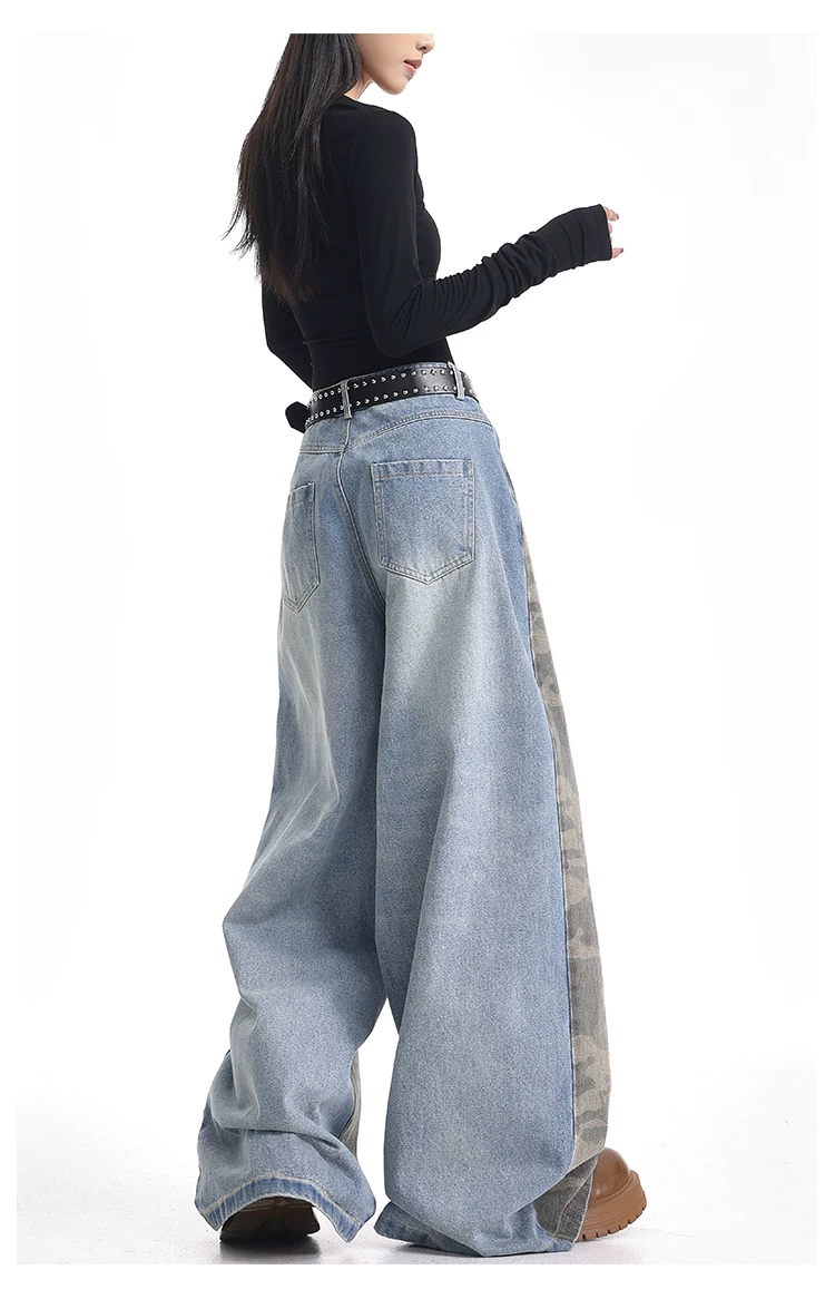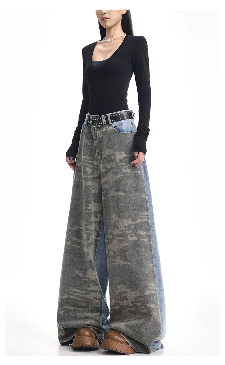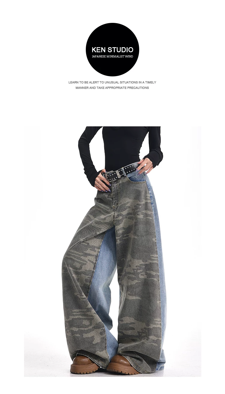 - KEN STUDIO mùa thu đông mới quần jean phối màu rằn ri phối màu kiểu Mỹ quần ống rộng dài đến sàn kiểu Mỹ