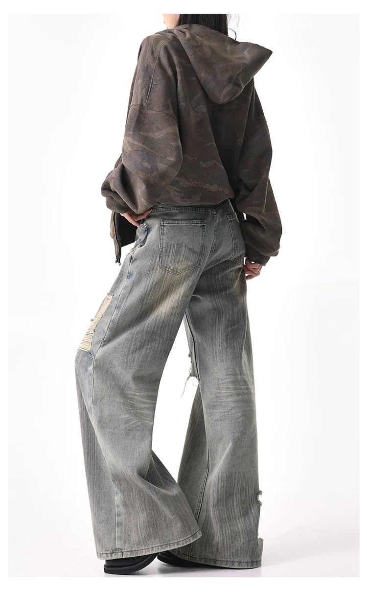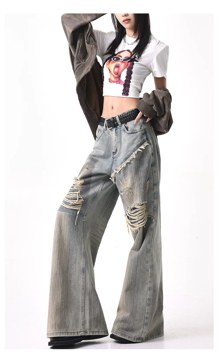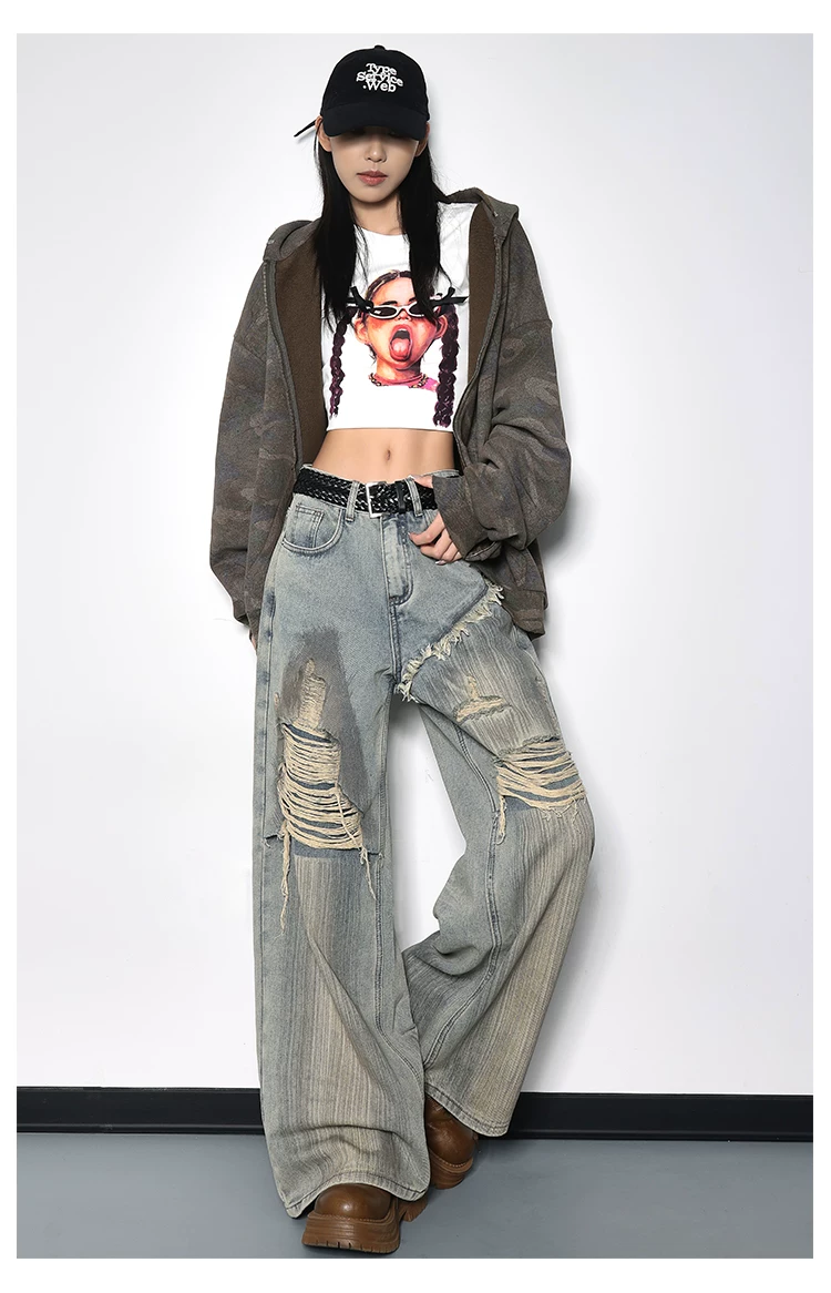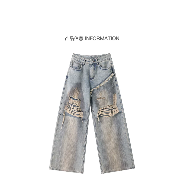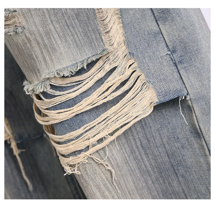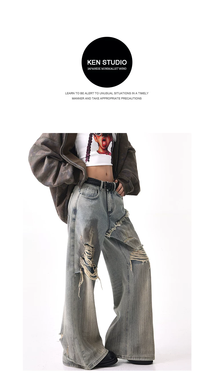- KEN STUDIO mùa thu đông phong cách mới màu xanh lam hai lớp rách giả hai mảnh quần jean nối liền quần ống rộng thẳng dành cho nữ