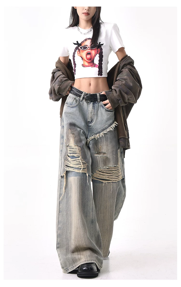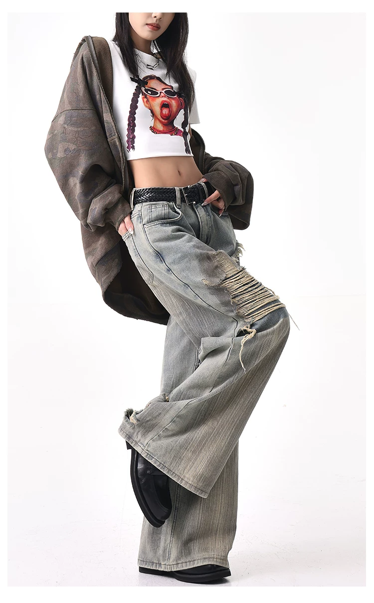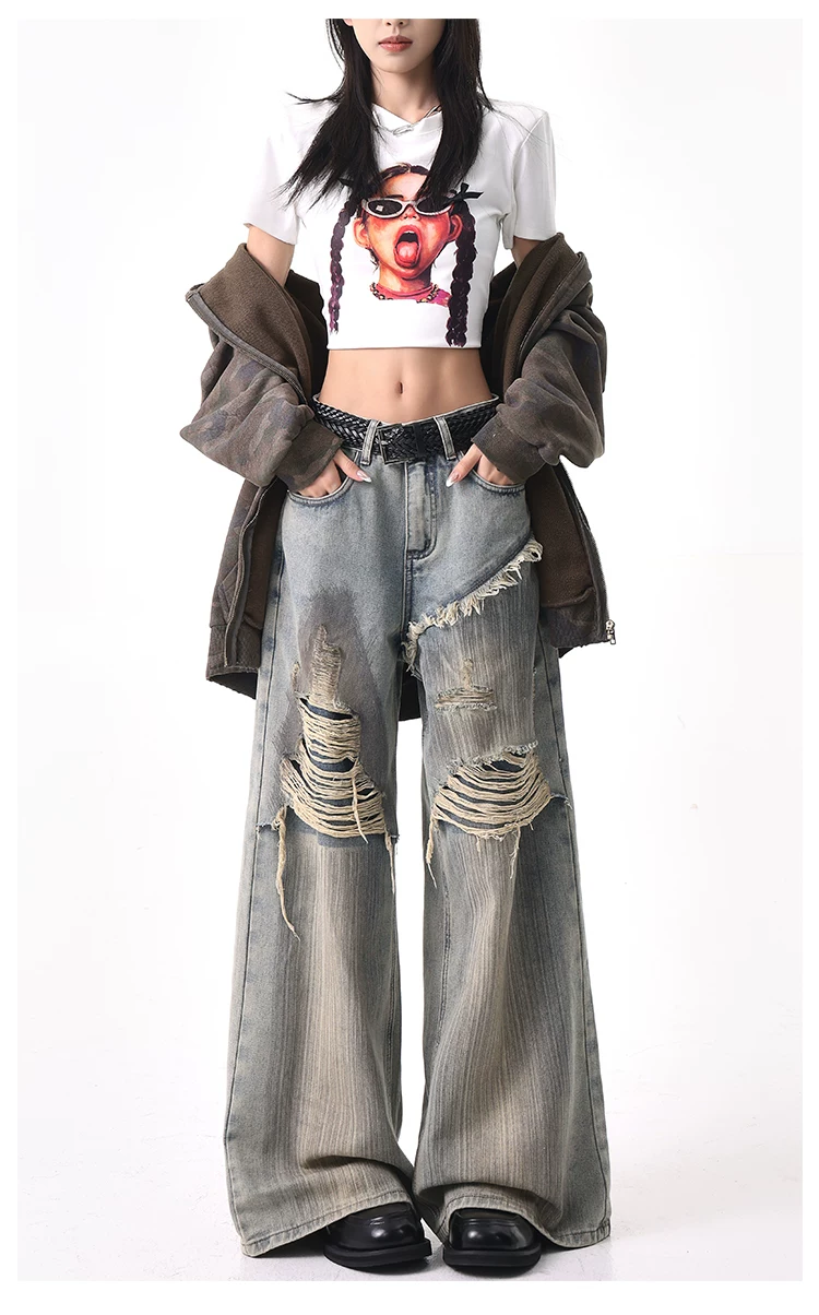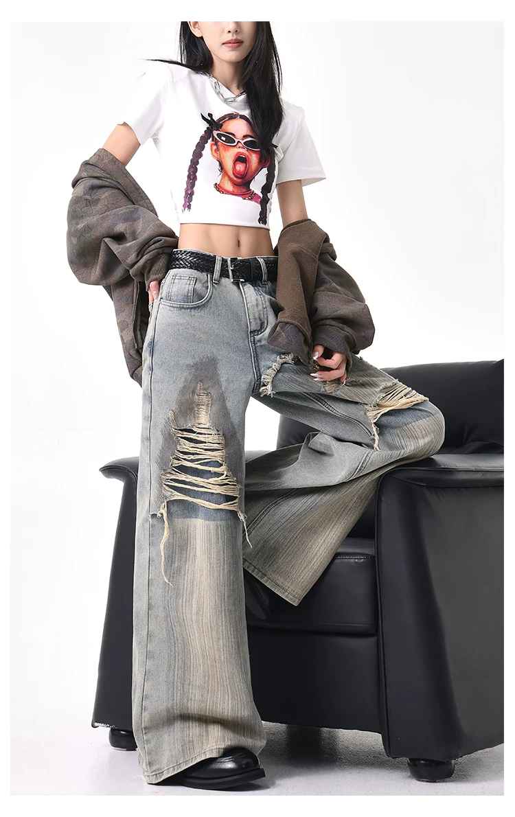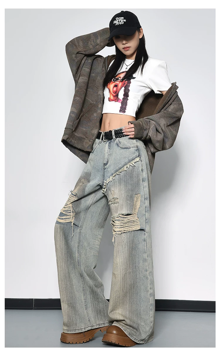 - KEN STUDIO mùa thu đông phong cách mới màu xanh lam hai lớp rách giả hai mảnh quần jean nối liền quần ống rộng thẳng dành cho nữ