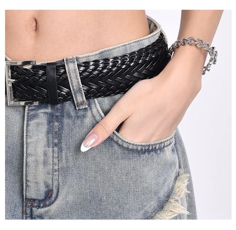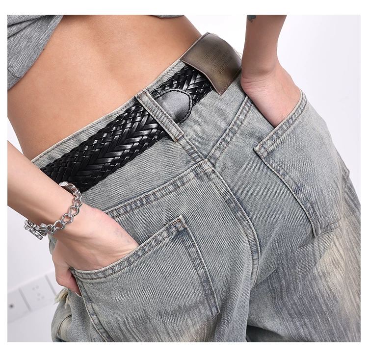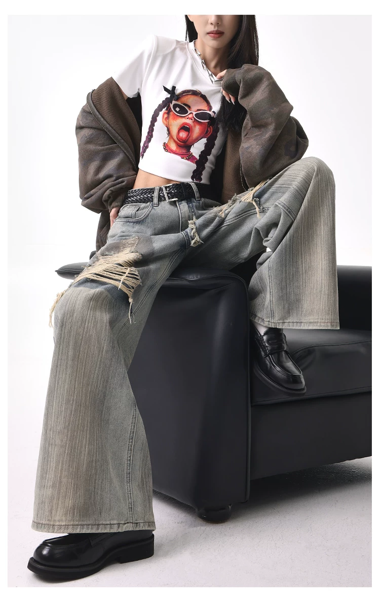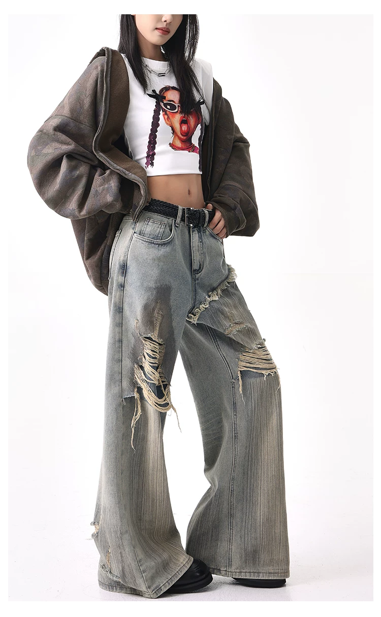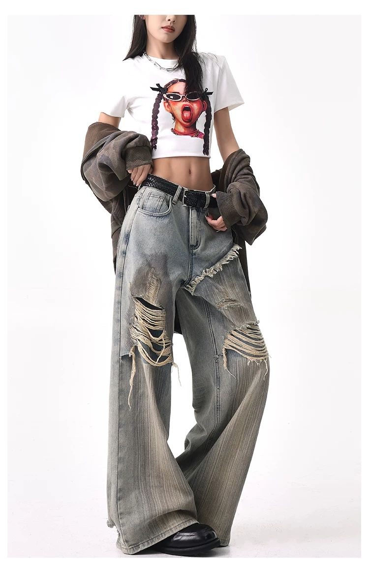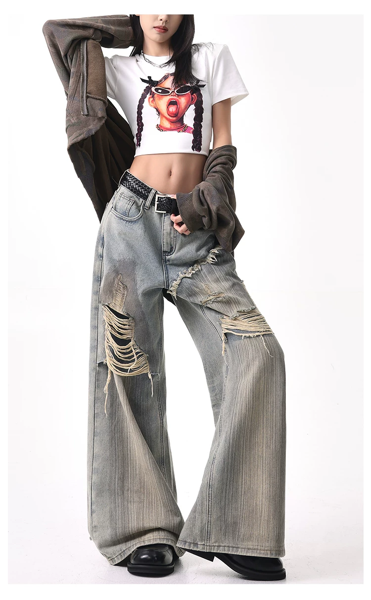- KEN STUDIO mùa thu đông phong cách mới màu xanh lam hai lớp rách giả hai mảnh quần jean nối liền quần ống rộng thẳng dành cho nữ