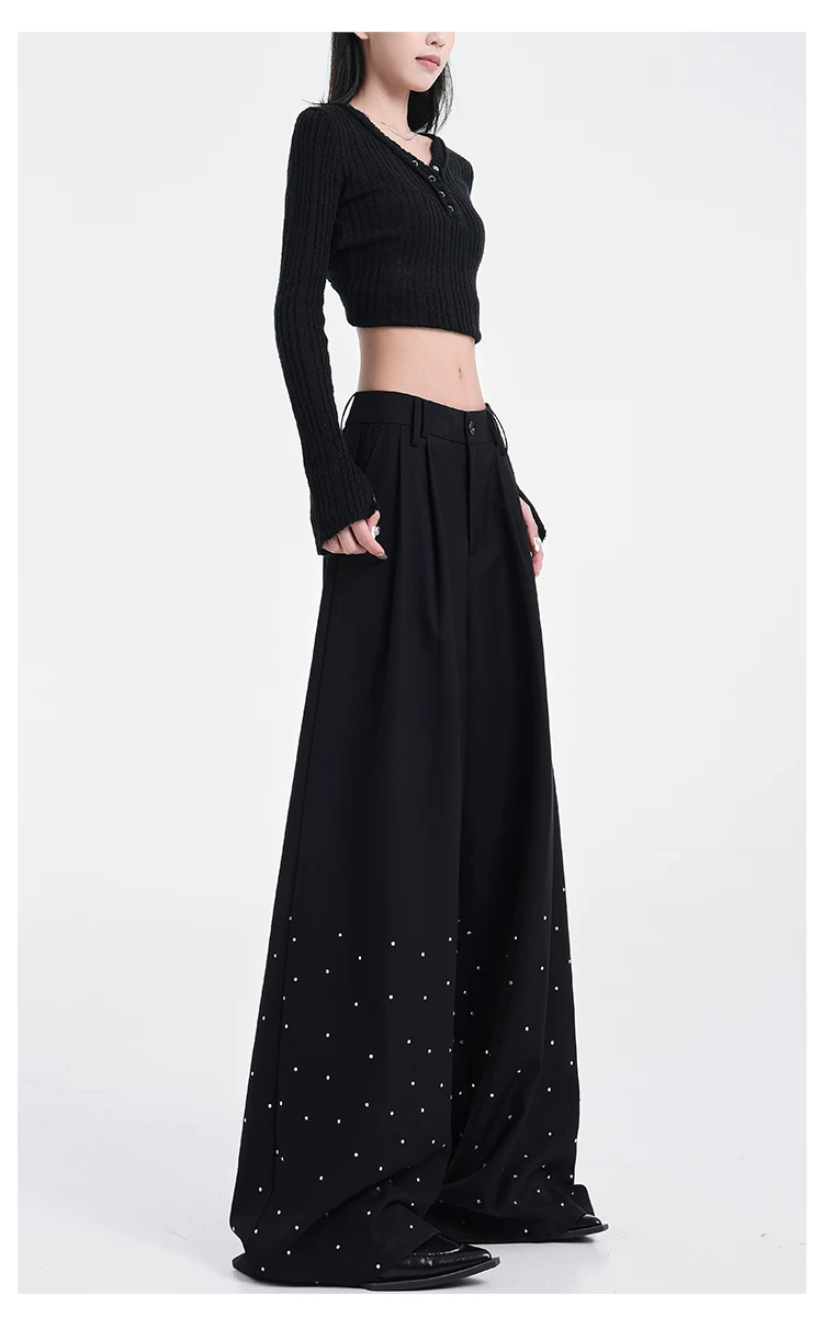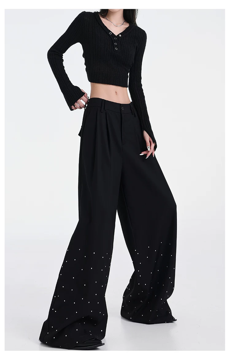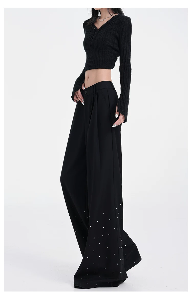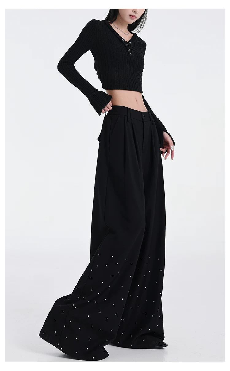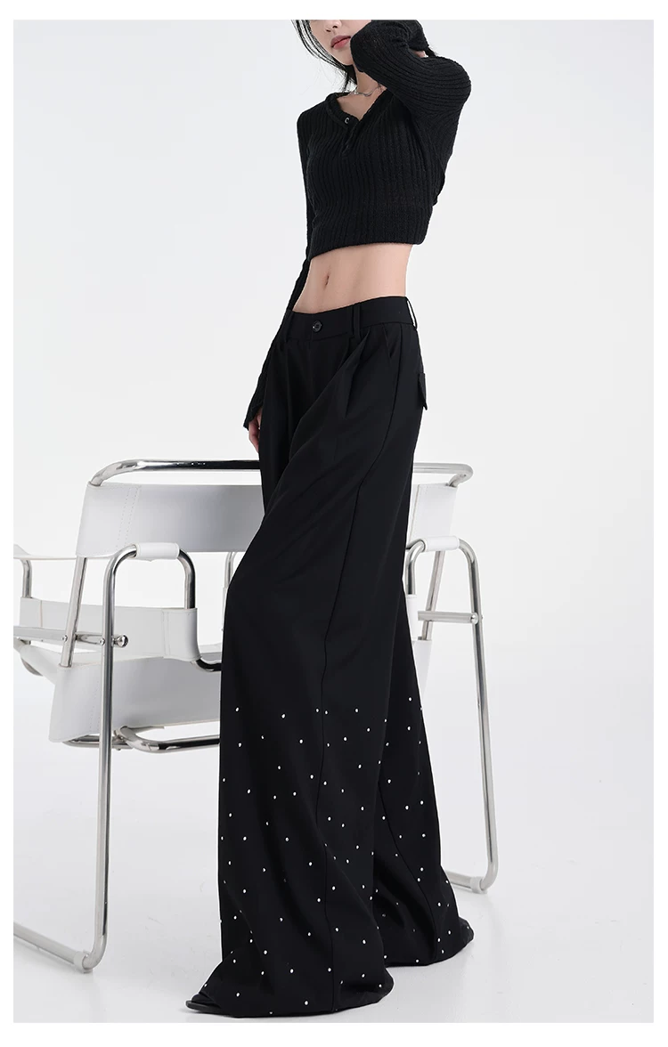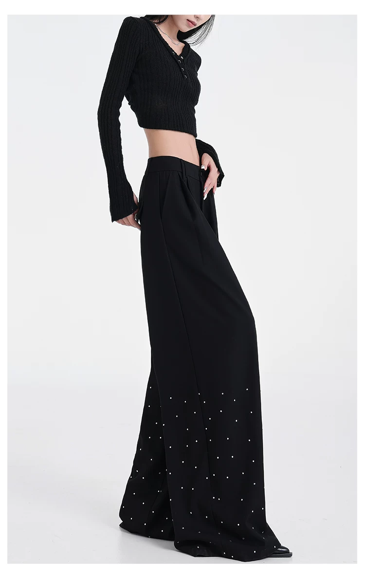 - KEN STUDIO nguyên bản mùa hè và mùa thu mới thiết kế đính đá màu đen phù hợp với quần đa năng quần ống rộng dáng rộng giảm béo