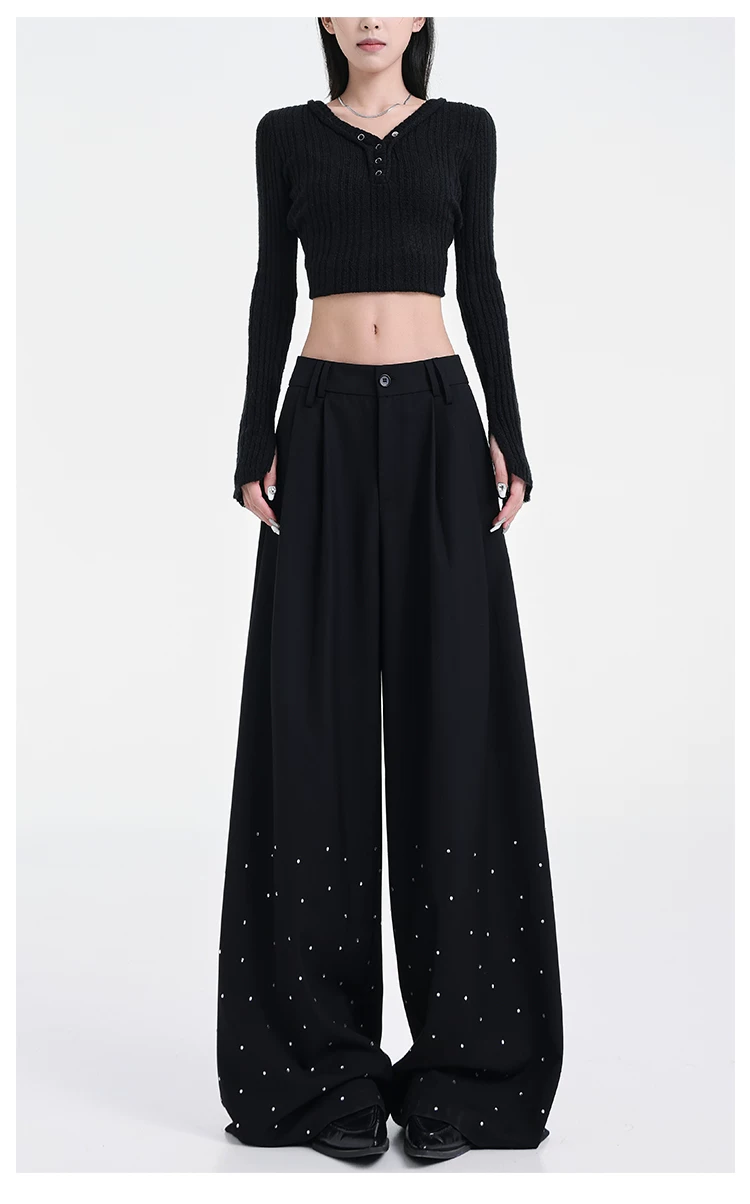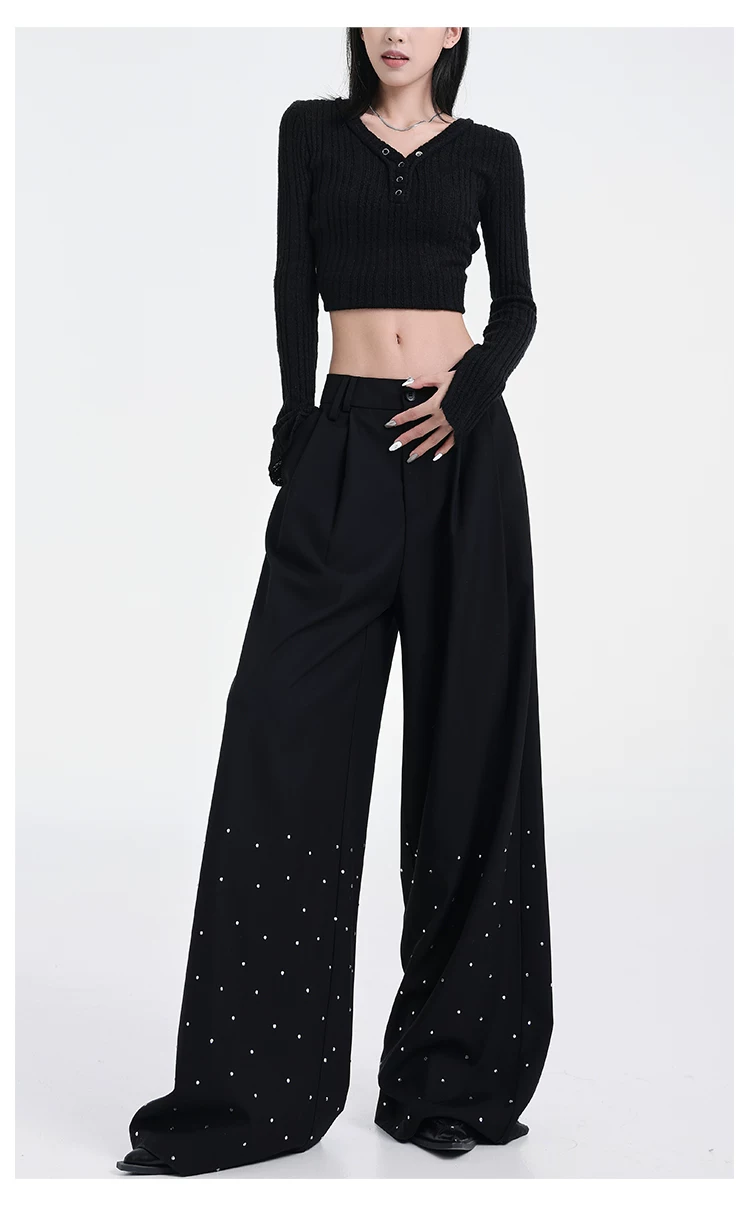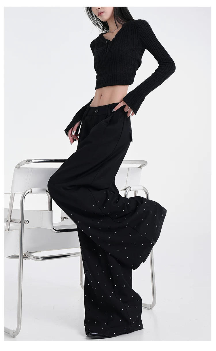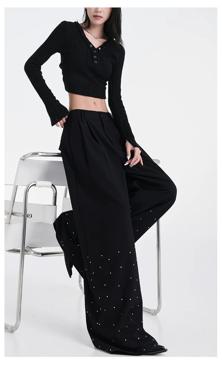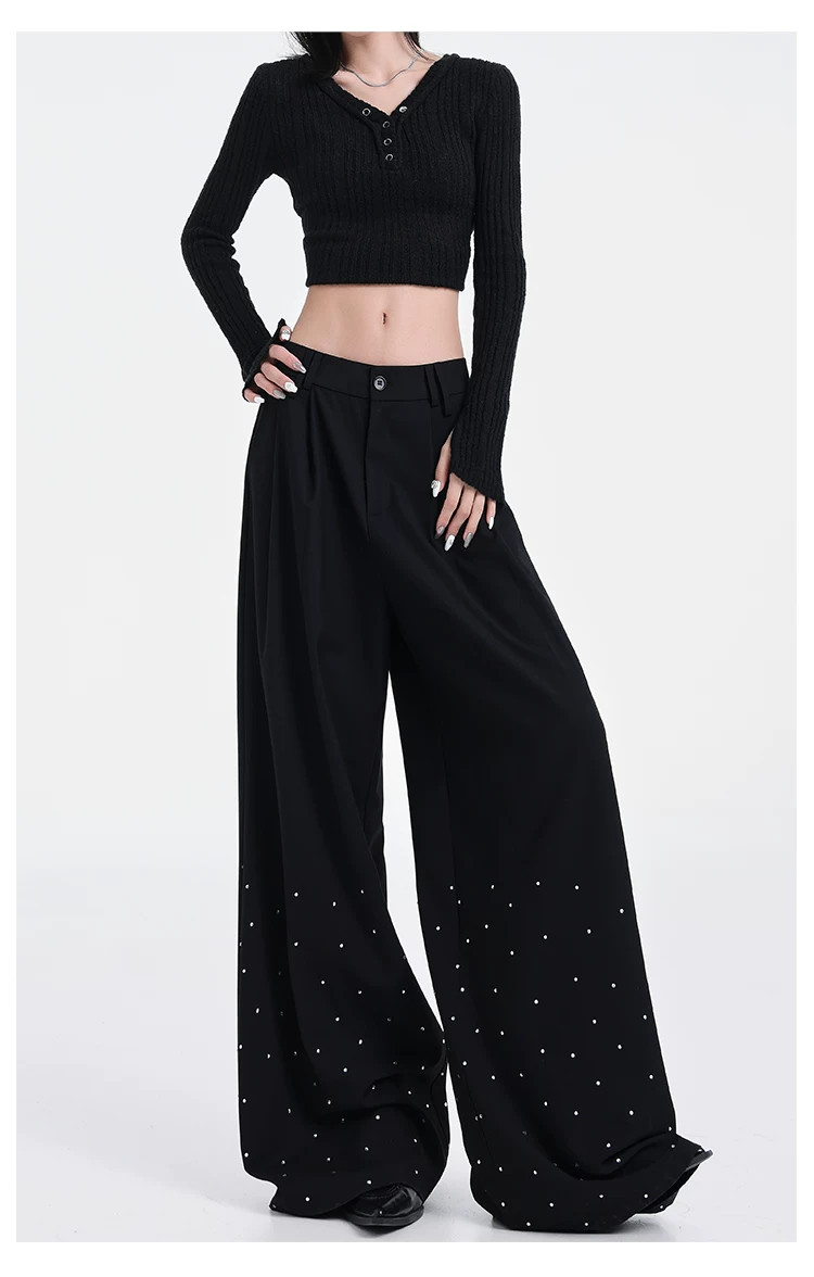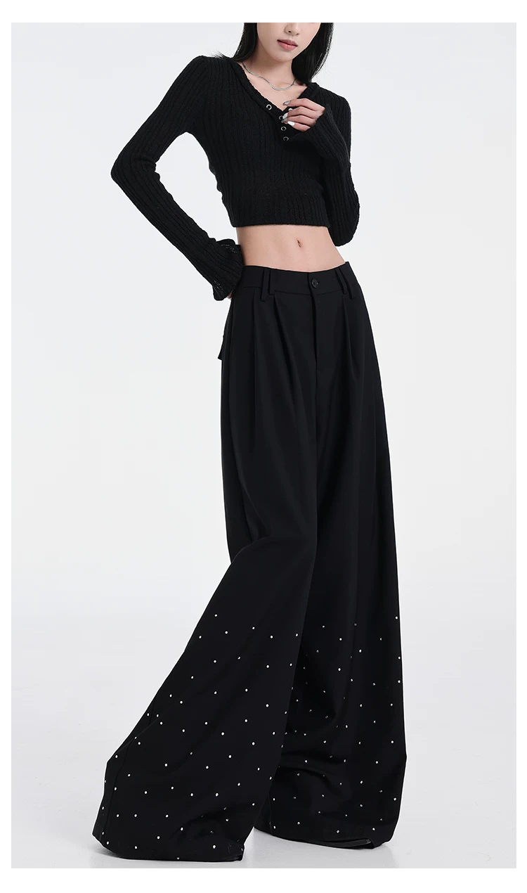 - KEN STUDIO nguyên bản mùa hè và mùa thu mới thiết kế đính đá màu đen phù hợp với quần đa năng quần ống rộng dáng rộng giảm béo