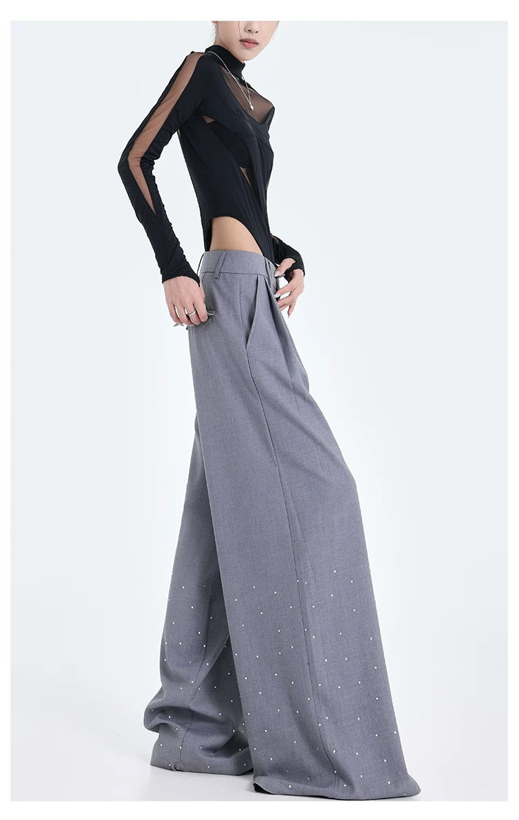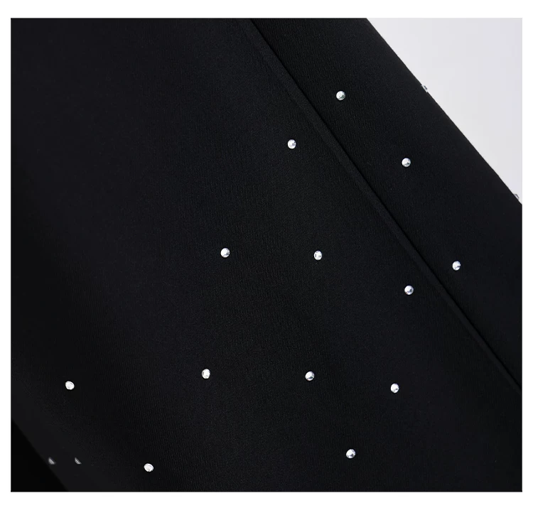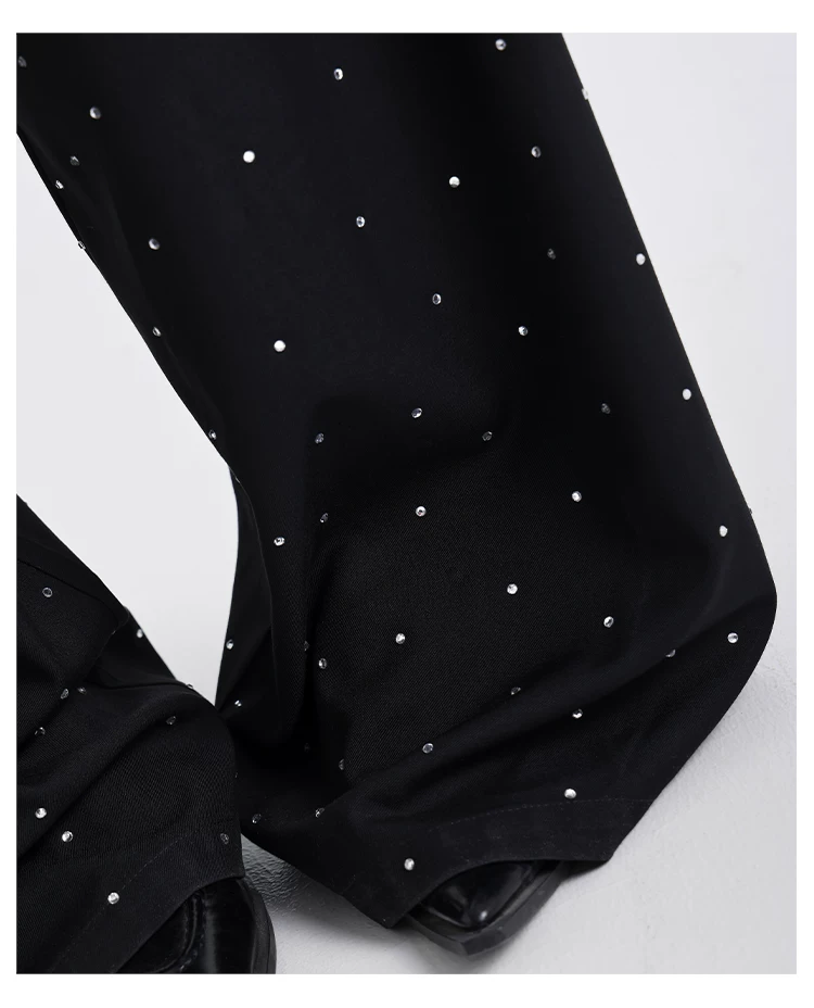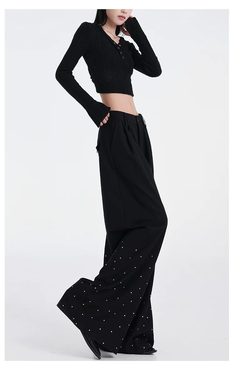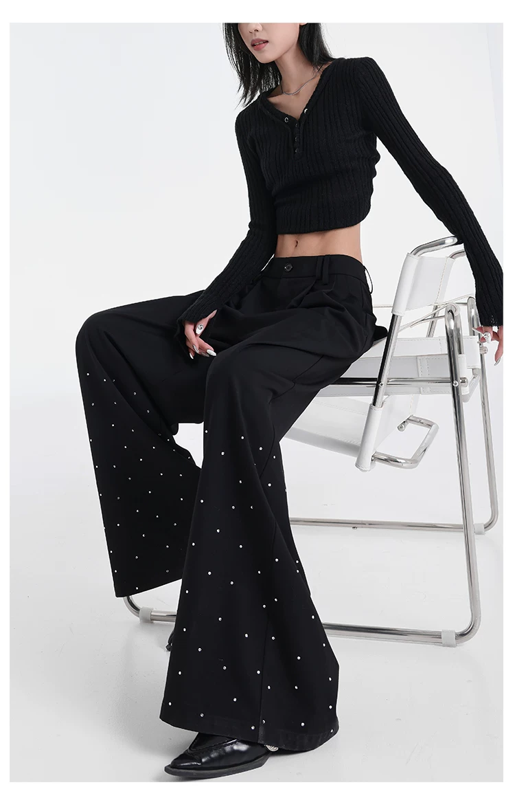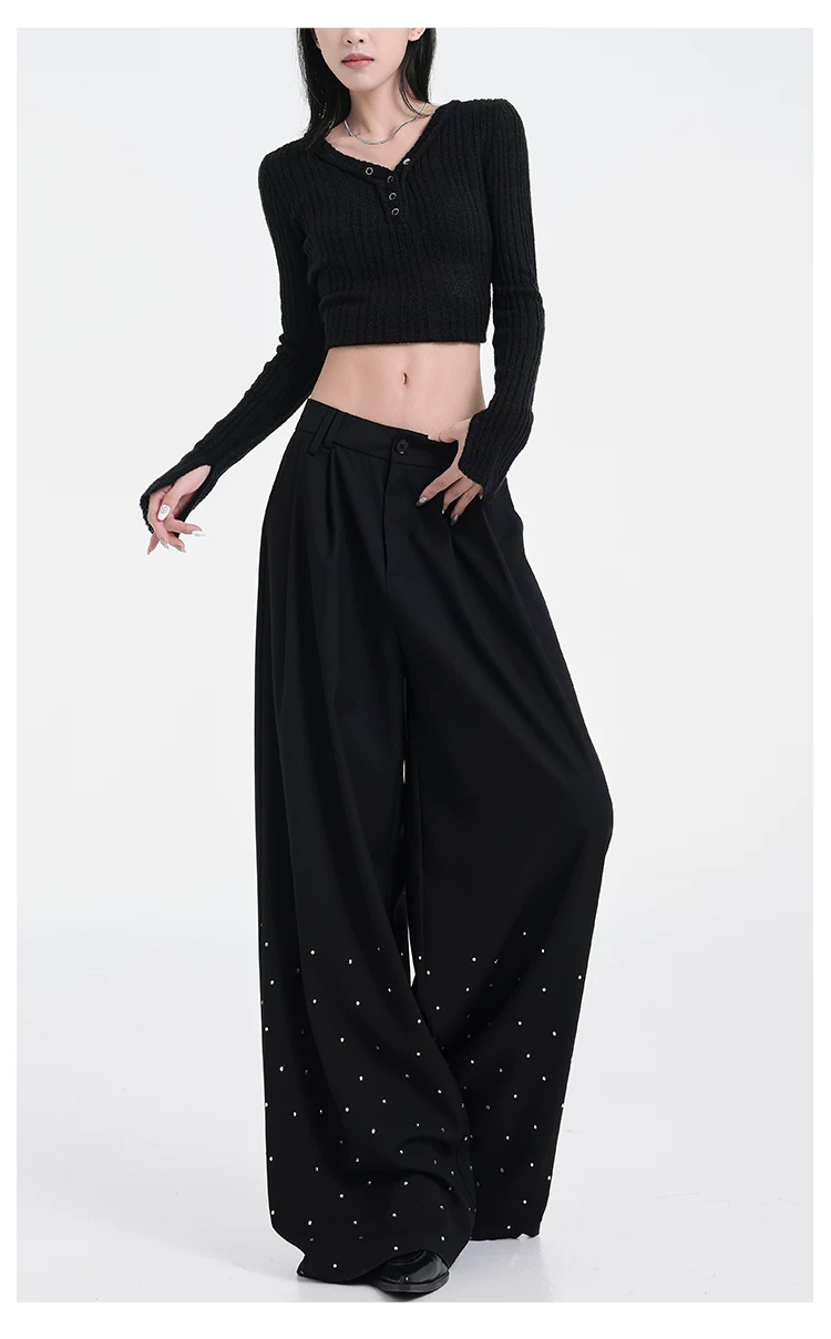- KEN STUDIO nguyên bản mùa hè và mùa thu mới thiết kế đính đá màu đen phù hợp với quần đa năng quần ống rộng dáng rộng giảm béo