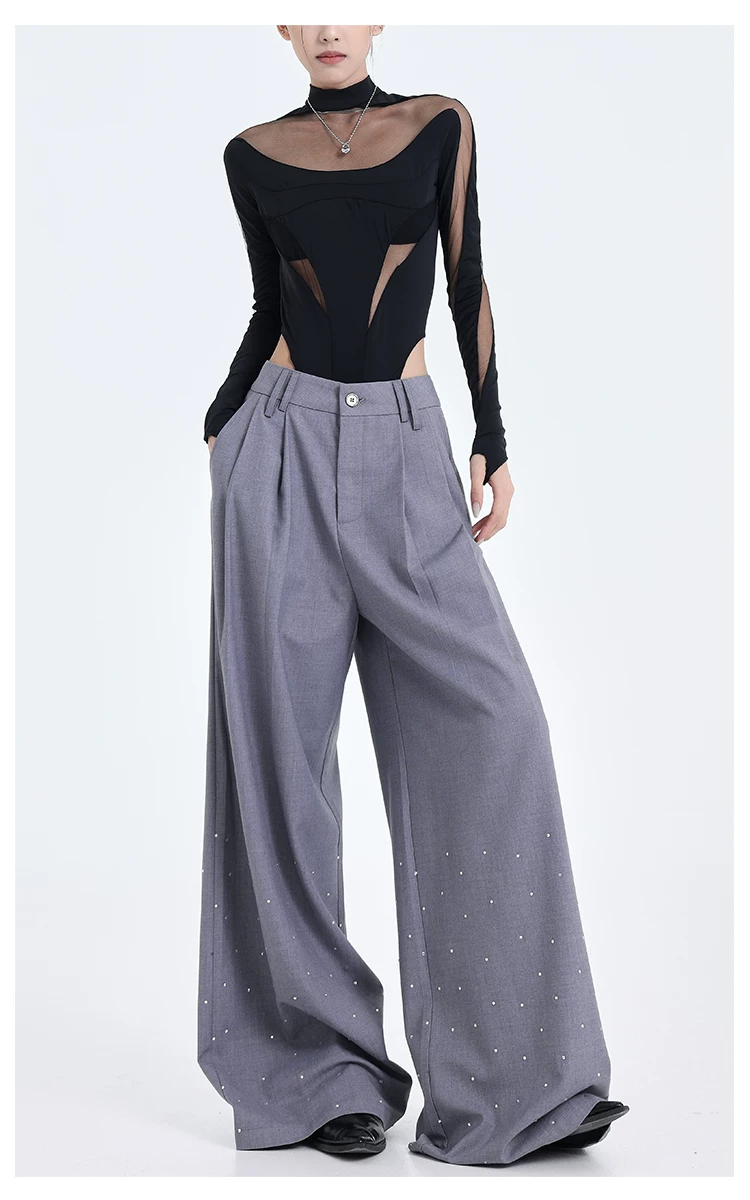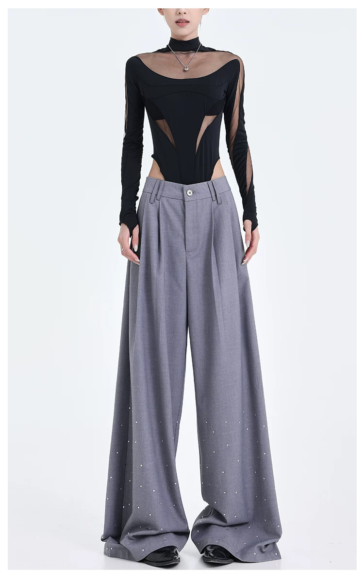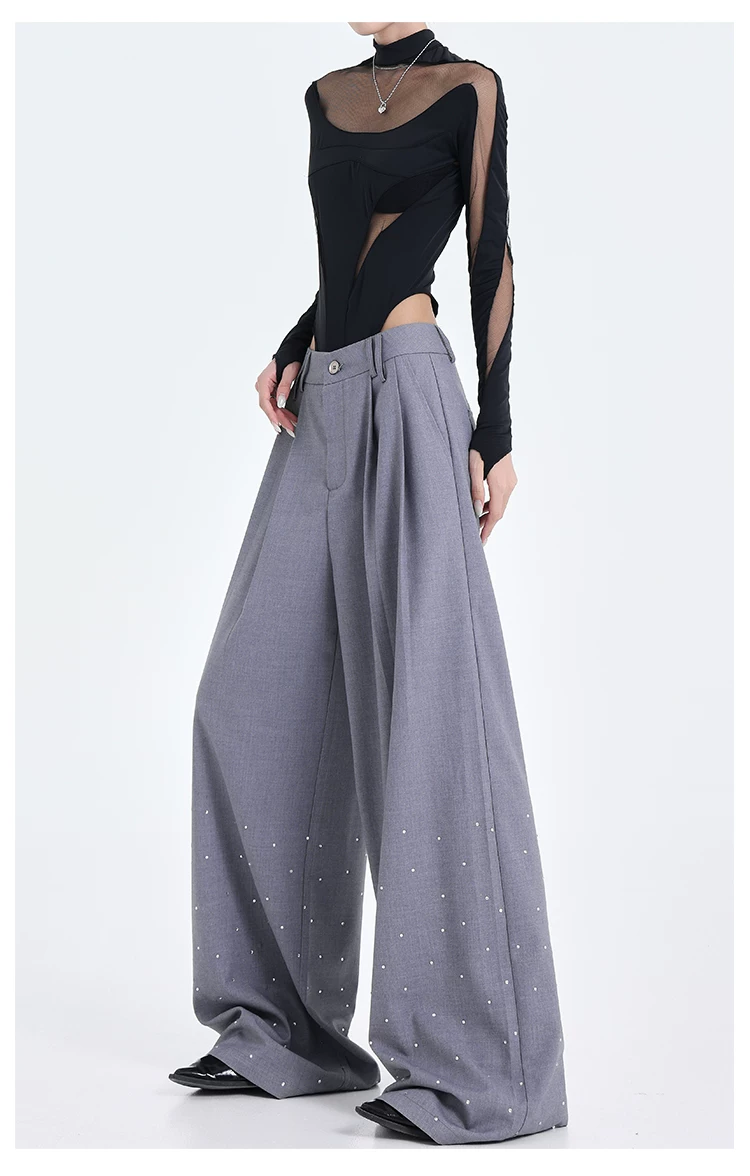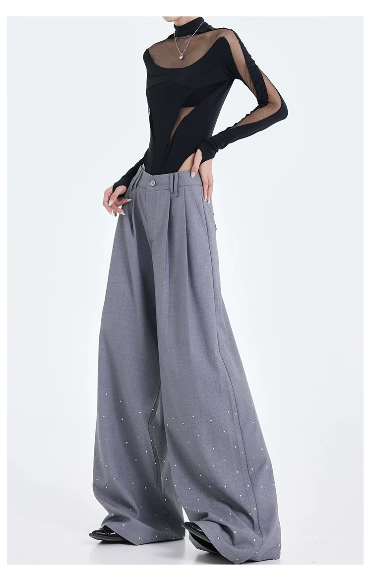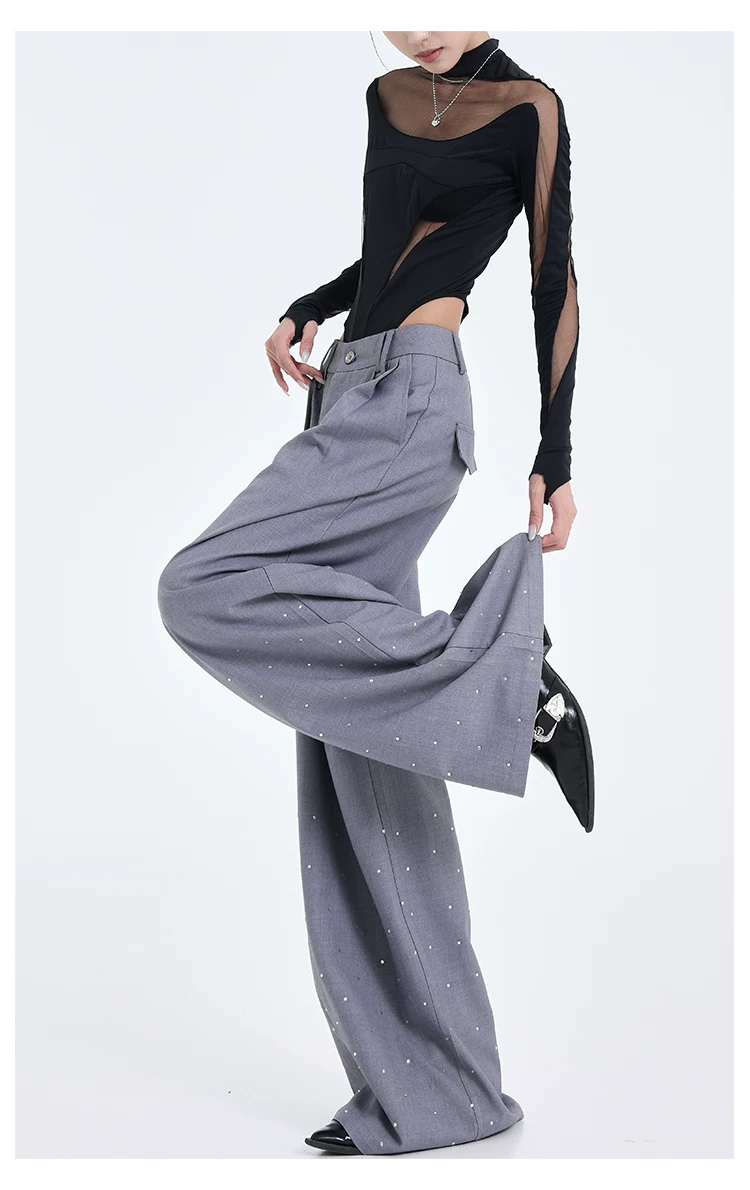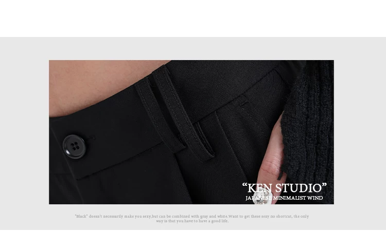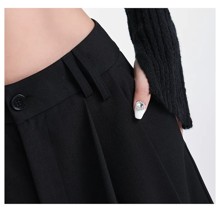 - KEN STUDIO nguyên bản mùa hè và mùa thu mới thiết kế đính đá màu đen phù hợp với quần đa năng quần ống rộng dáng rộng giảm béo