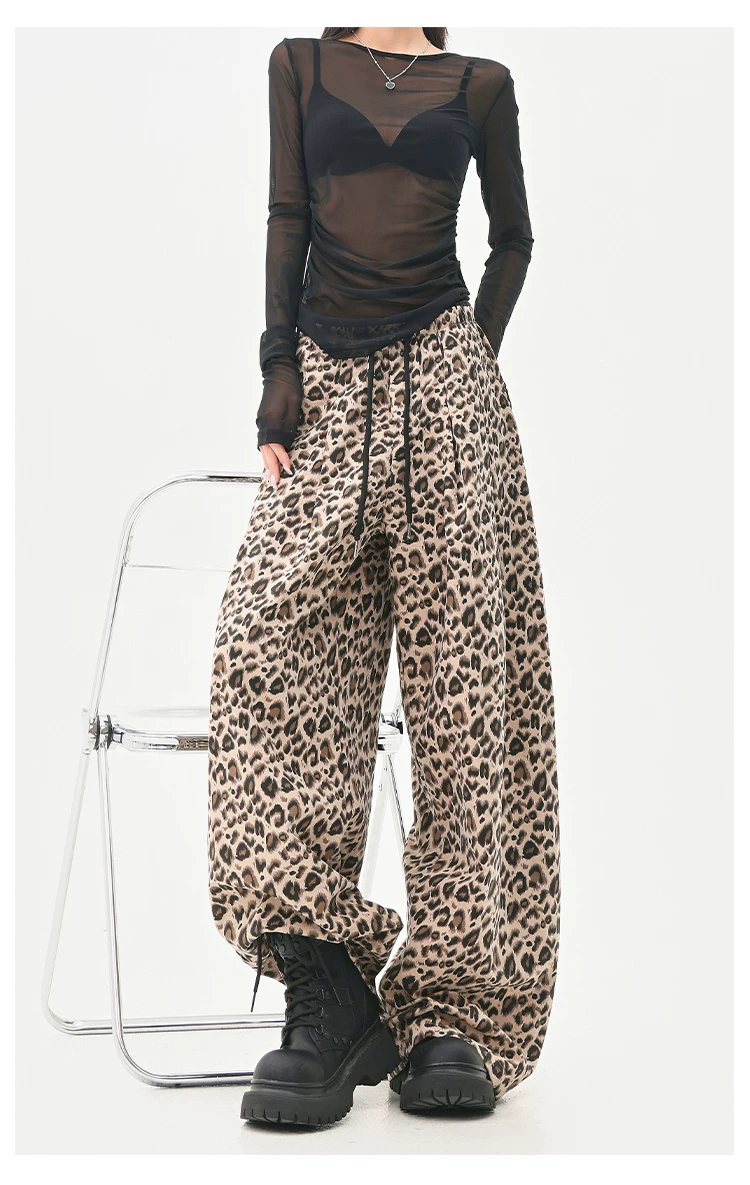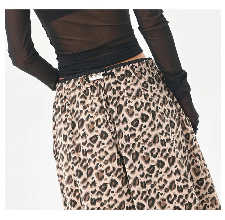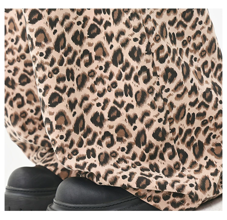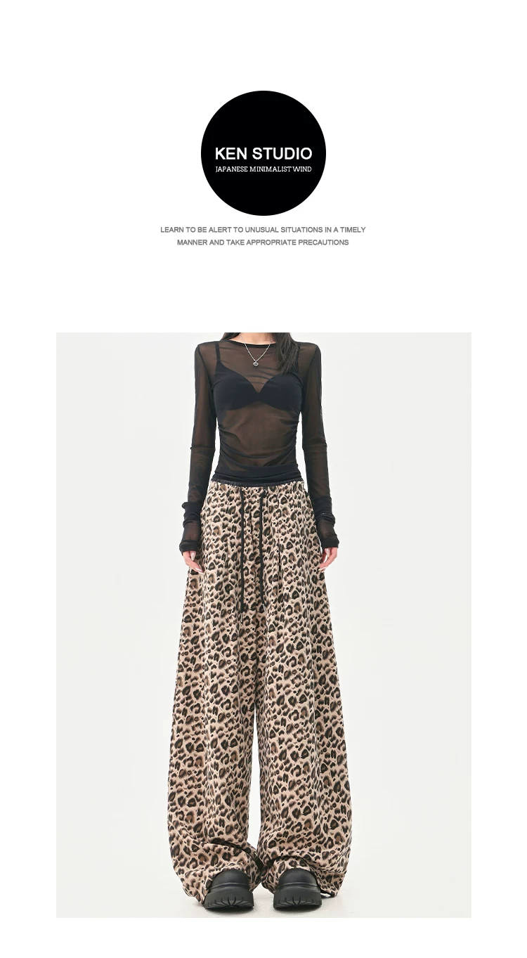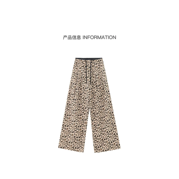 - KEN STUDIO Quần âu in họa tiết da báo phong cách đường phố Mỹ dành cho nữ, quần ống rộng lưng cao có dây rút mùa hè mới