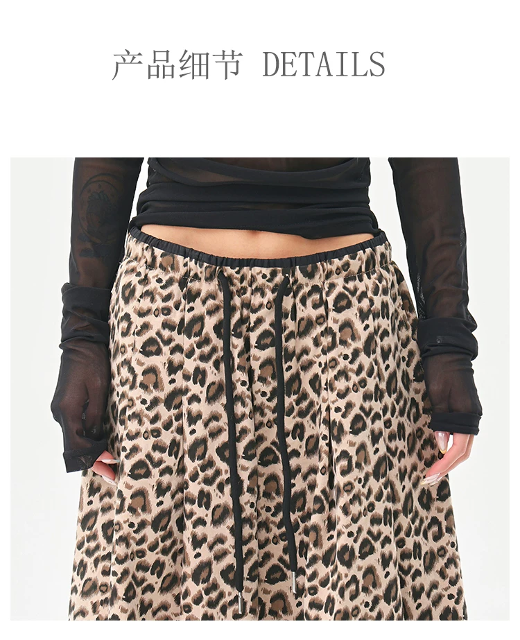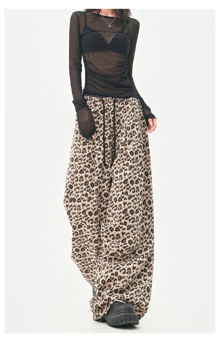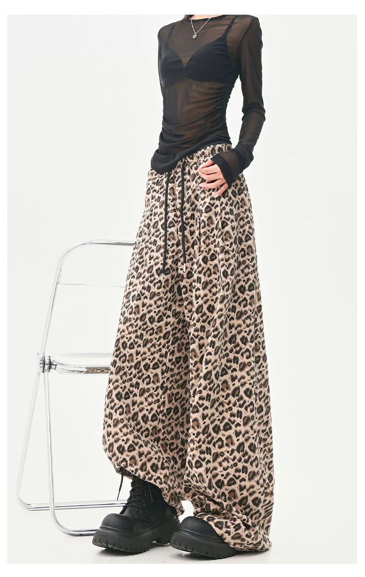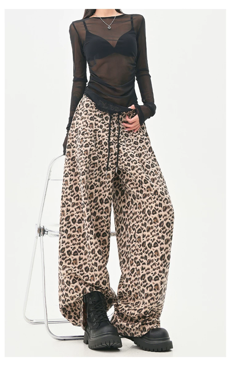 - KEN STUDIO Quần âu in họa tiết da báo phong cách đường phố Mỹ dành cho nữ, quần ống rộng lưng cao có dây rút mùa hè mới