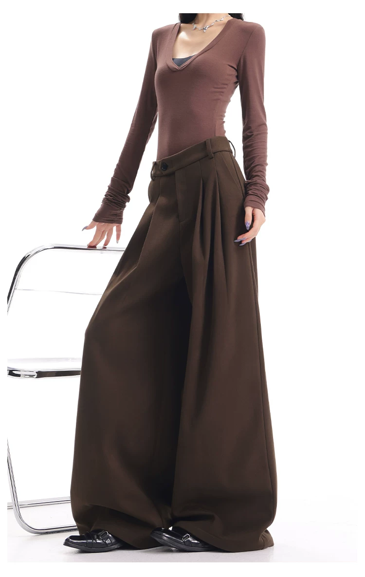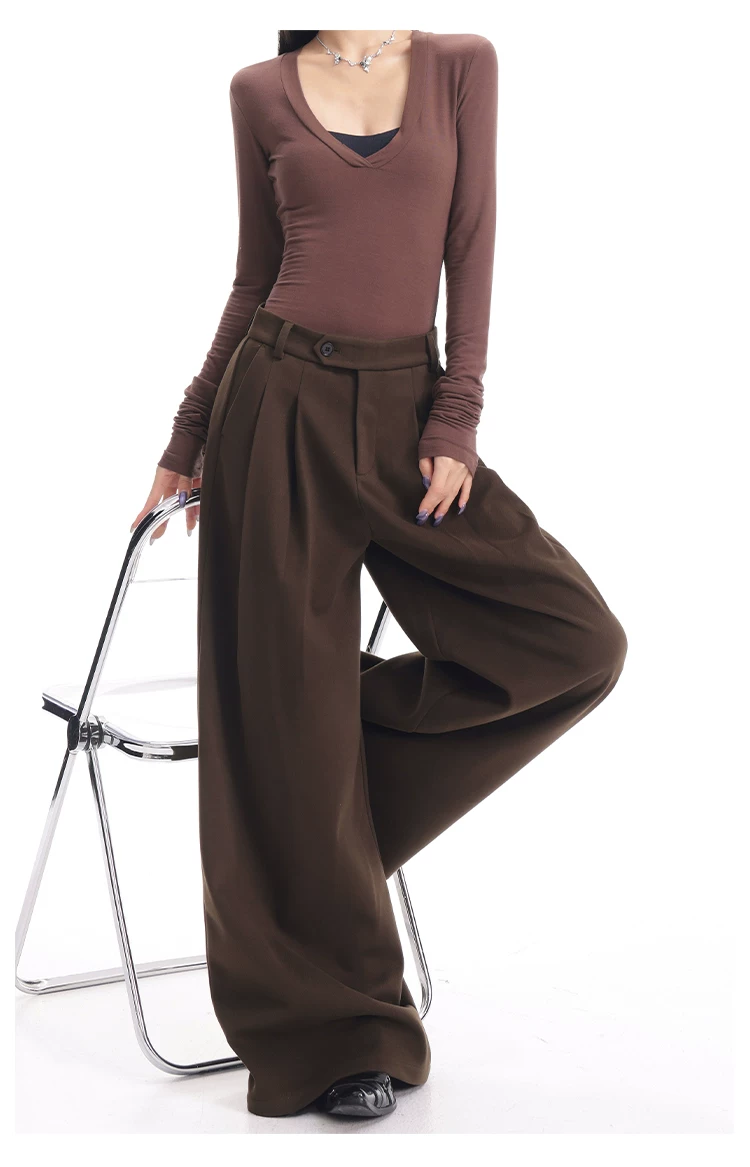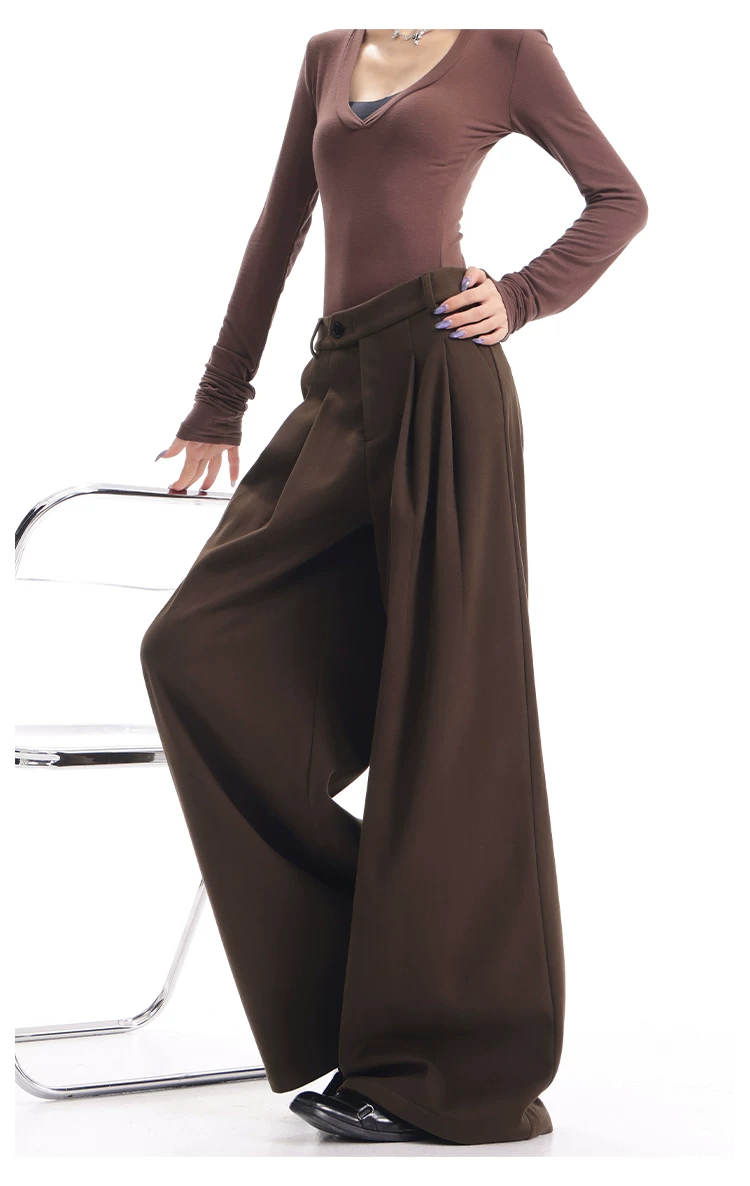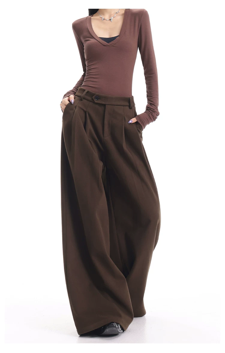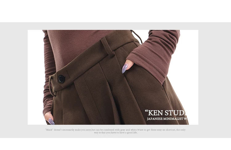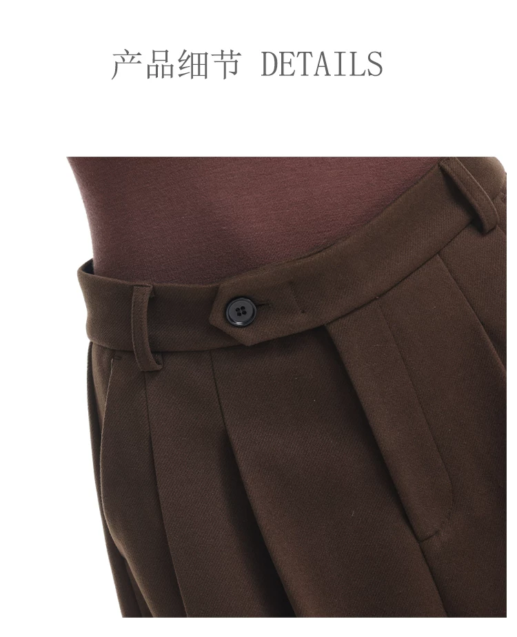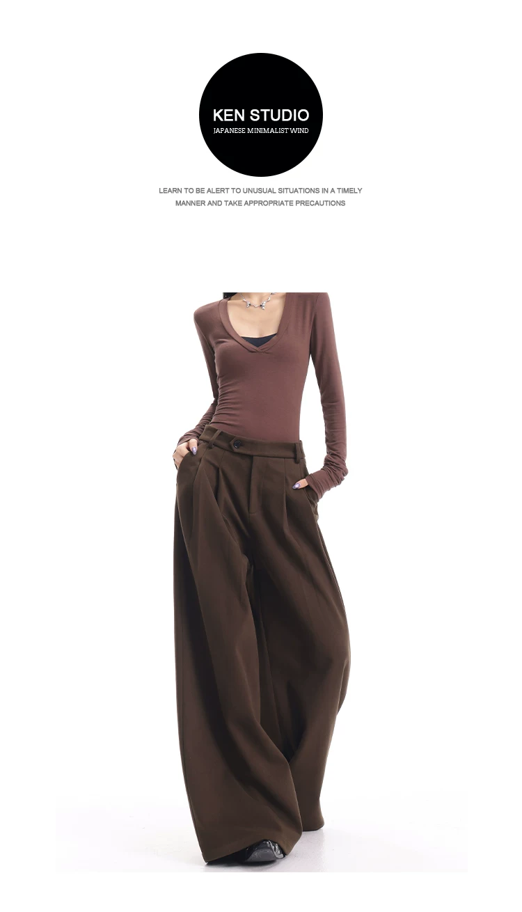 - KEN STUDIO Quần âu ống rộng màu cà phê mới dành cho nữ mùa thu đông, chất liệu len dày, xếp ly, quần dài đa năng.