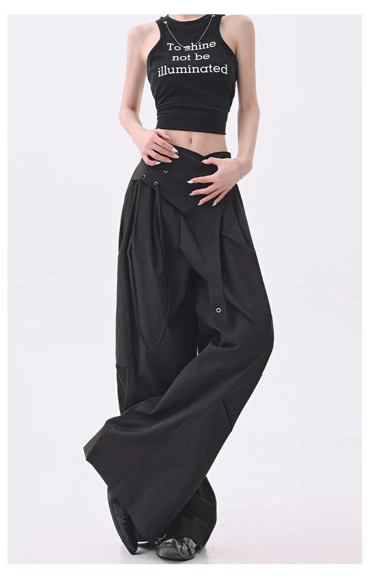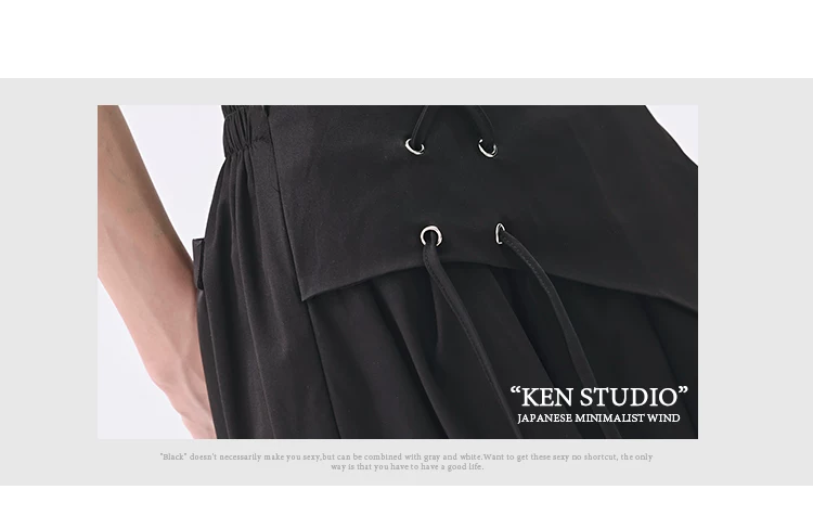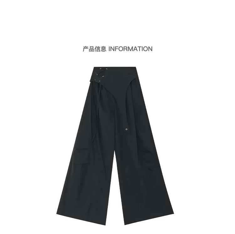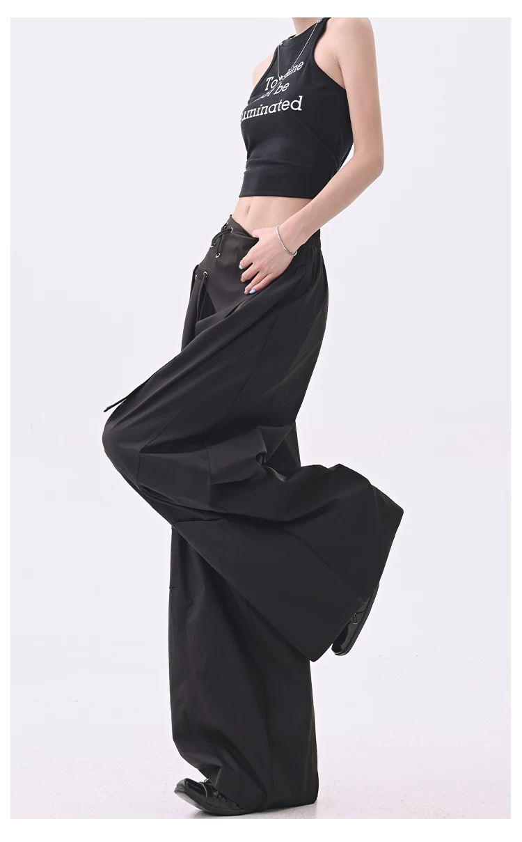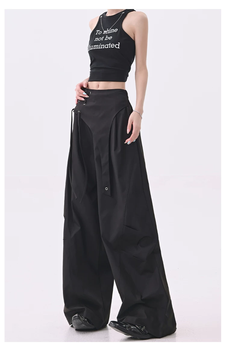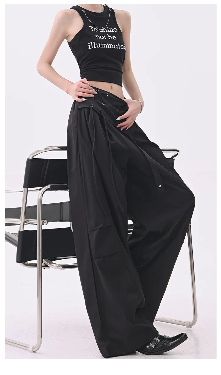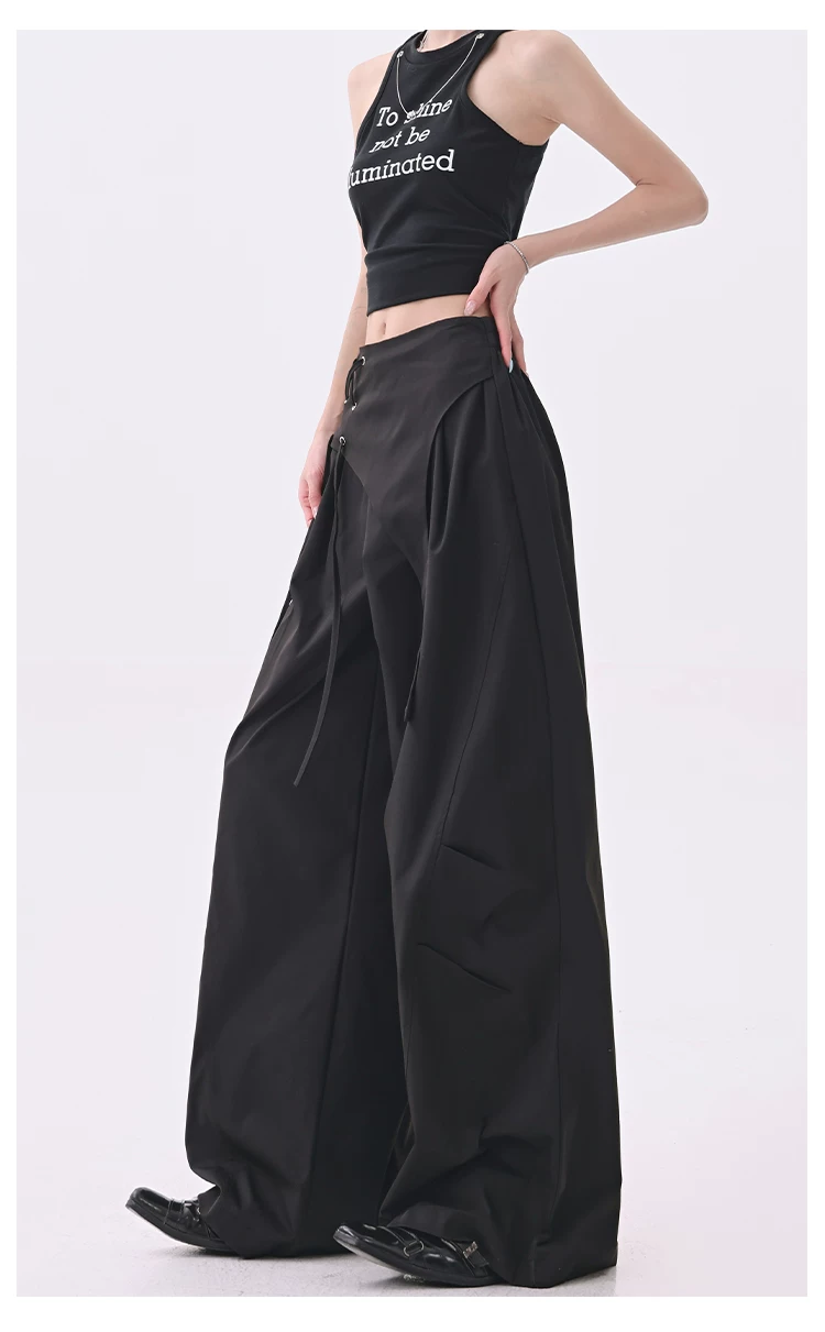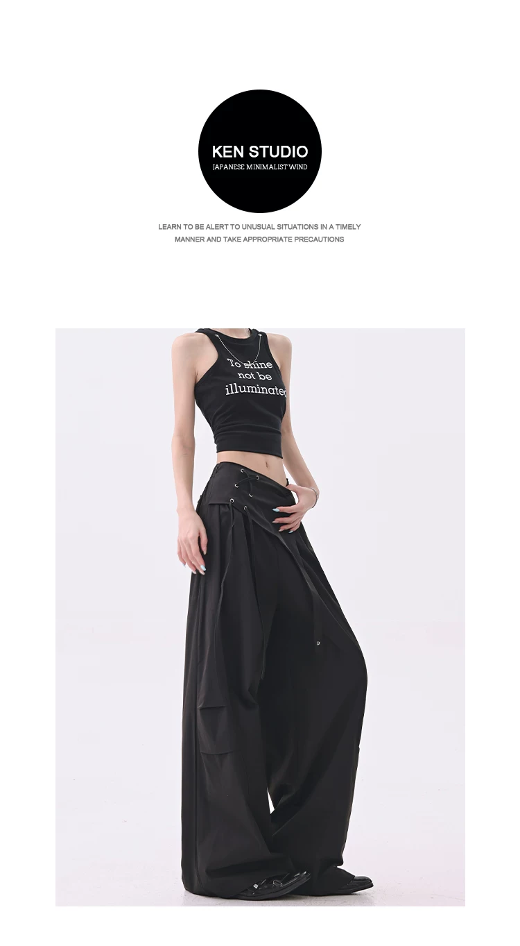 - KEN STUDIO quần âu thiết kế dây ruy băng màu đen dành cho nữ, quần ống rộng lưng cao đa năng mùa hè