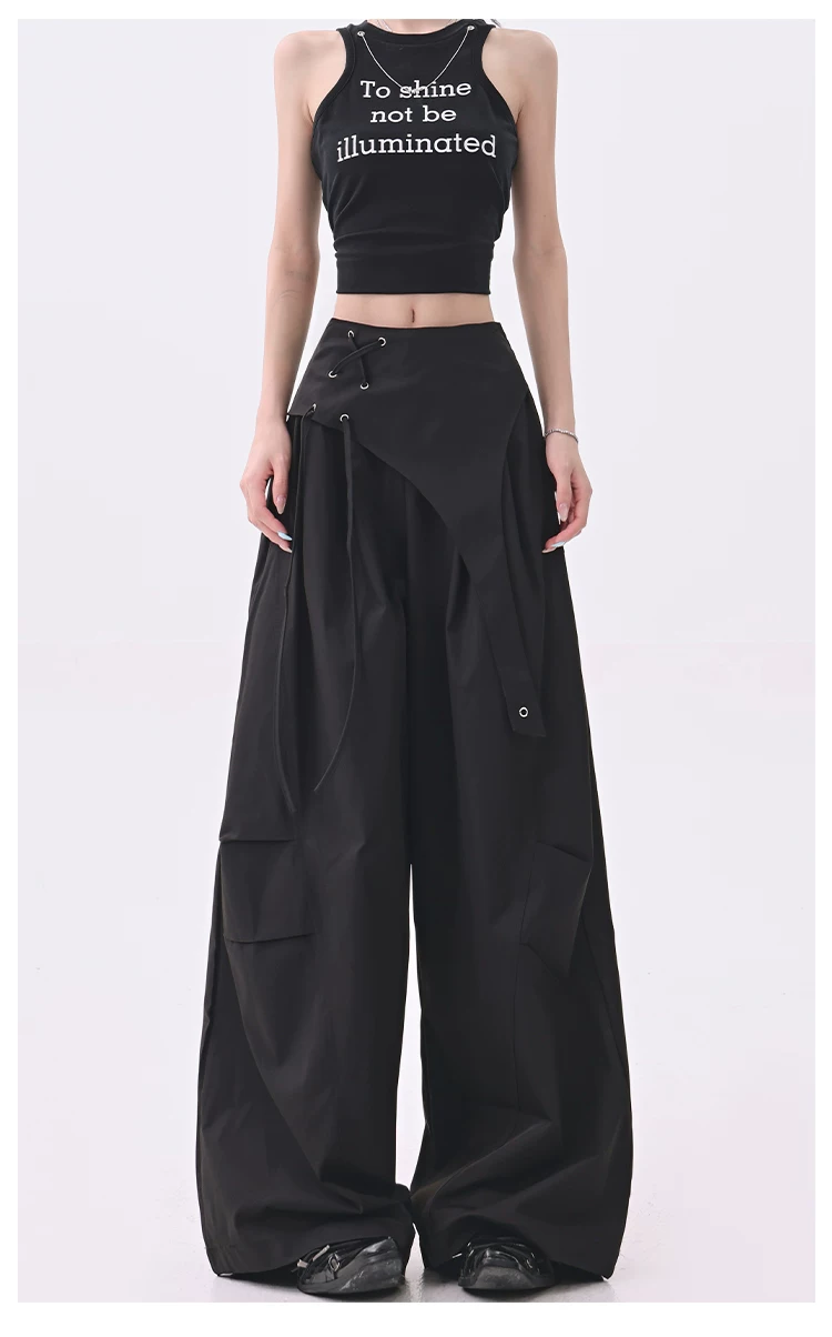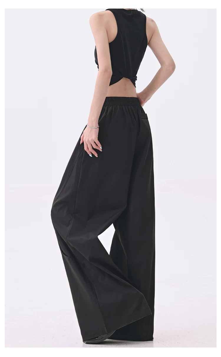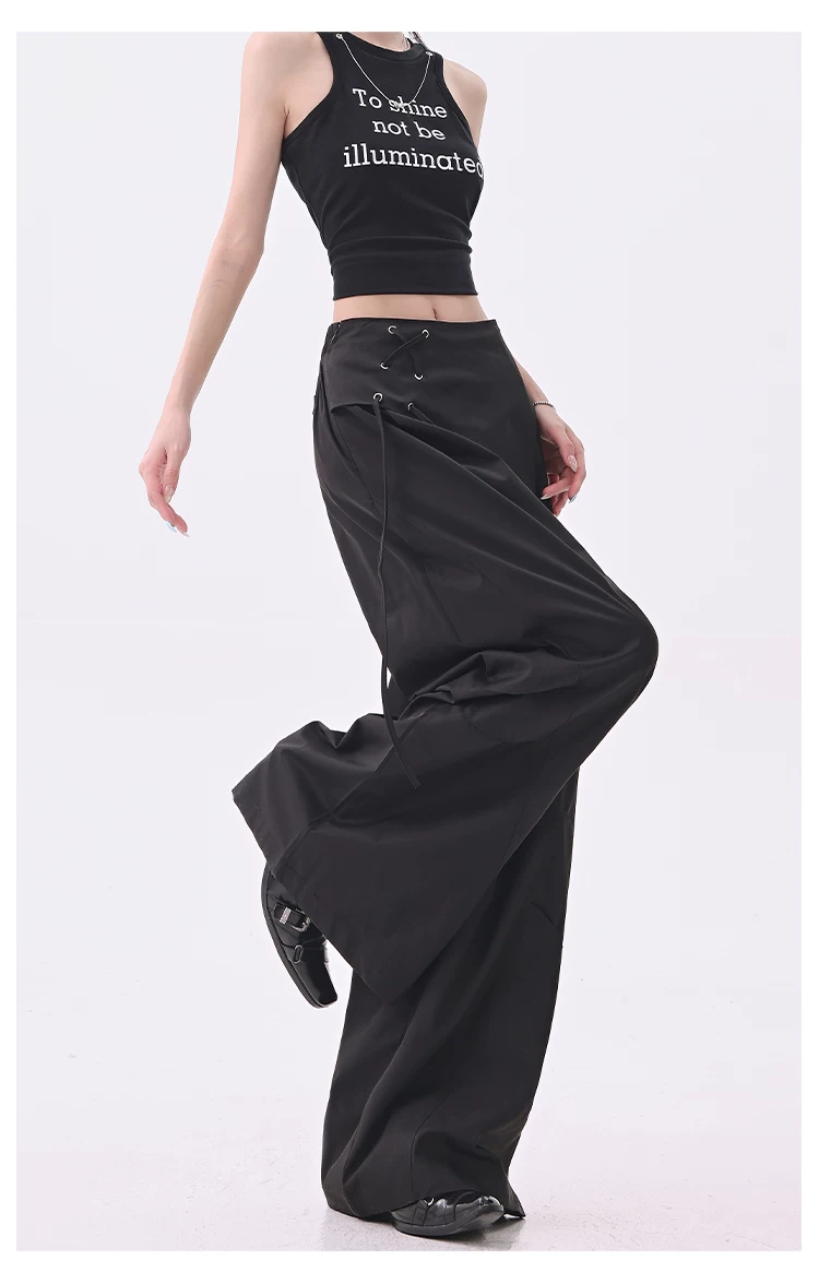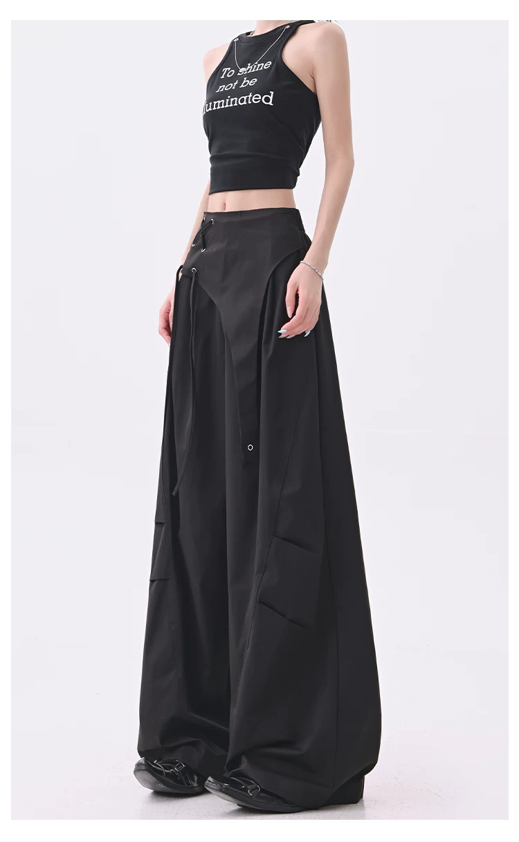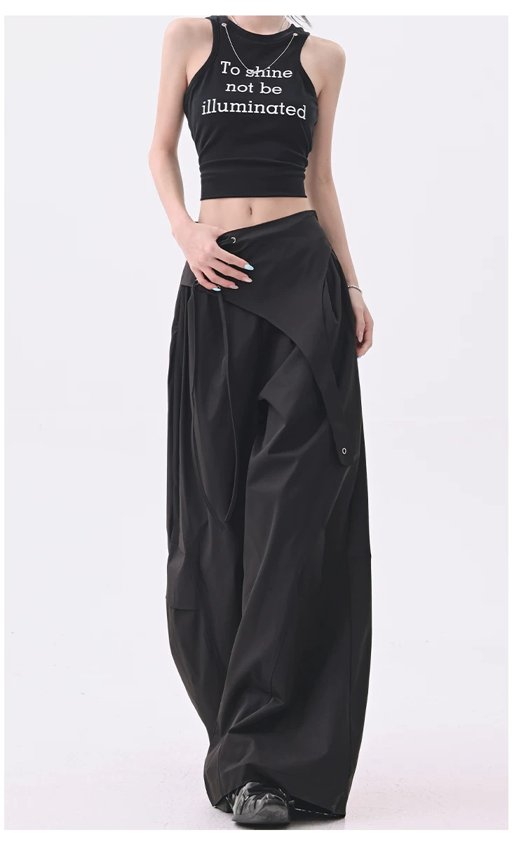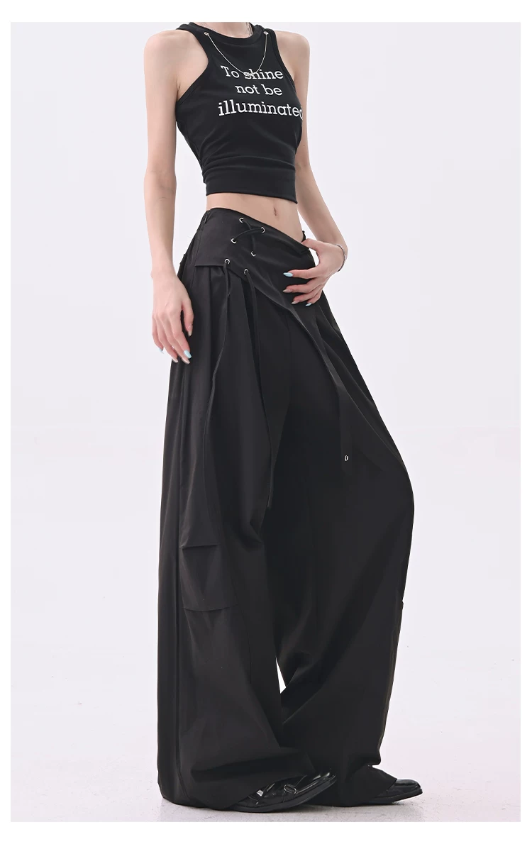 - KEN STUDIO quần âu thiết kế dây ruy băng màu đen dành cho nữ, quần ống rộng lưng cao đa năng mùa hè