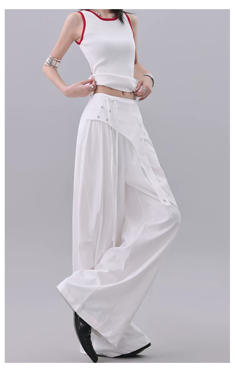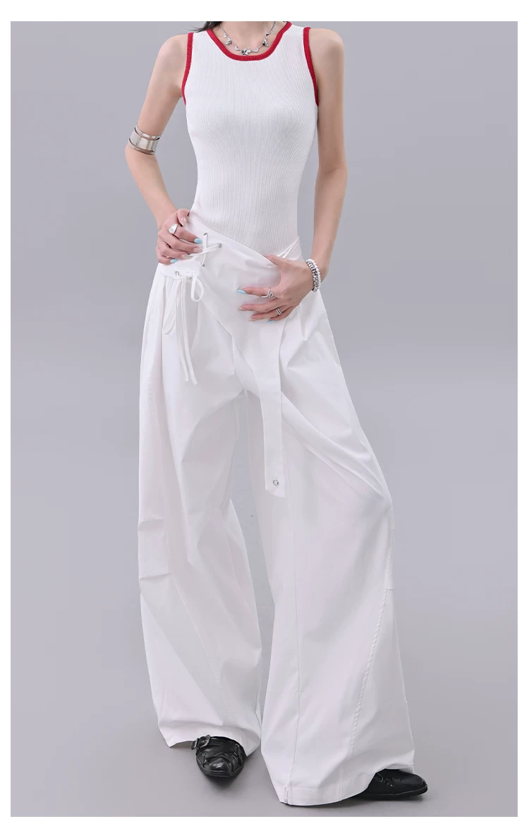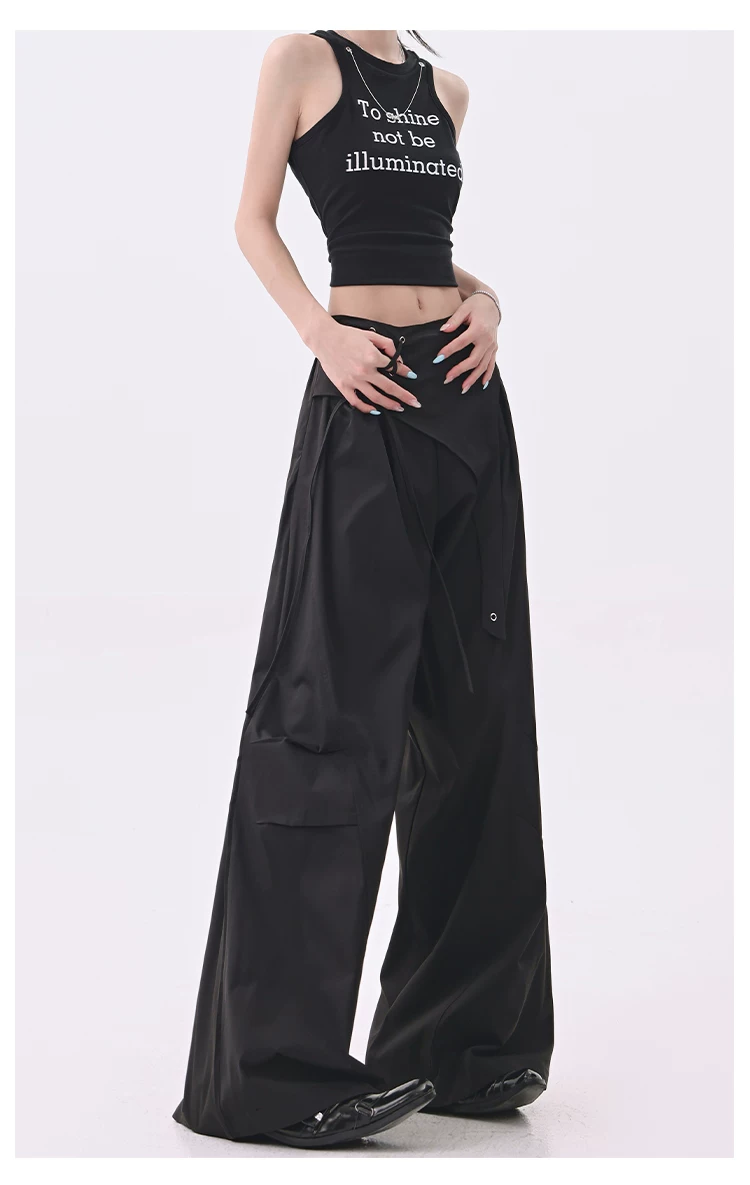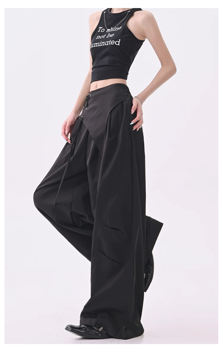 KEN STUDIO quần âu thiết kế dây ruy băng màu đen dành cho nữ, quần ống rộng lưng cao đa năng mùa hè