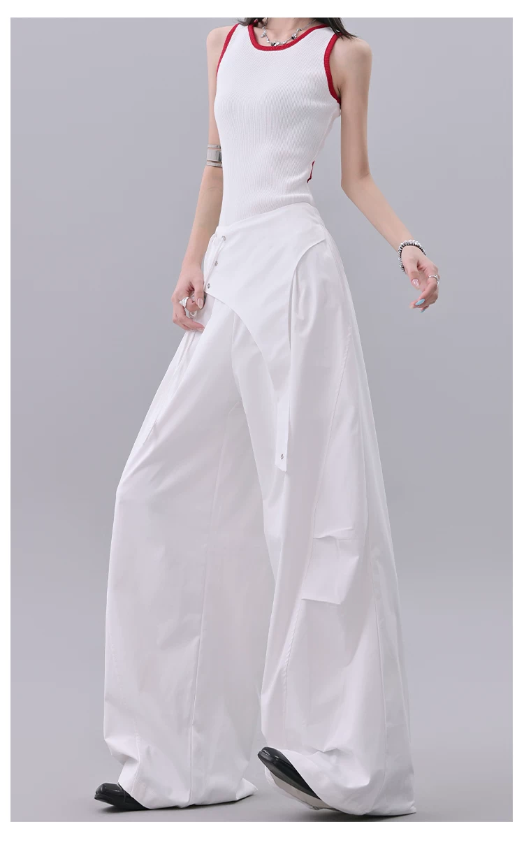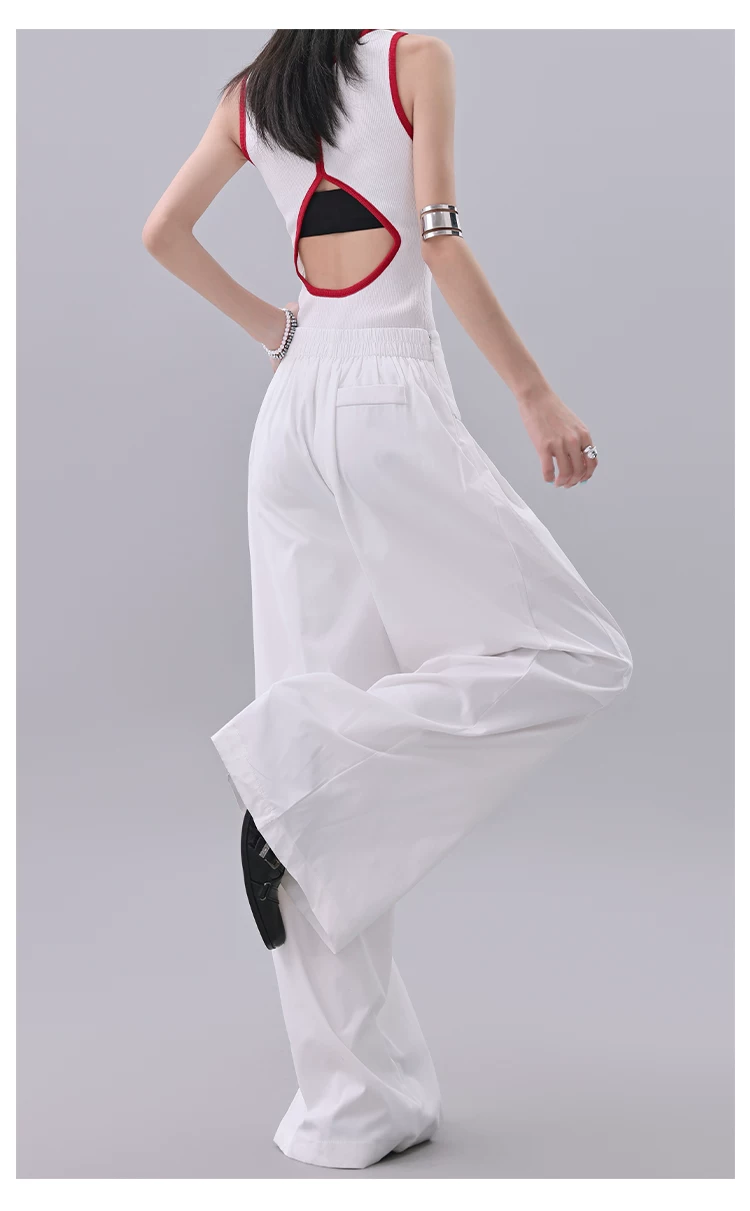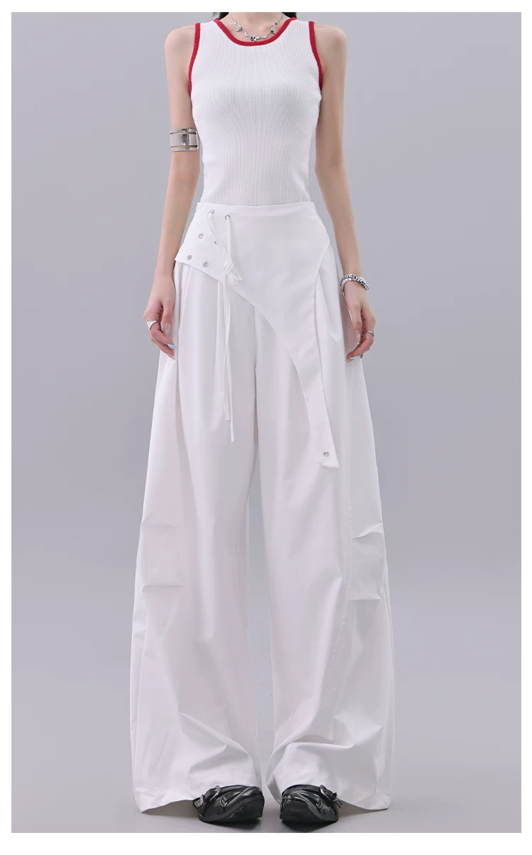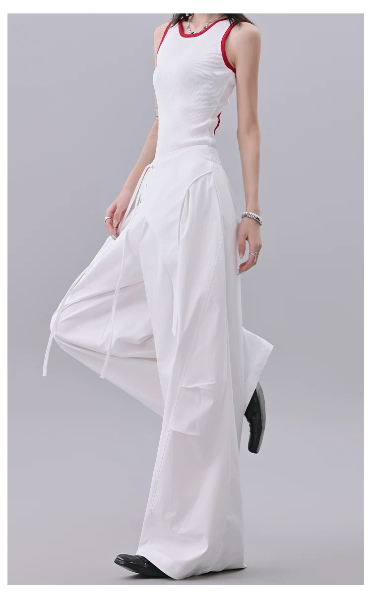 KEN STUDIO quần âu thiết kế dây ruy băng màu đen dành cho nữ, quần ống rộng lưng cao đa năng mùa hè