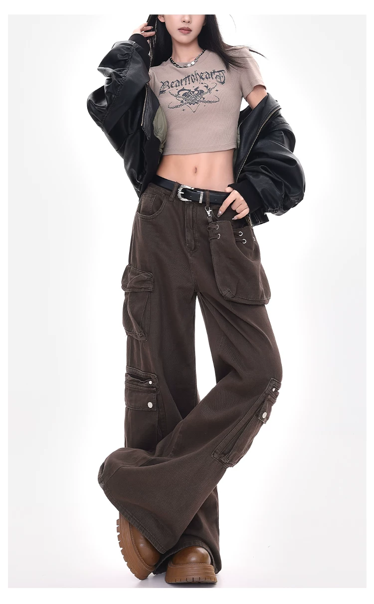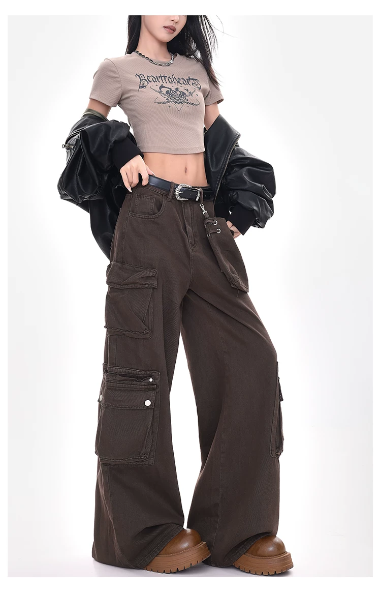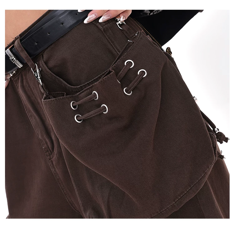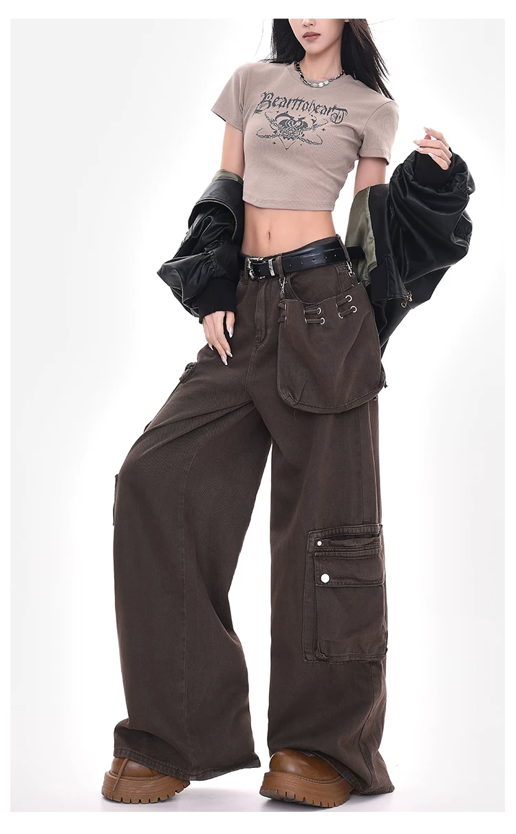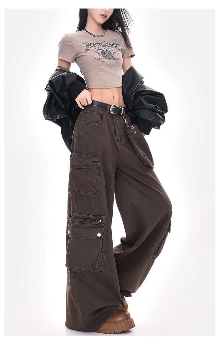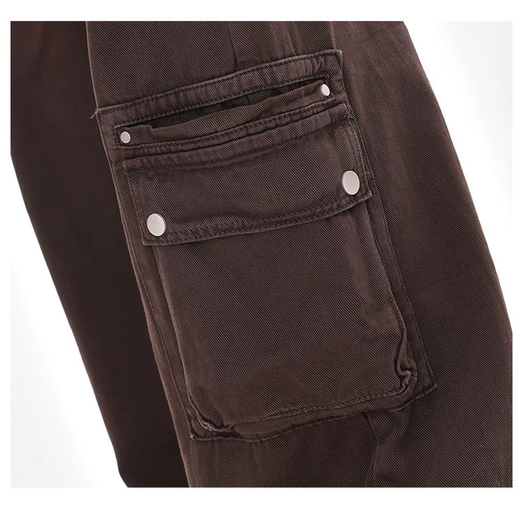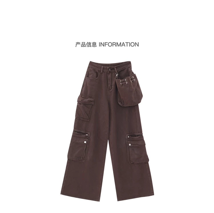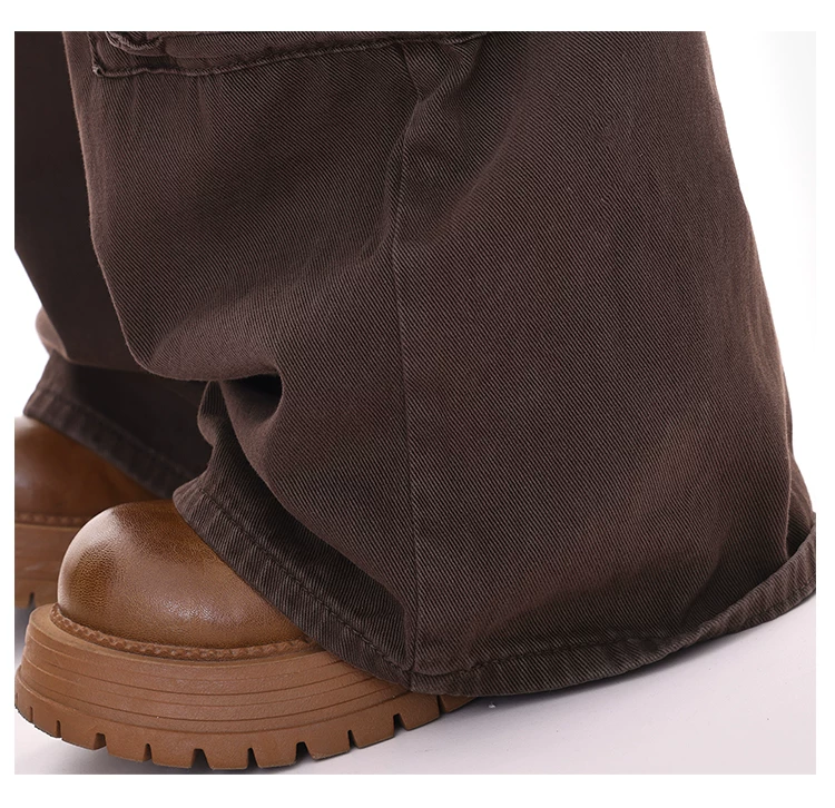 - KEN STUDIO quần cargo màu cà phê mới đầu thu dành cho nữ, quần ống rộng thiết kế cổ điển kiểu Mỹ.