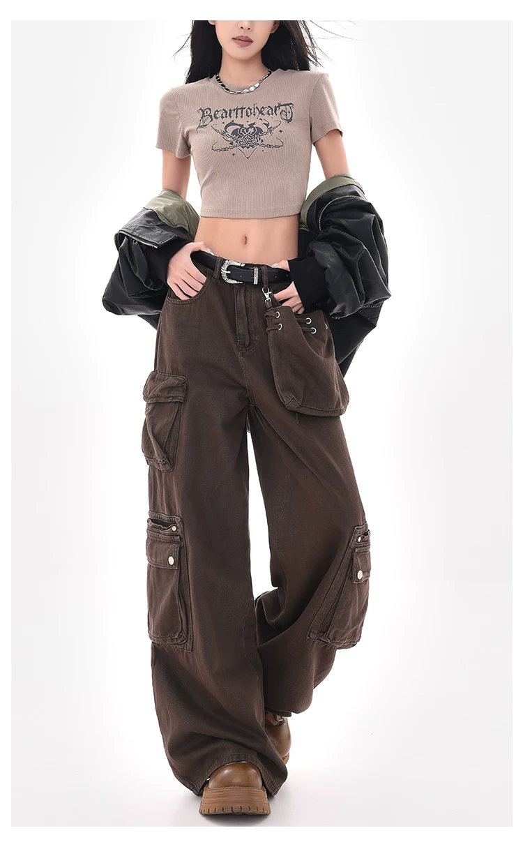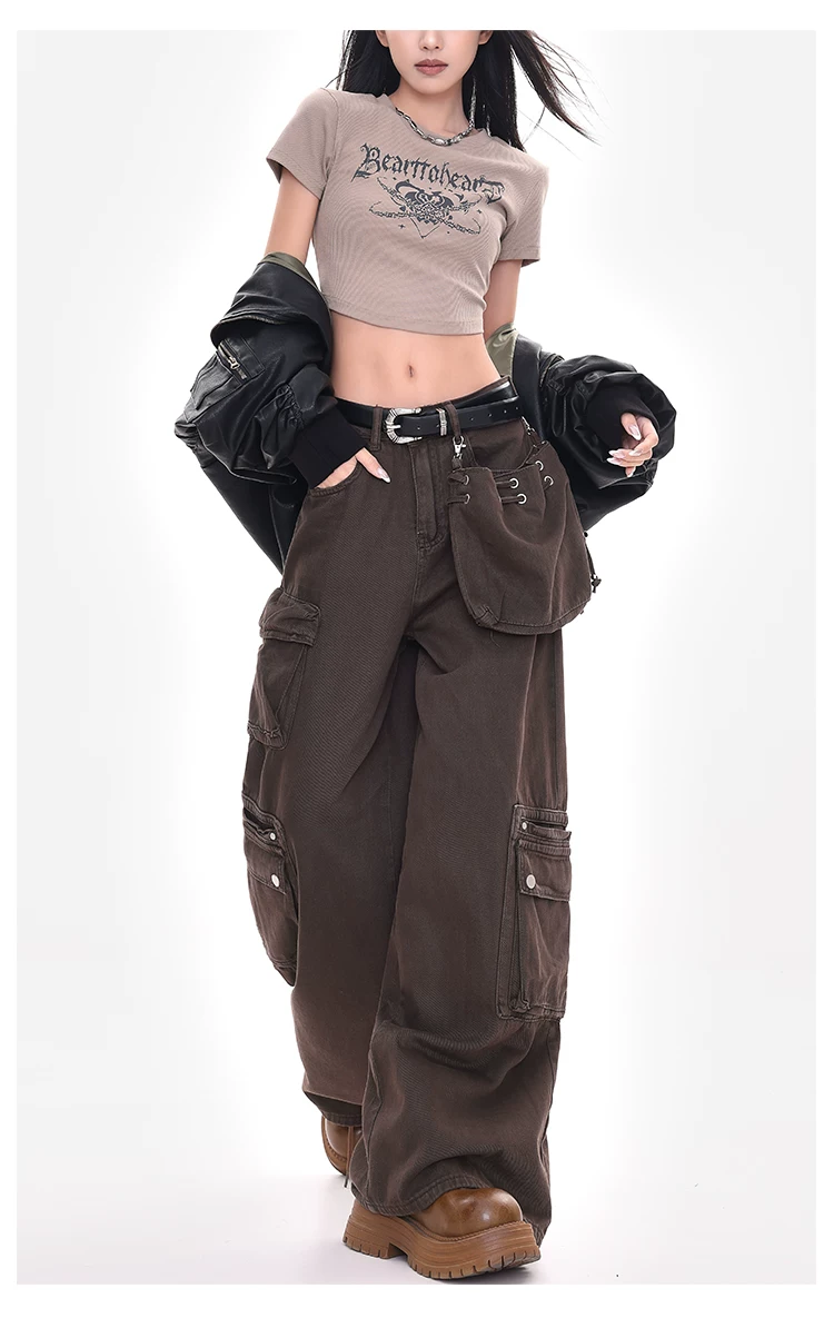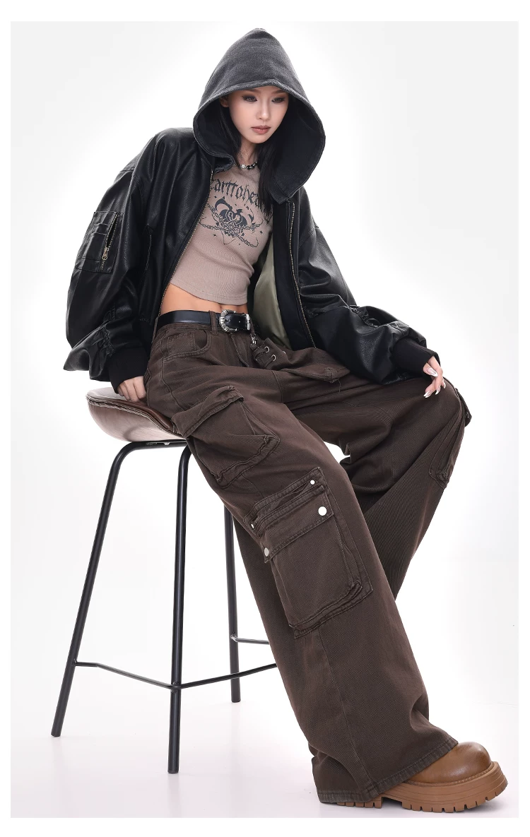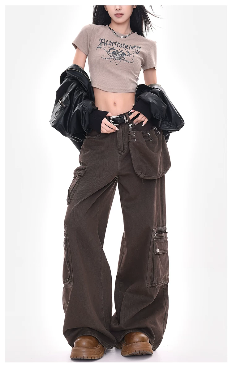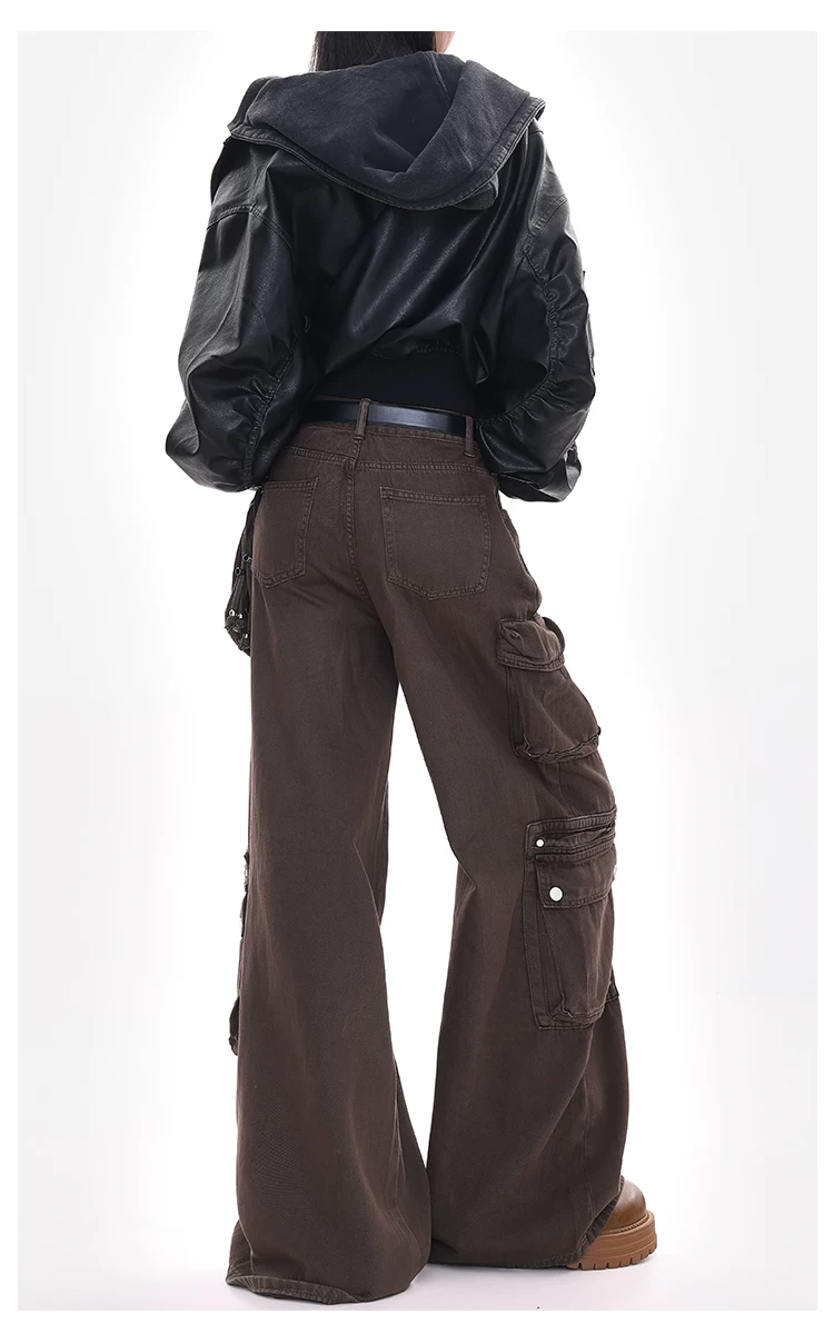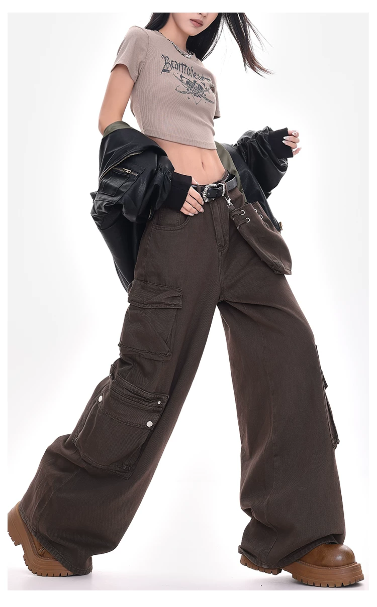 - KEN STUDIO quần cargo màu cà phê mới đầu thu dành cho nữ, quần ống rộng thiết kế cổ điển kiểu Mỹ.