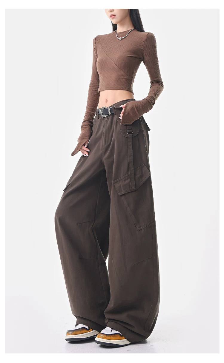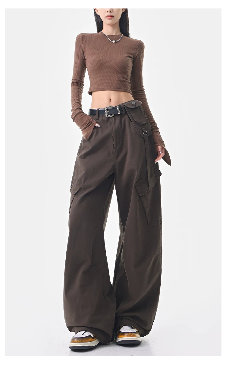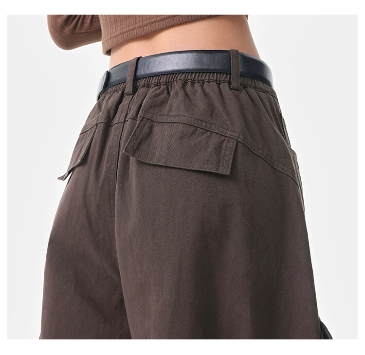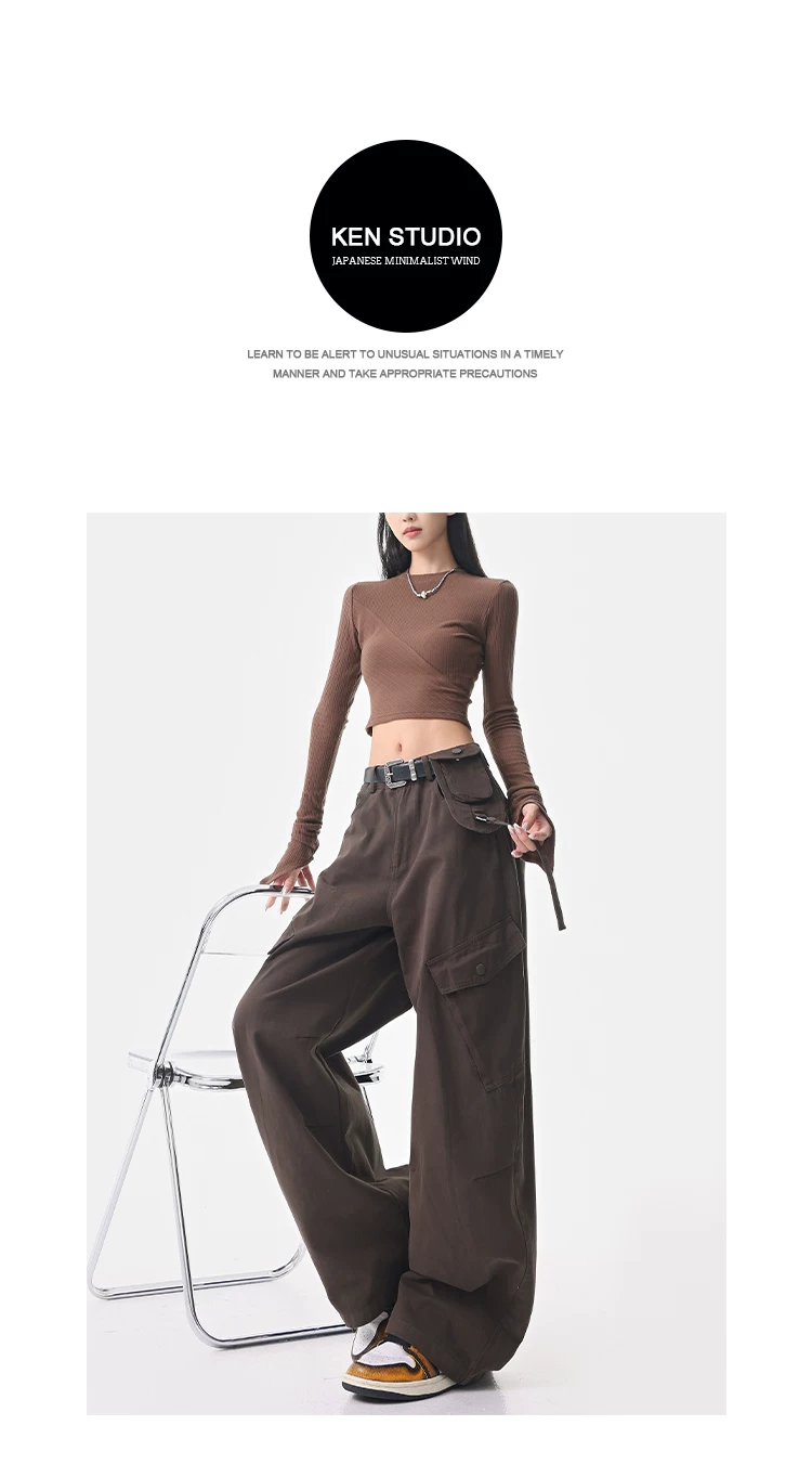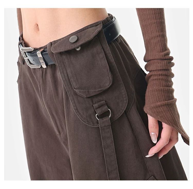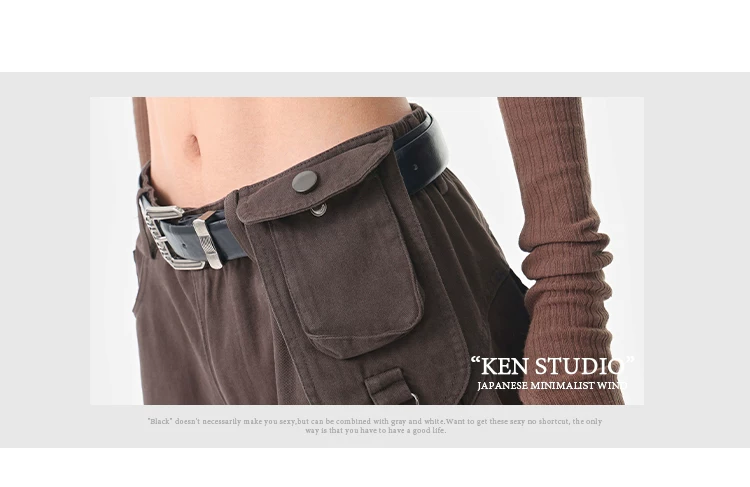 - KEN STUDIO Quần cargo màu xám thu đông mới dành cho nữ với thiết kế túi chéo, quần ống rộng, quần kiểu scimitar