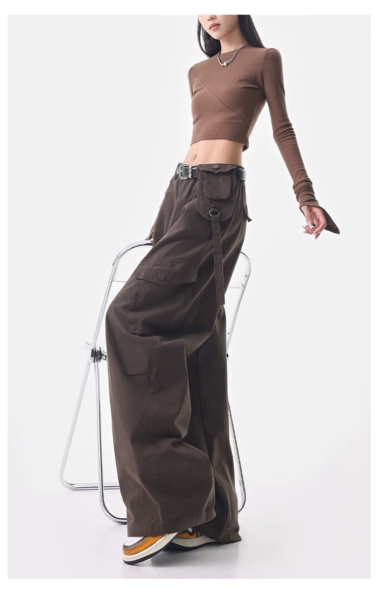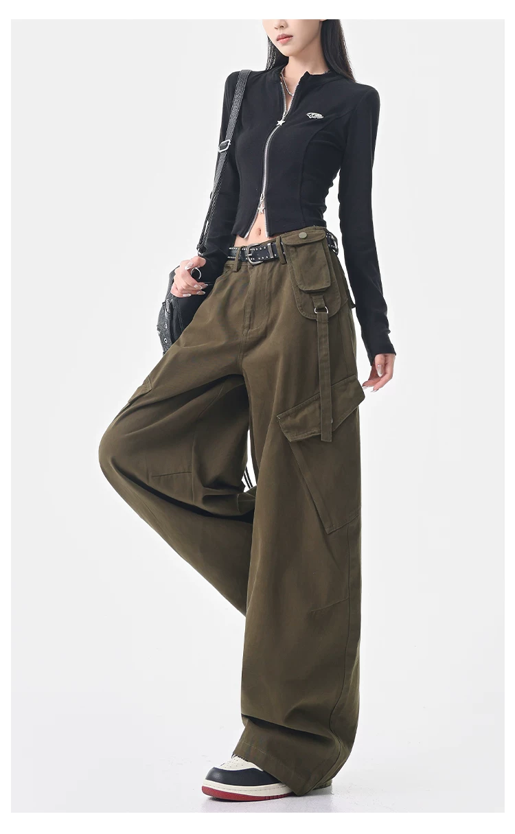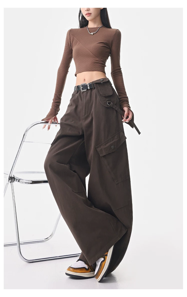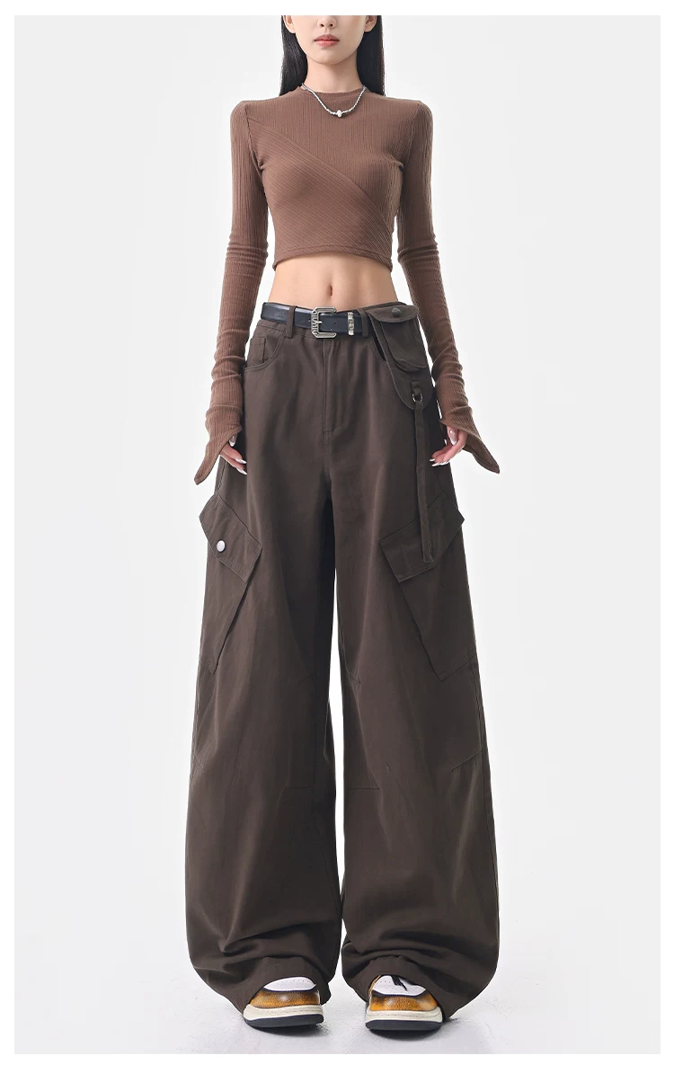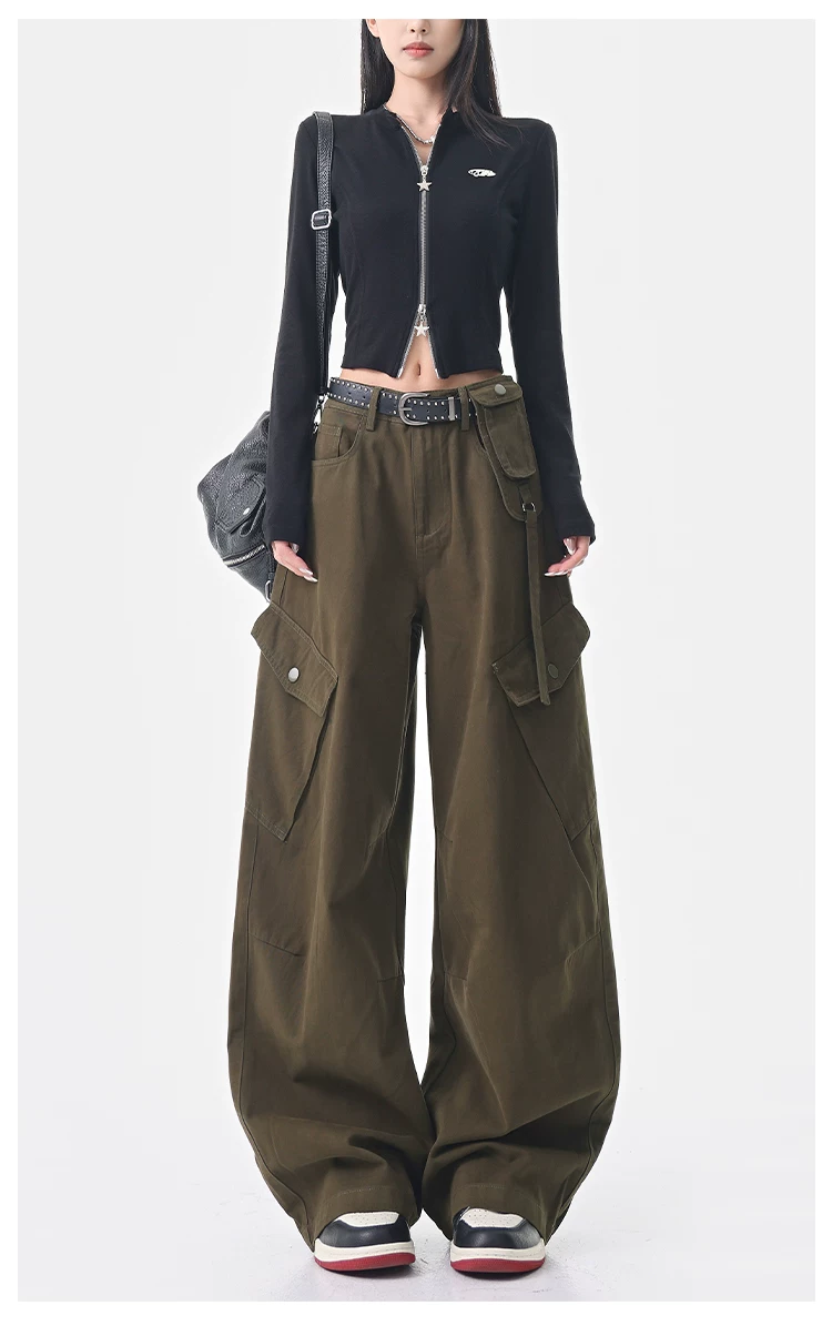 - KEN STUDIO Quần cargo màu xám thu đông mới dành cho nữ với thiết kế túi chéo, quần ống rộng, quần kiểu scimitar