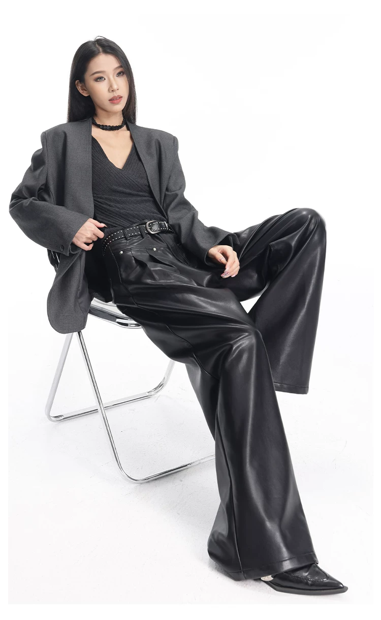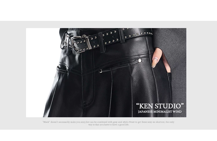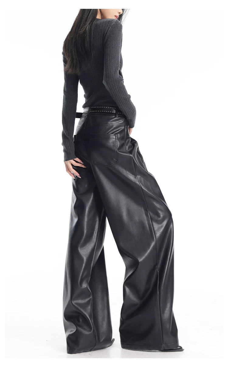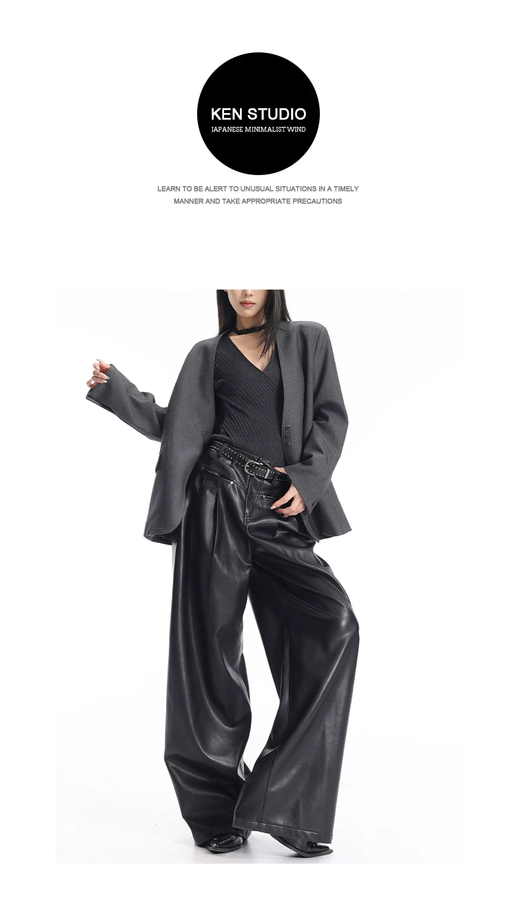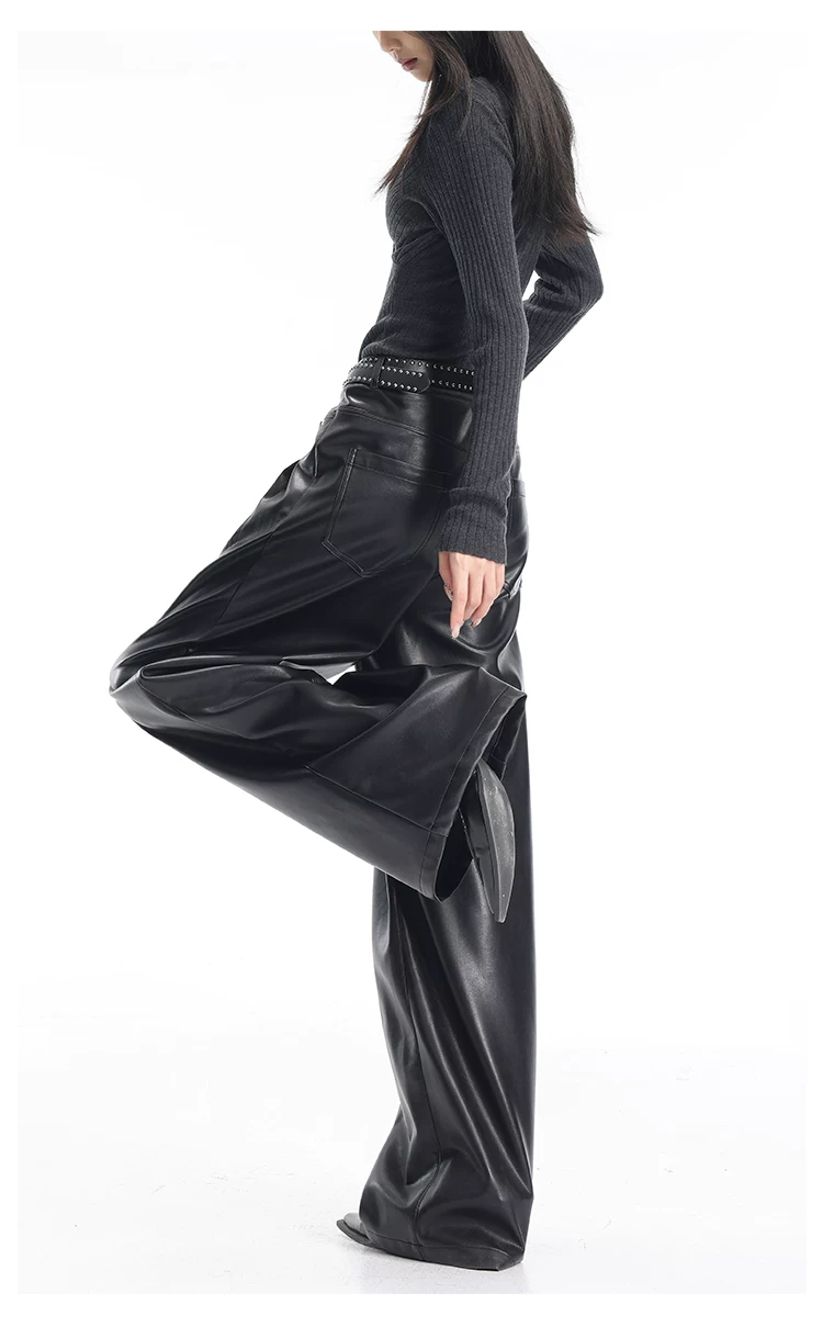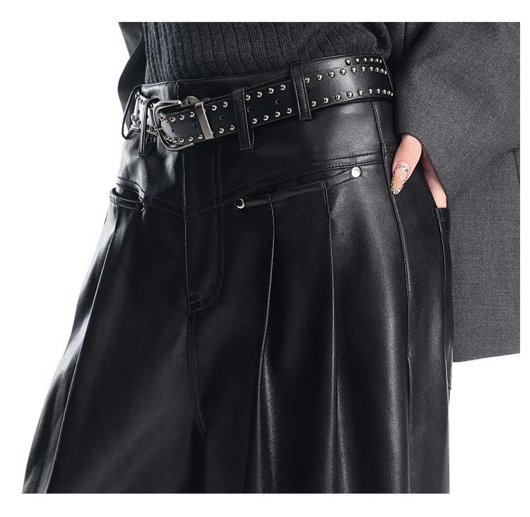 - KEN STUDIO Quần da PU màu đen thu đông mới dành cho nữ với thiết kế đinh tán, dáng rộng và đa năng, quần ống rộng giúp thon gọn