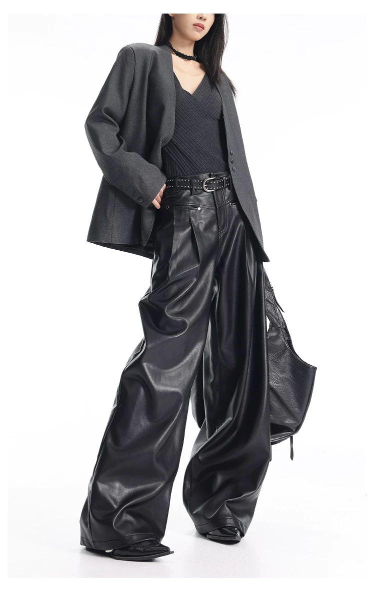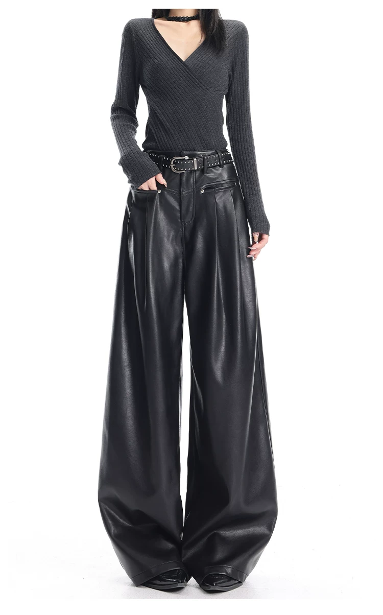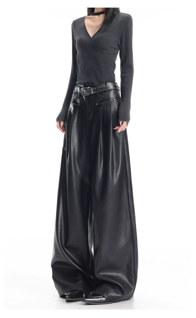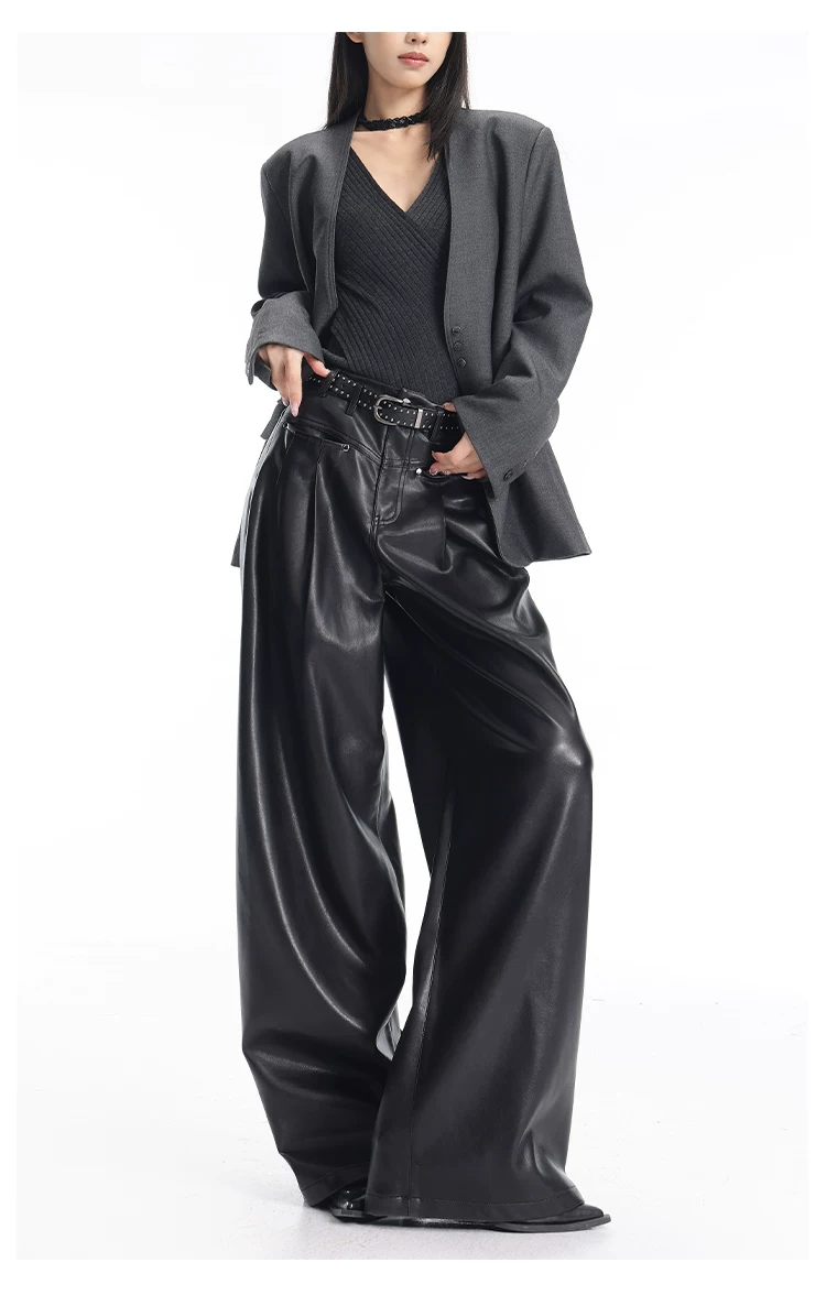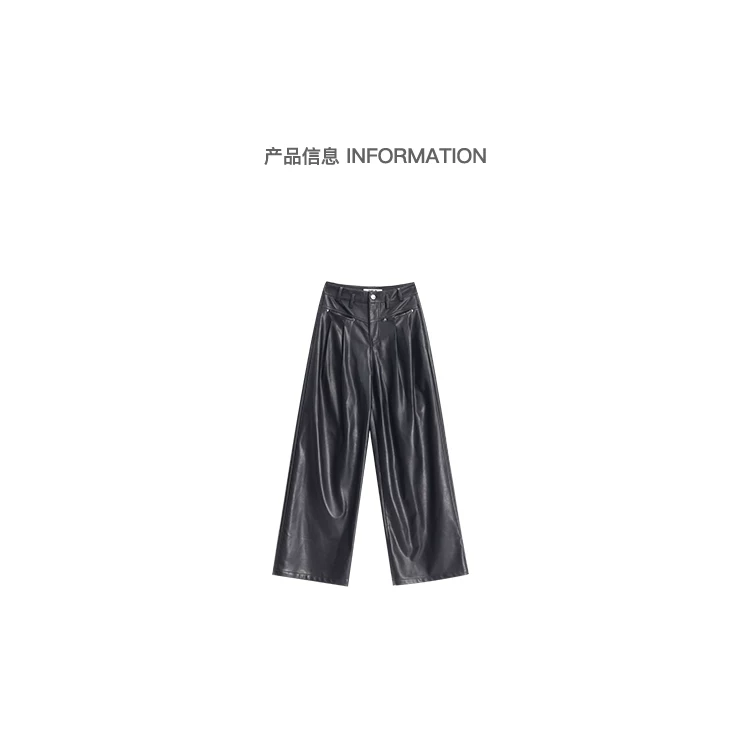- KEN STUDIO Quần da PU màu đen thu đông mới dành cho nữ với thiết kế đinh tán, dáng rộng và đa năng, quần ống rộng giúp thon gọn