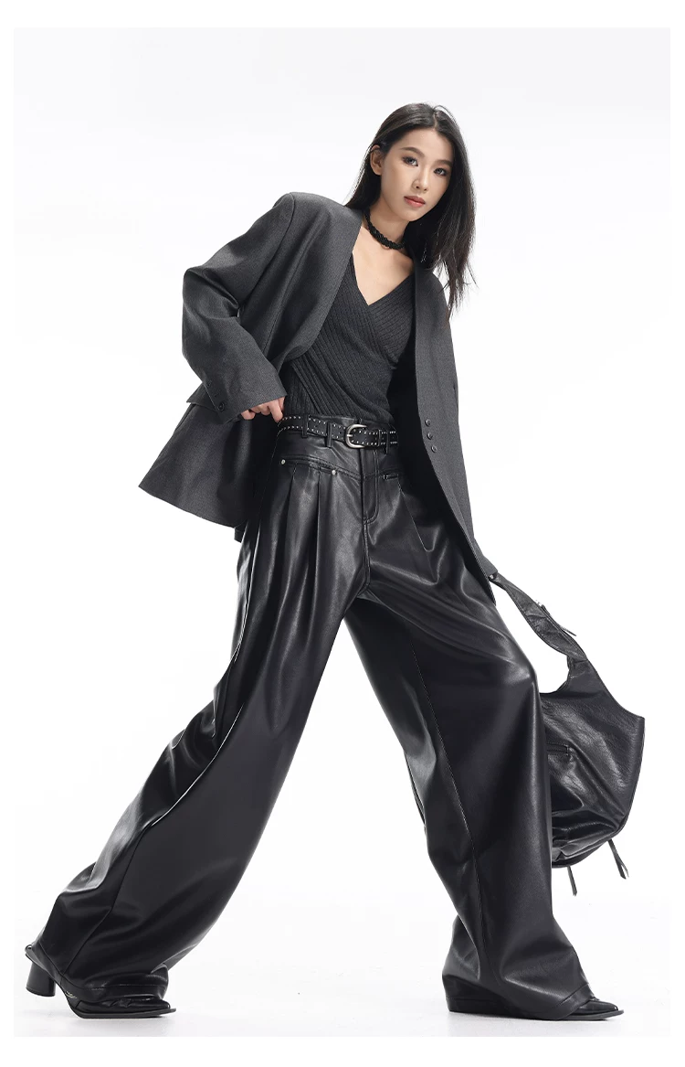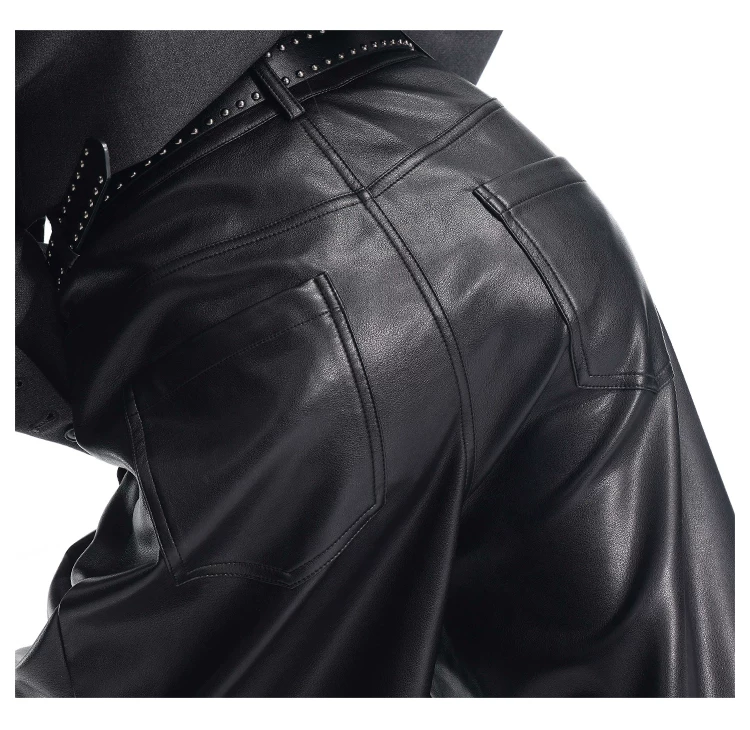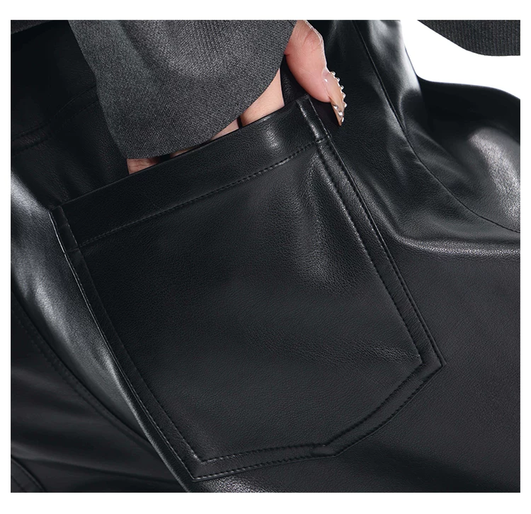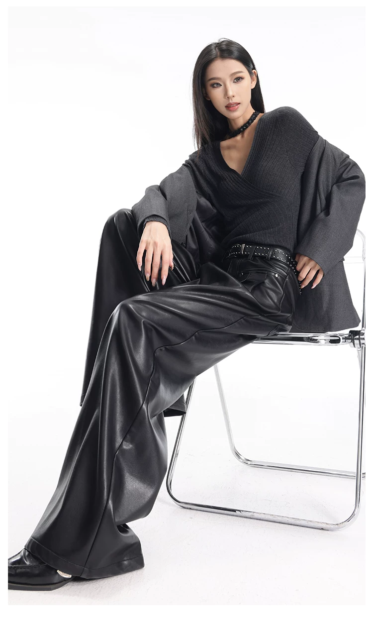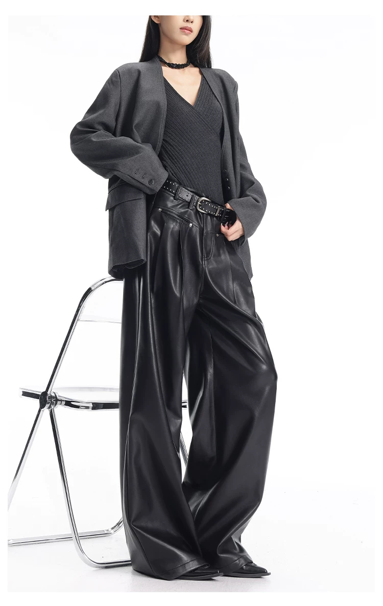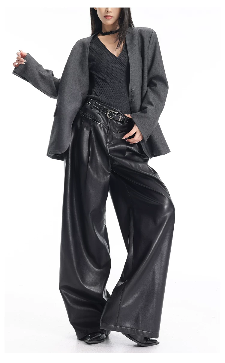 - KEN STUDIO Quần da PU màu đen thu đông mới dành cho nữ với thiết kế đinh tán, dáng rộng và đa năng, quần ống rộng giúp thon gọn
