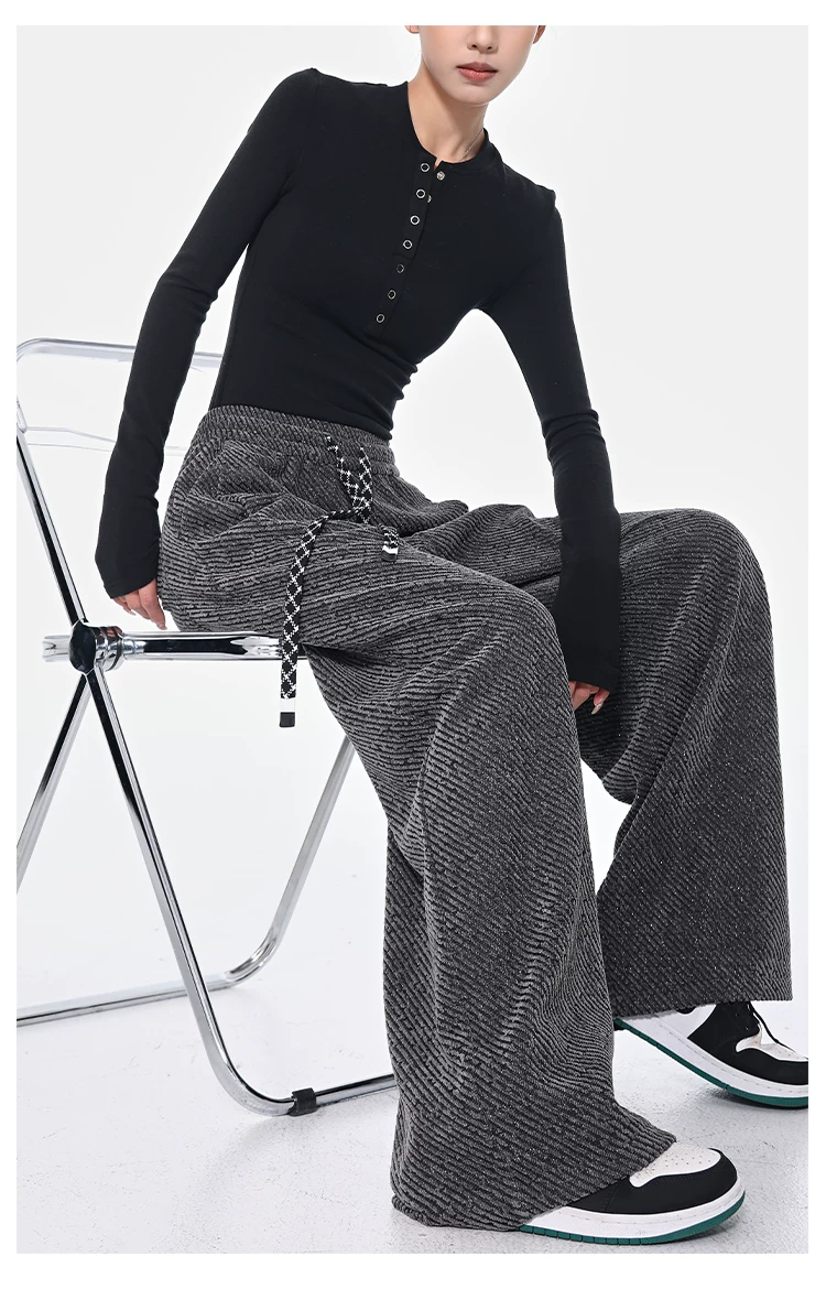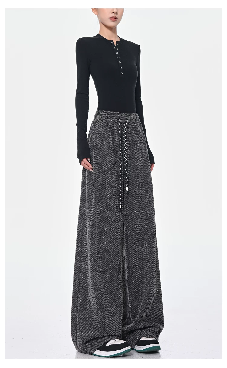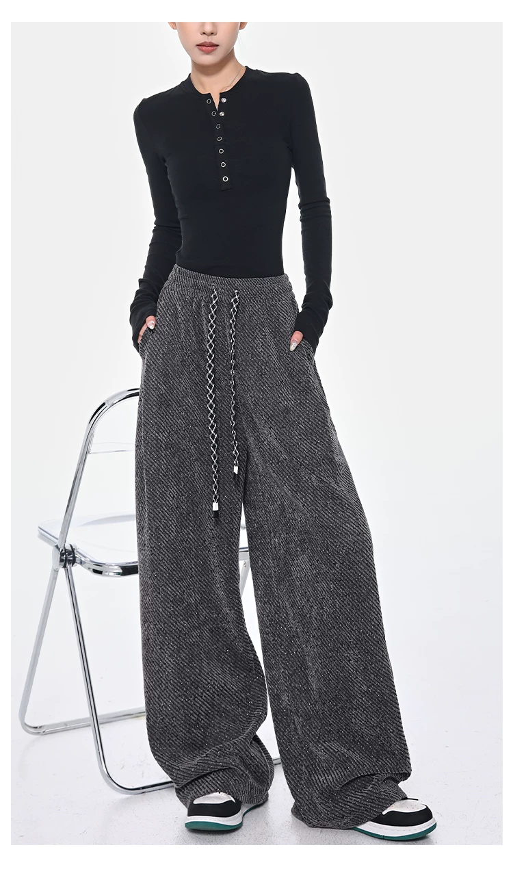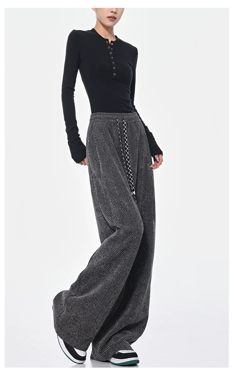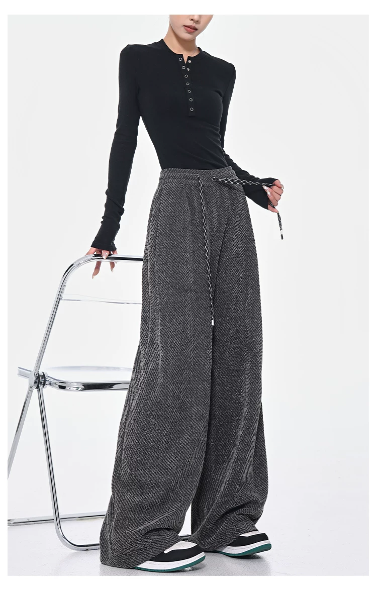 - KEN STUDIO quần dài có dây rút lót lông cừu mùa thu đông màu xám bầu trời đầy sao dành cho nữ, quần ống rộng dáng rộng giảm béo
