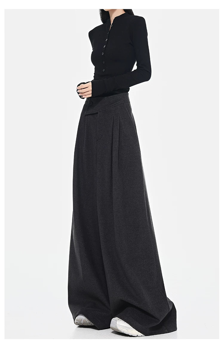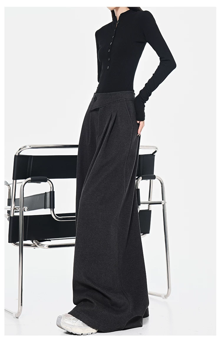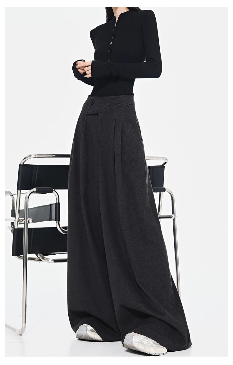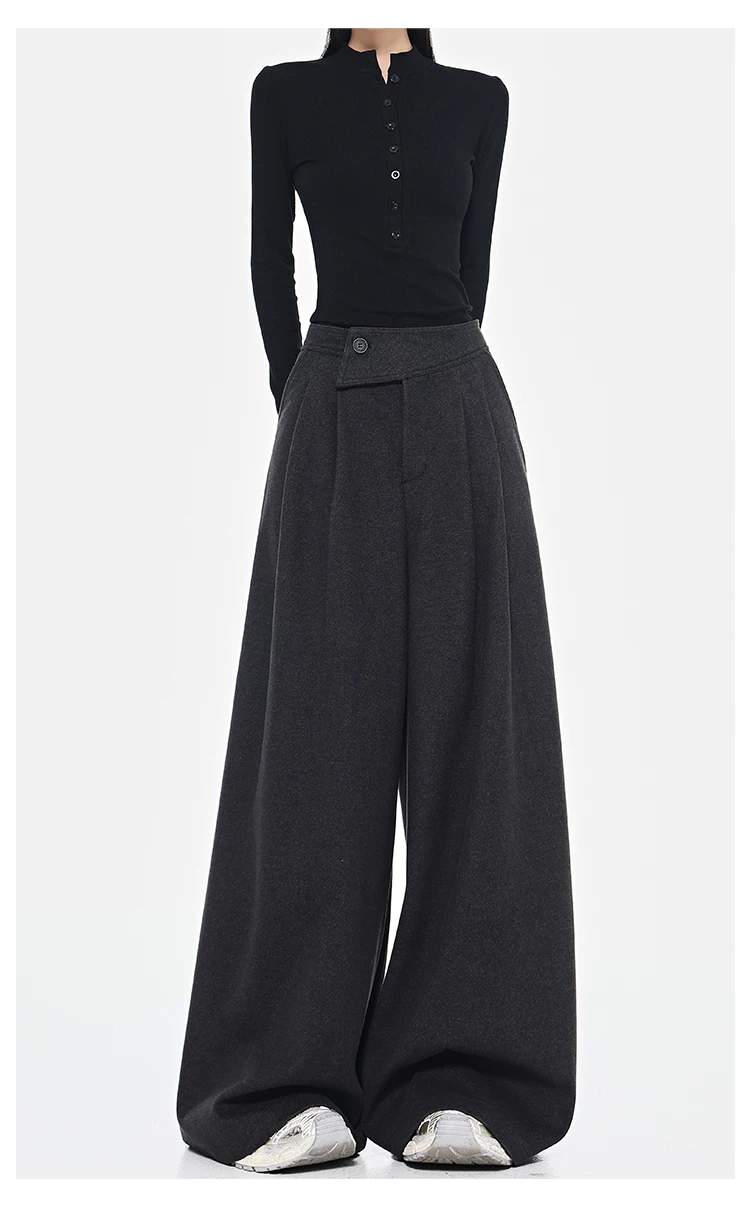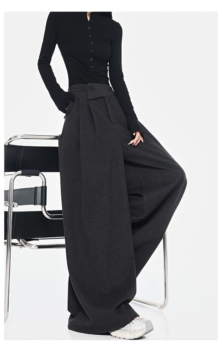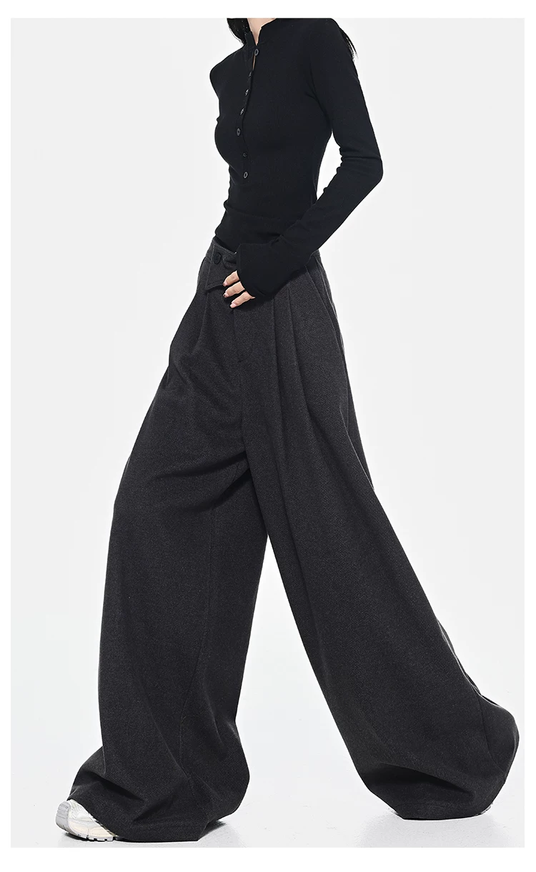 - KEN STUDIO Quần dài ống rộng màu xám thu đông mới dành cho nữ, quần dài dáng rộng đa năng lưng cao