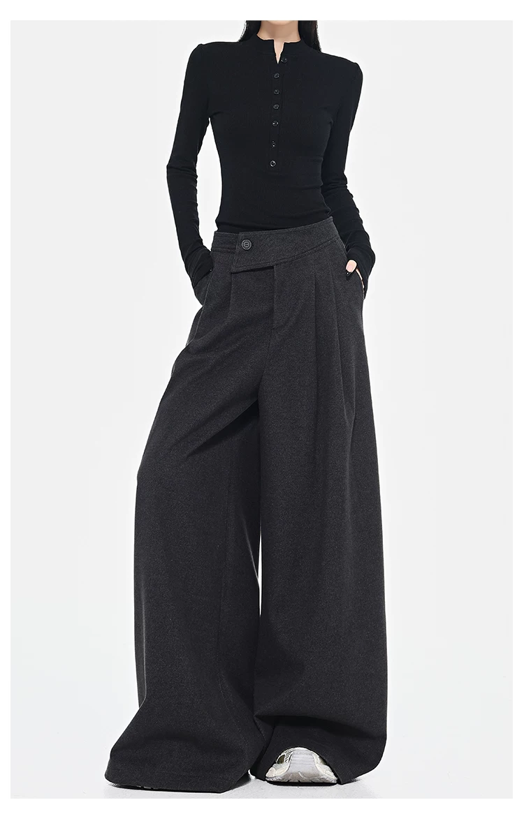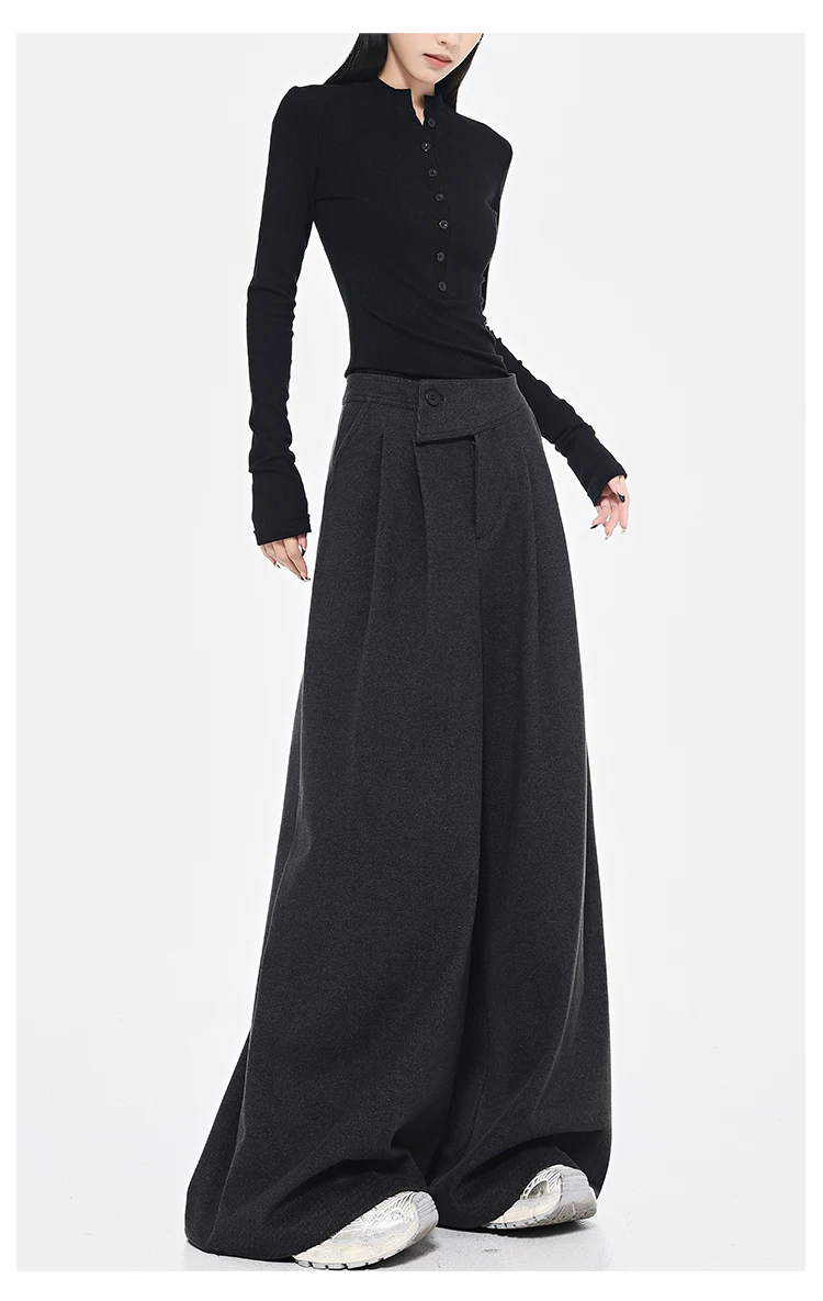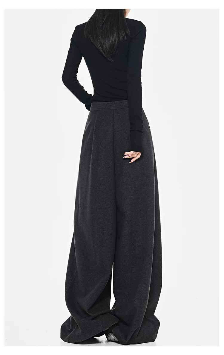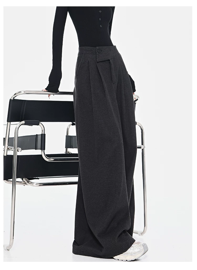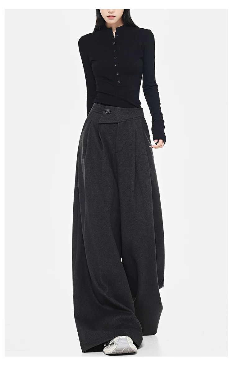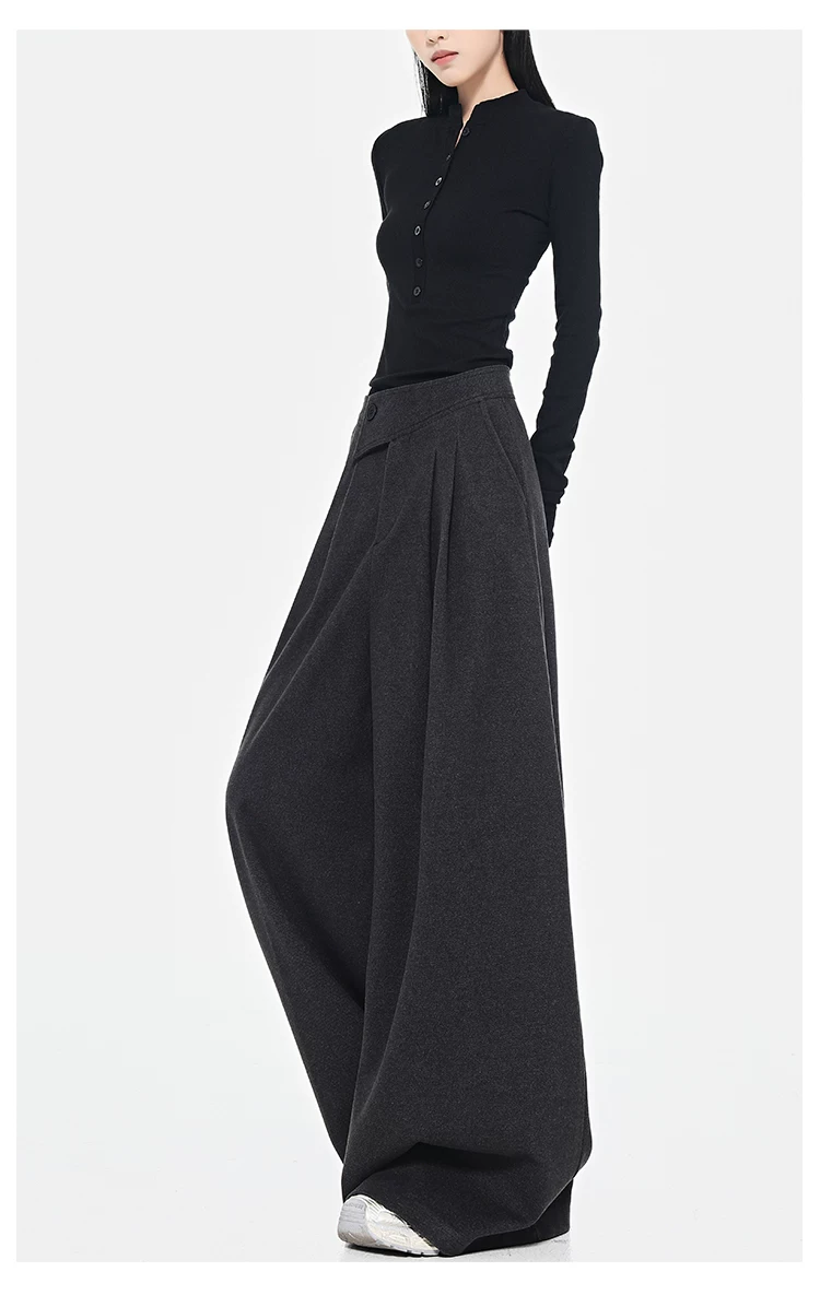 - KEN STUDIO Quần dài ống rộng màu xám thu đông mới dành cho nữ, quần dài dáng rộng đa năng lưng cao