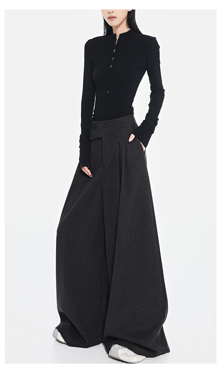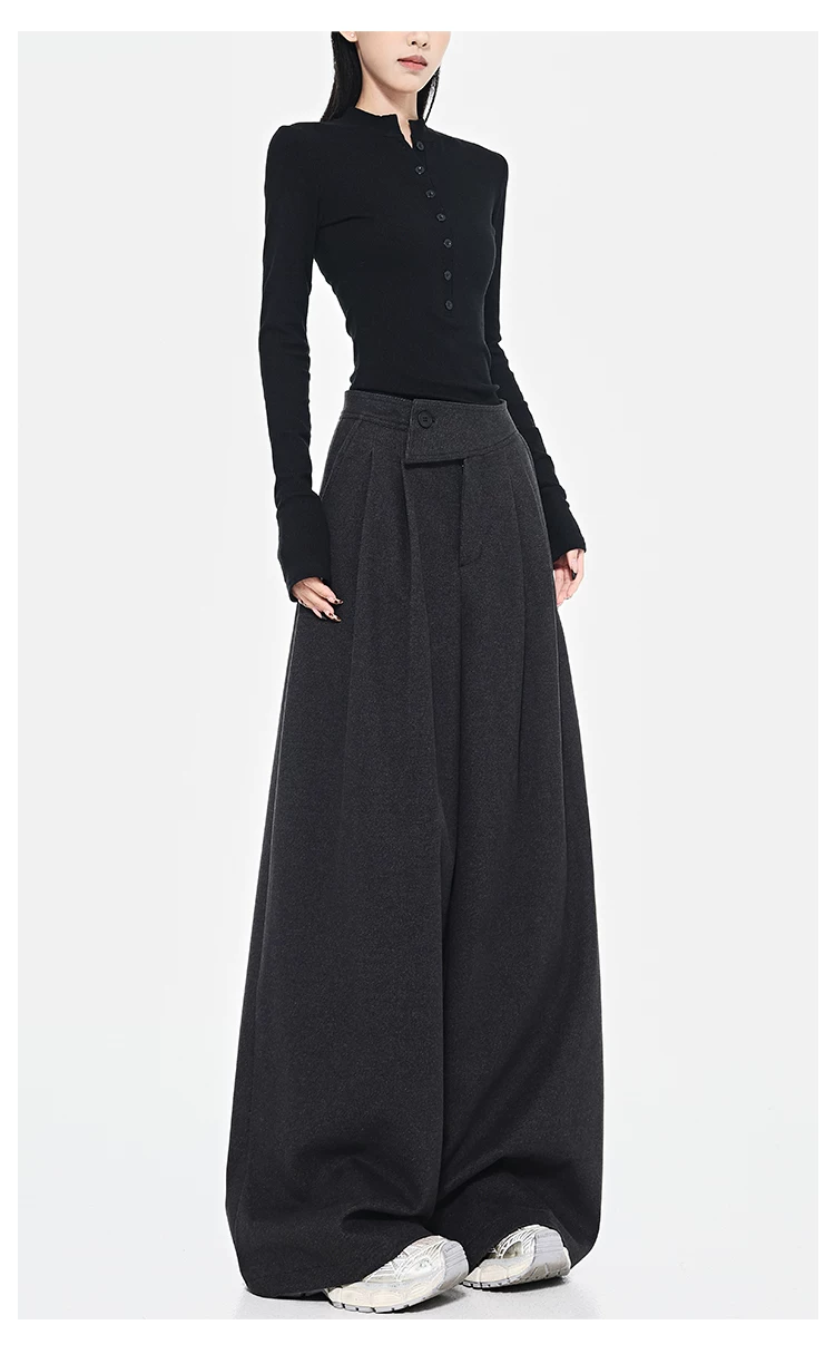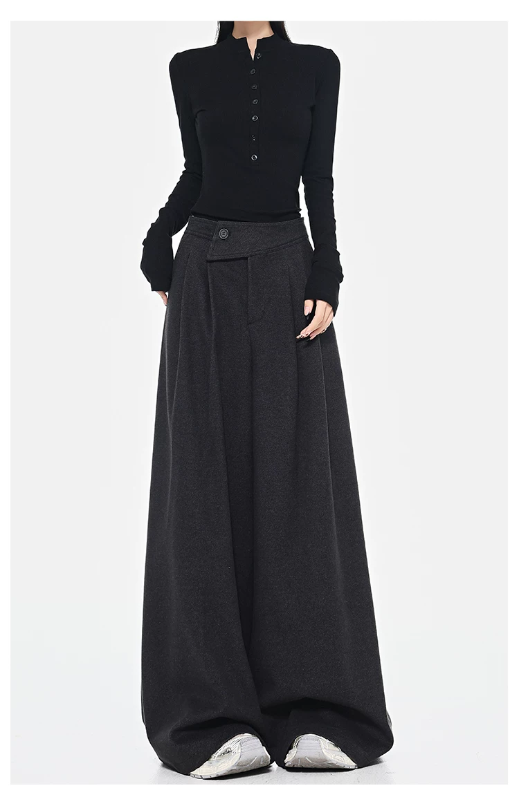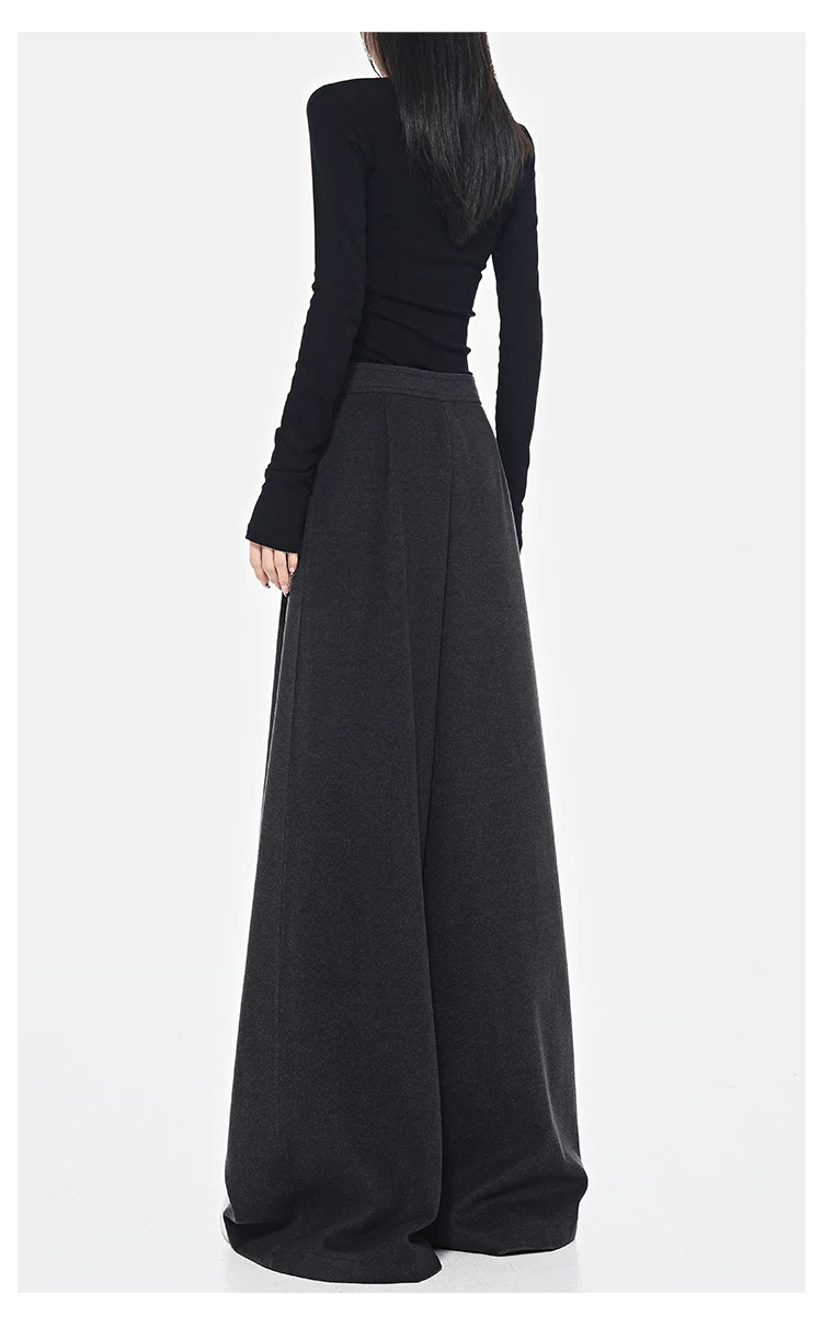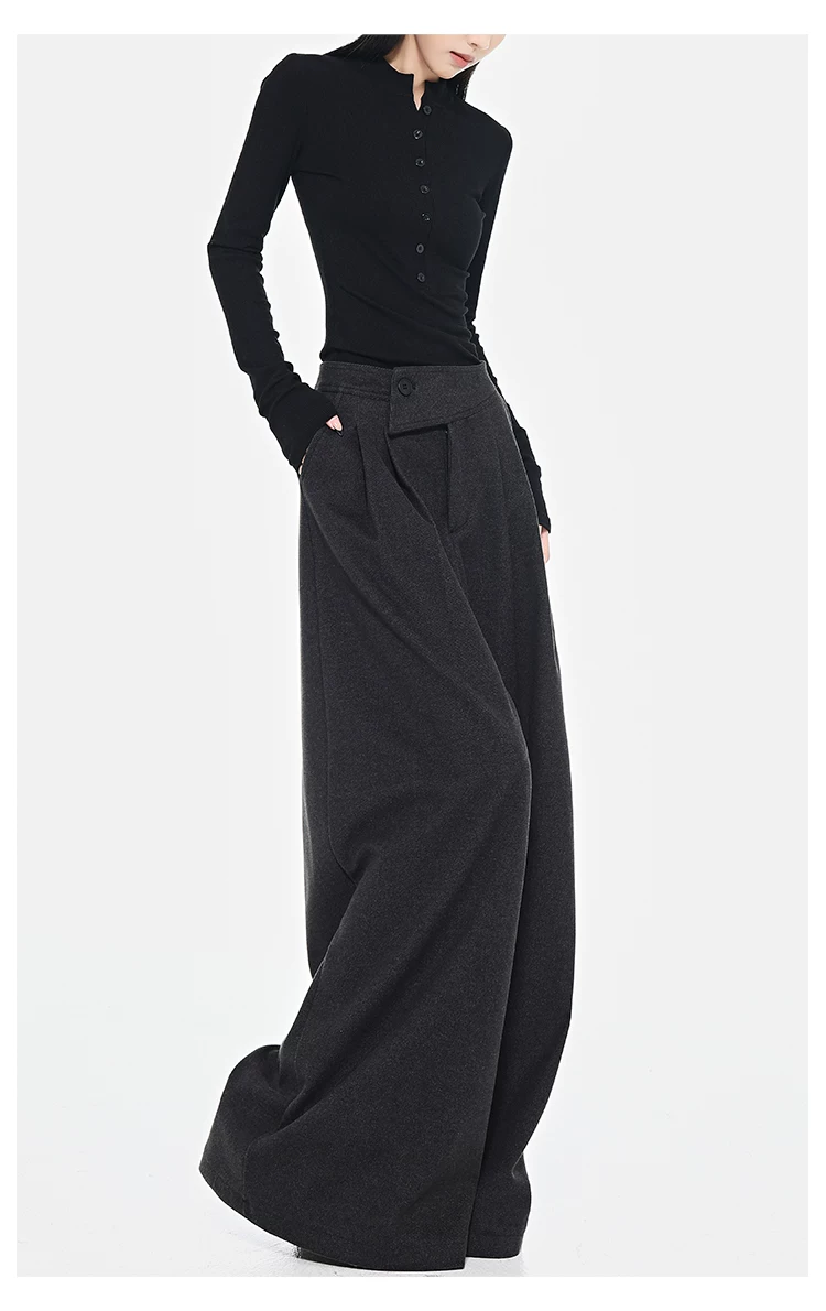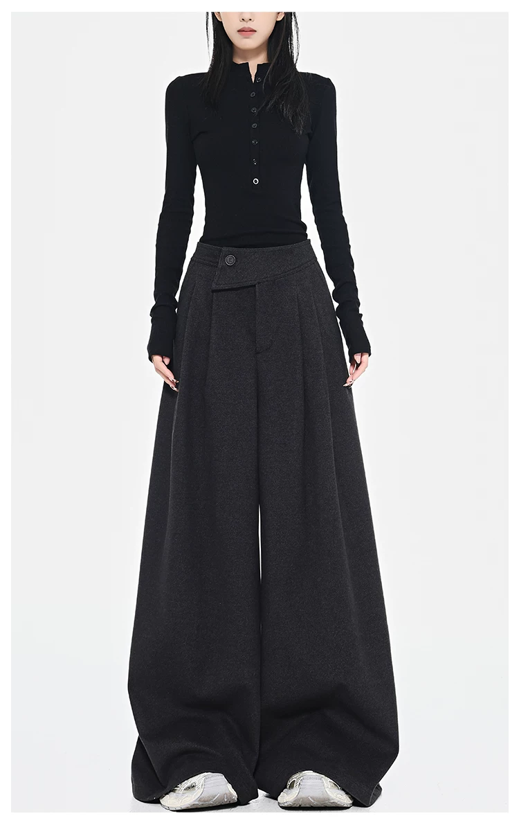- KEN STUDIO Quần dài ống rộng màu xám thu đông mới dành cho nữ, quần dài dáng rộng đa năng lưng cao