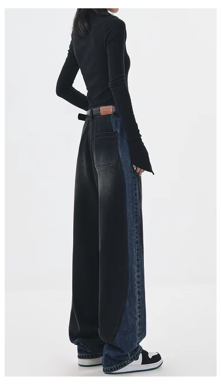 KEN STUDIO quần jean chắp vá màu sắc cổ điển mới mùa thu đông dành cho nữ, quần ống rộng cạp cao giúp thon gọn.