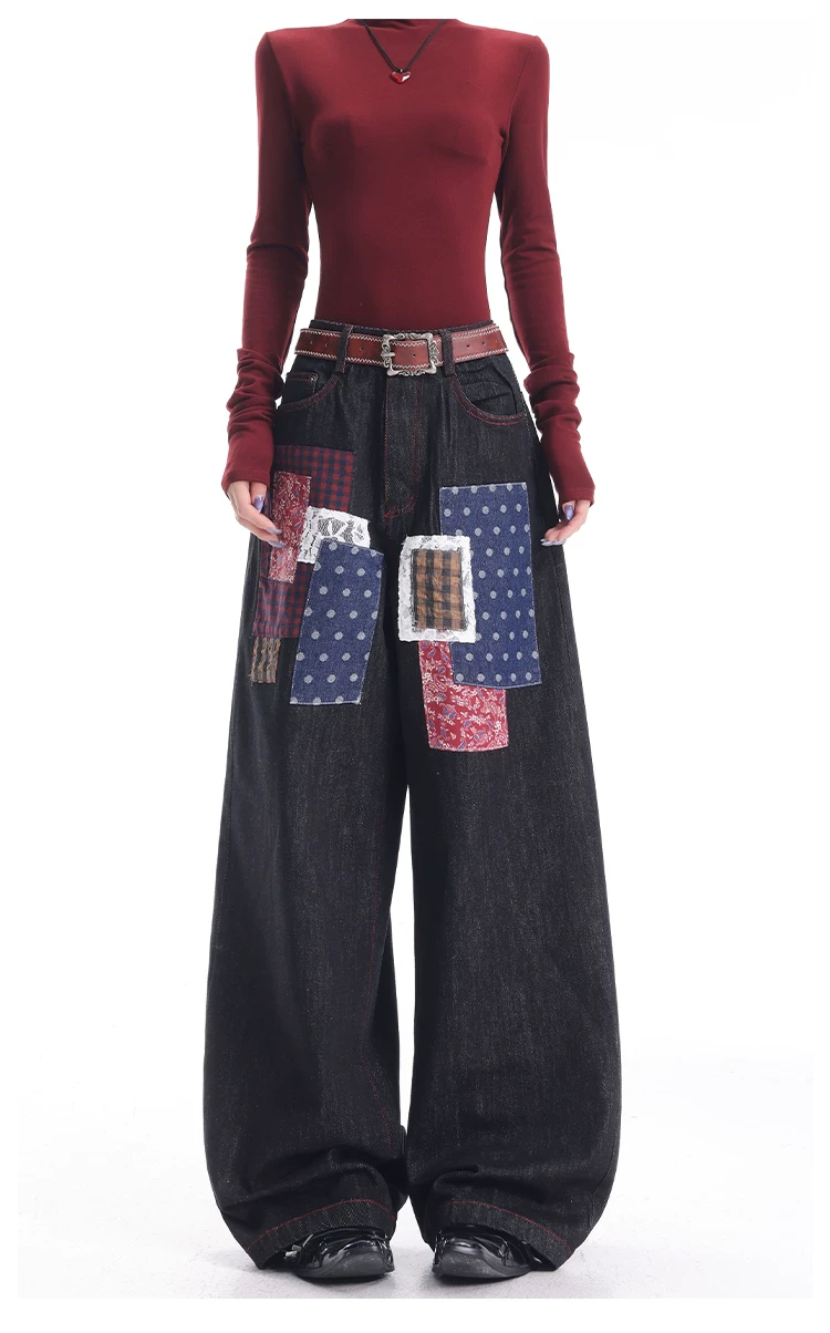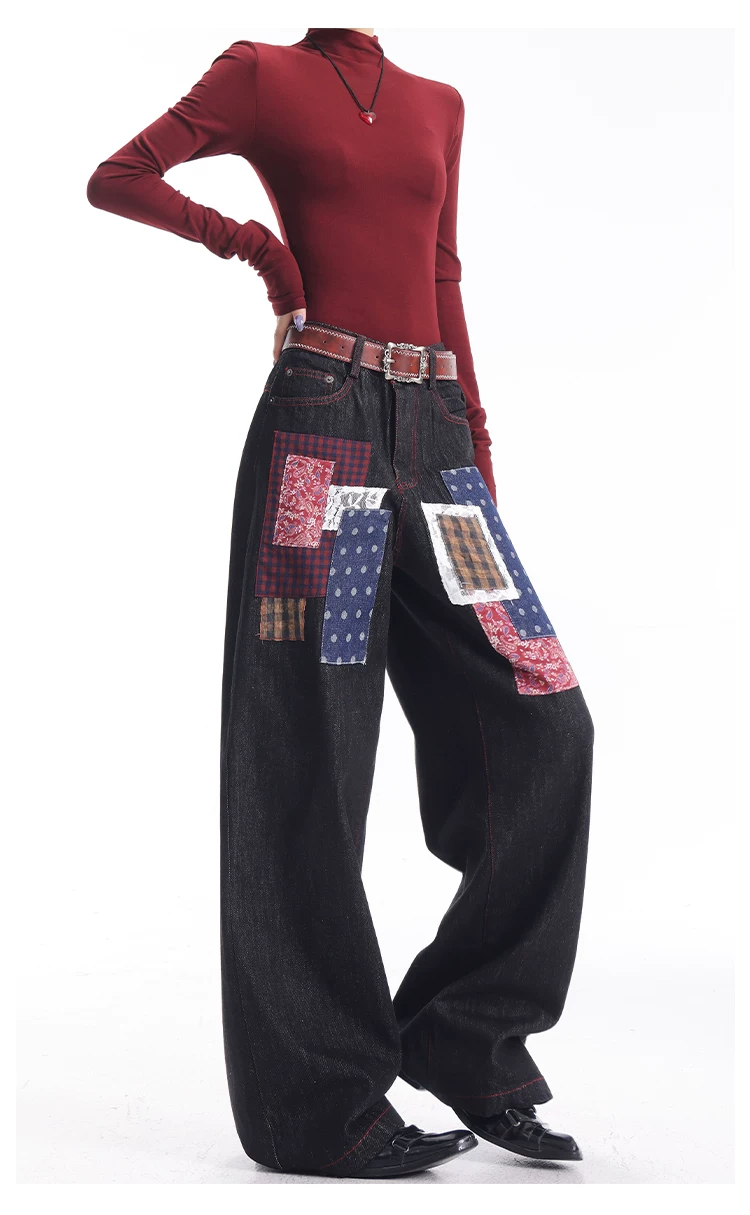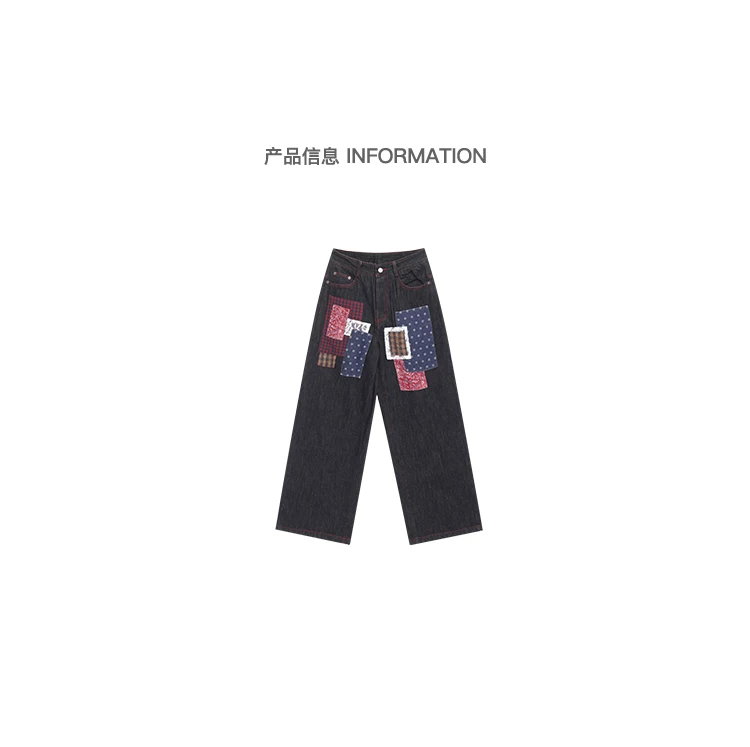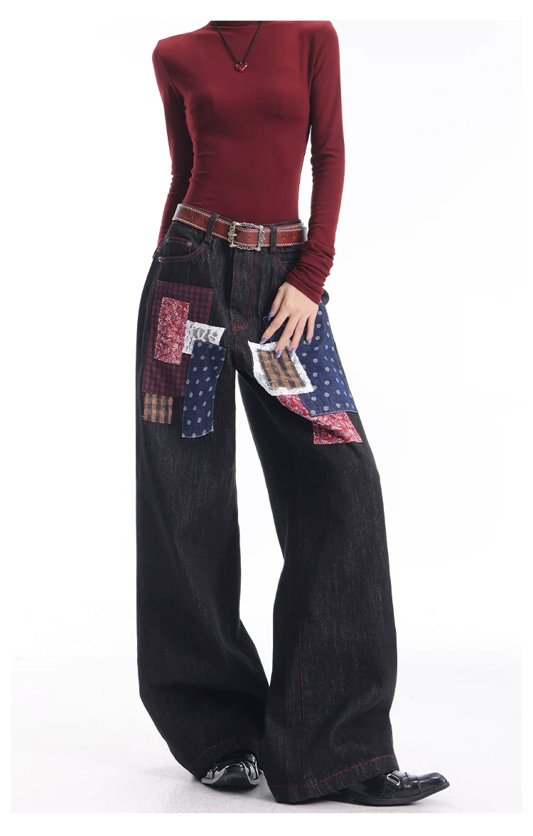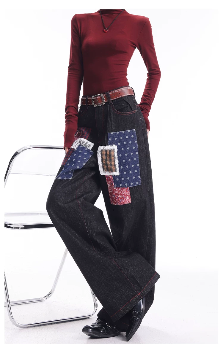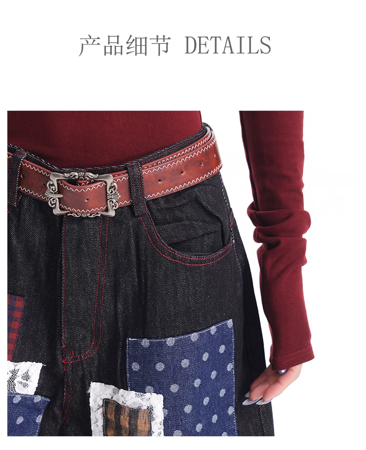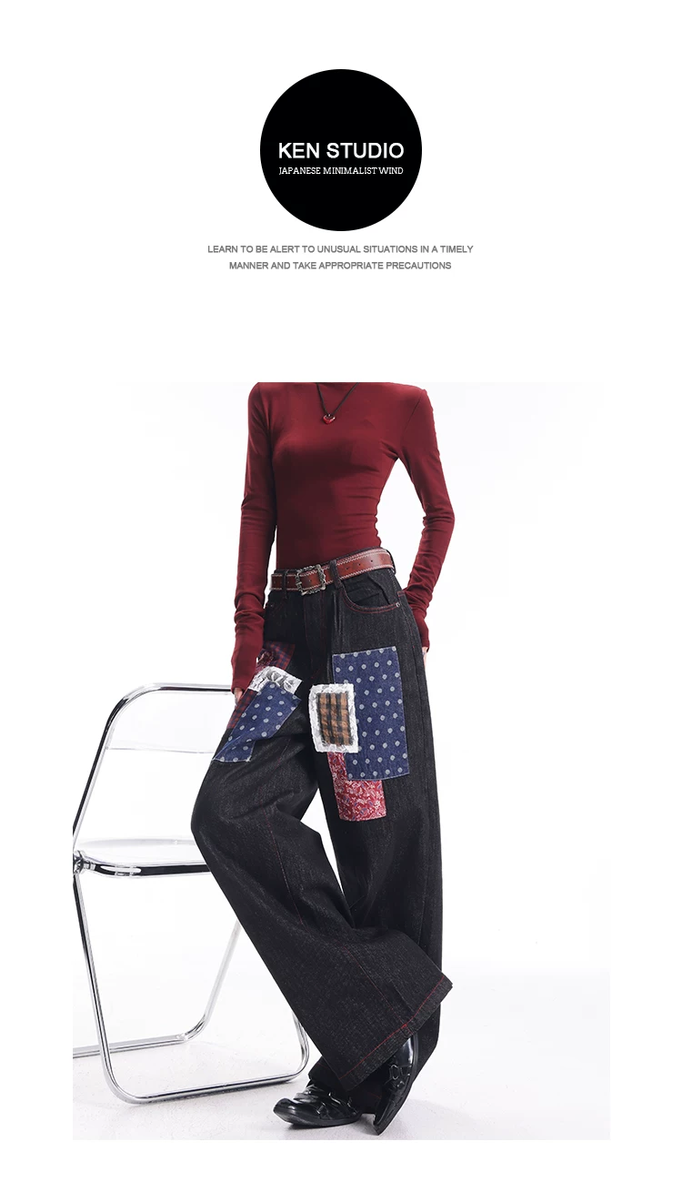 - KEN STUDIO quần jean chắp vá phong cách retro mới của Mỹ dành cho nữ, quần ống rộng dáng rộng, giảm béo