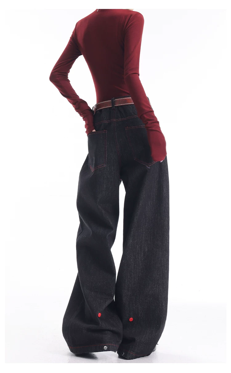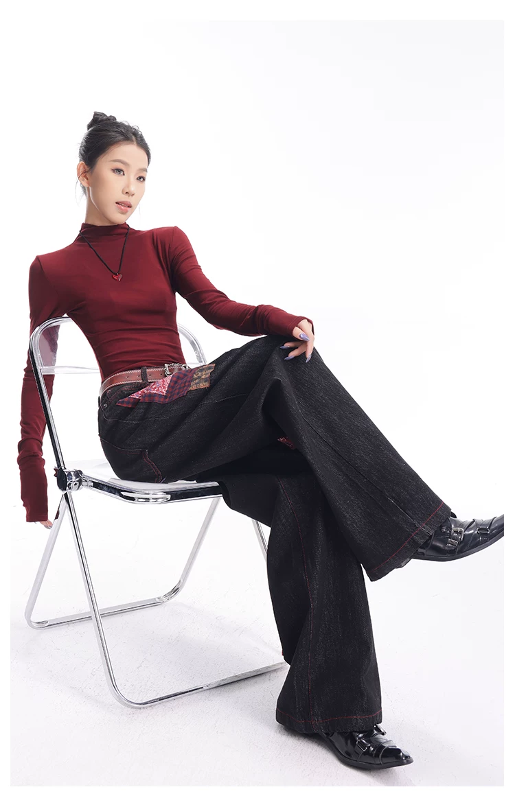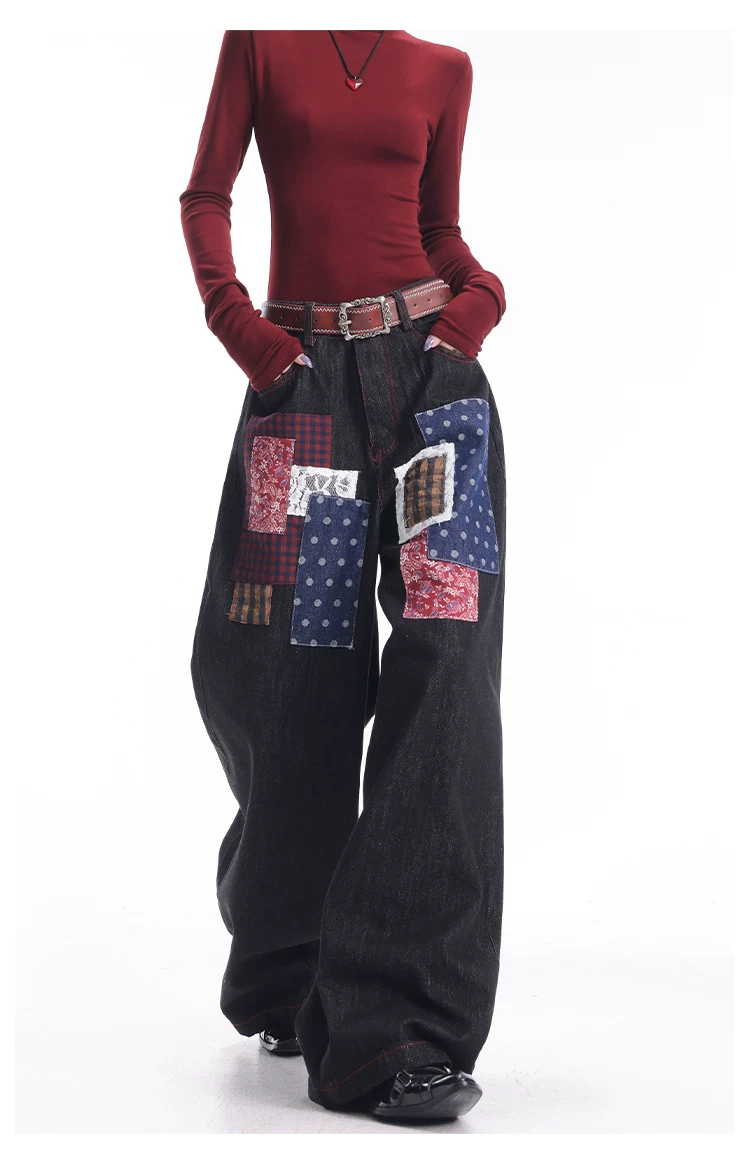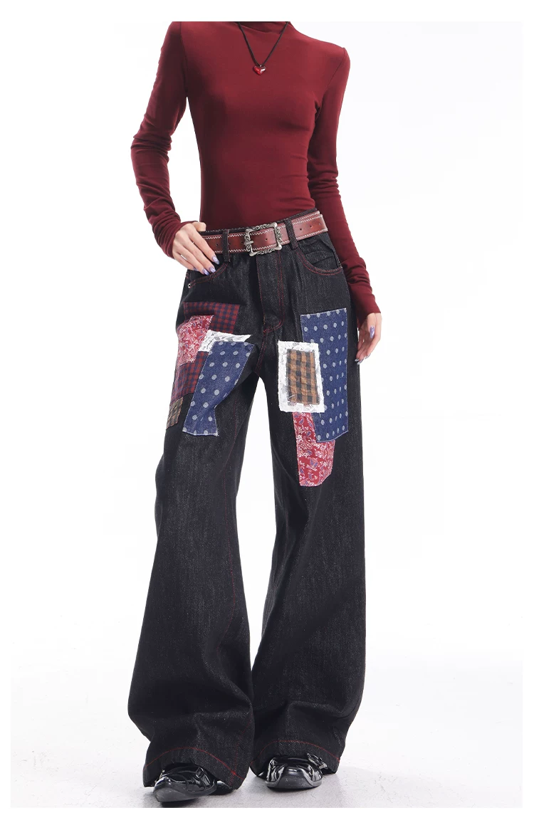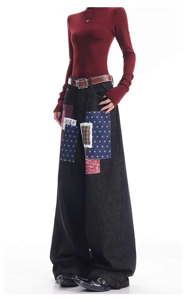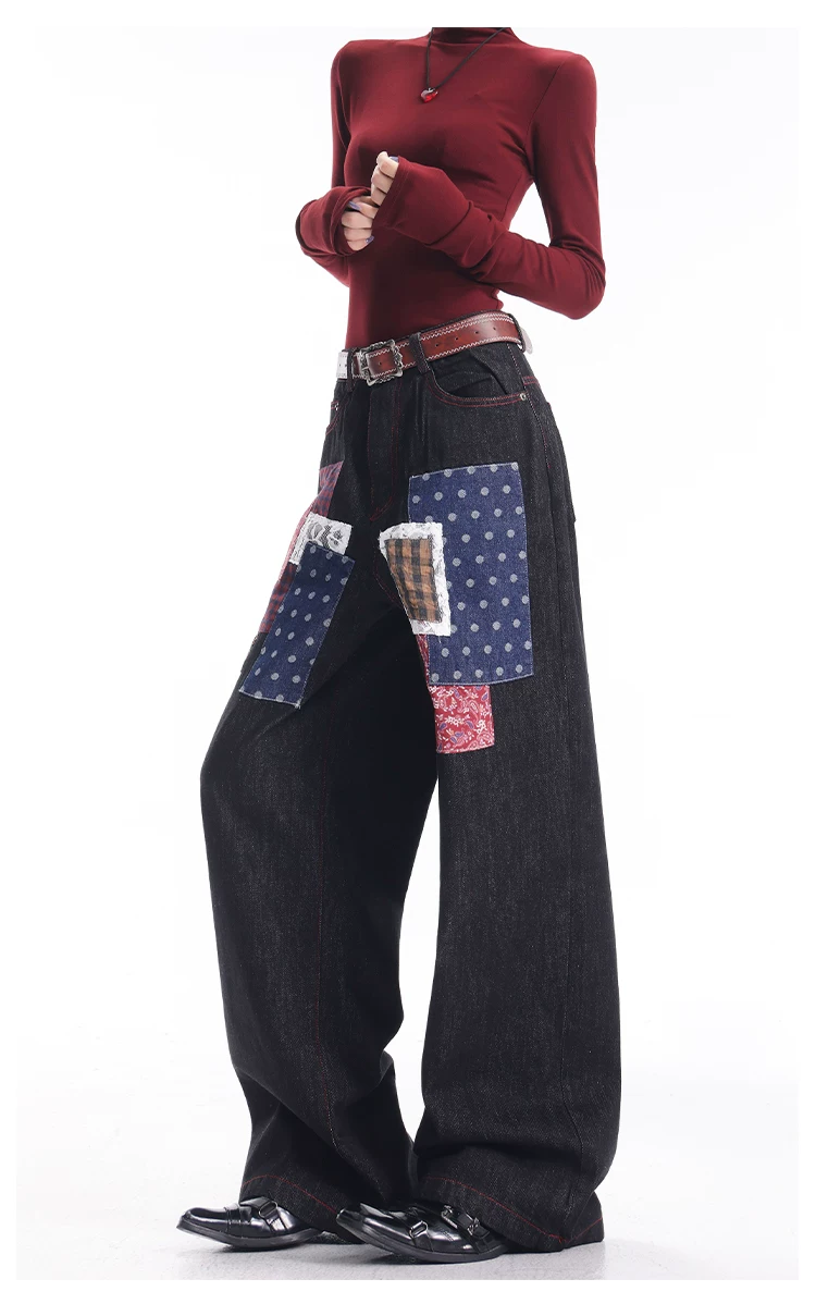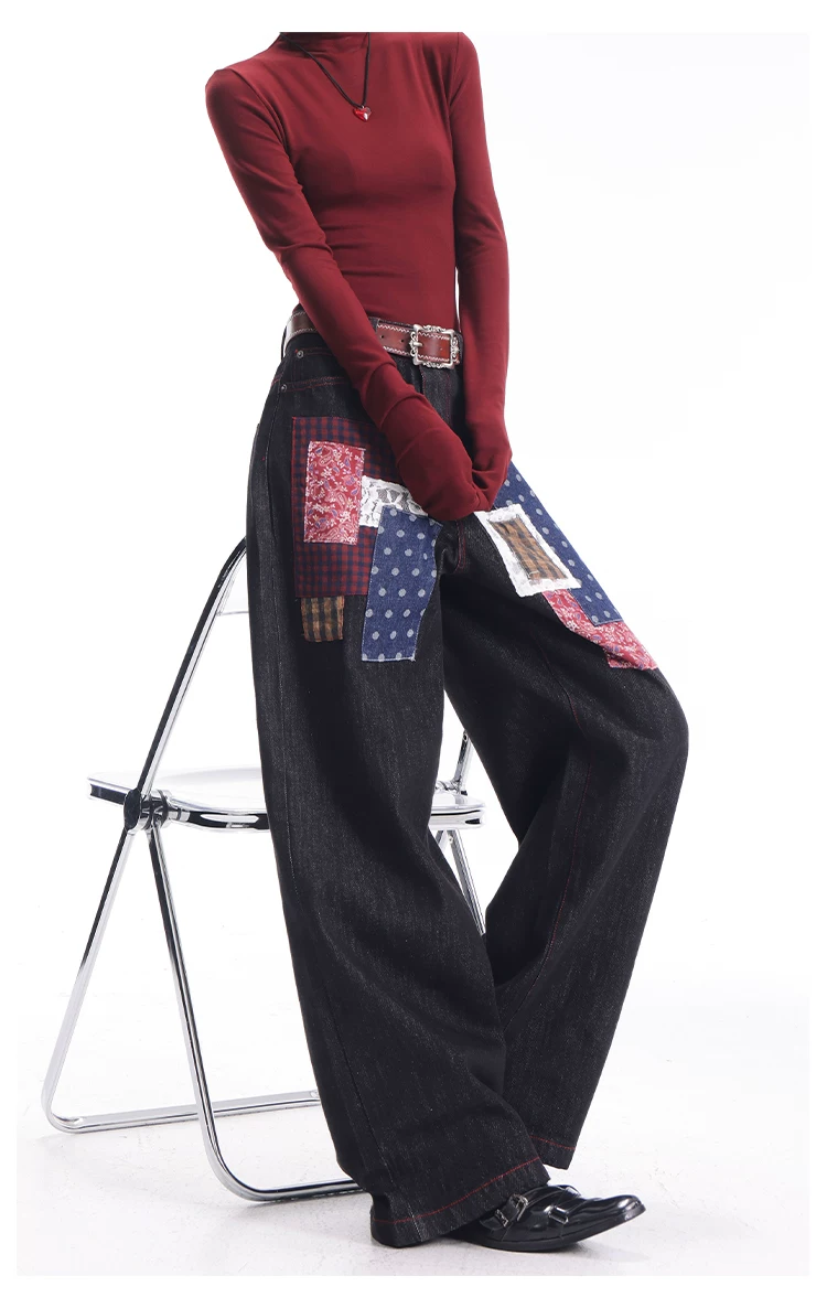- KEN STUDIO quần jean chắp vá phong cách retro mới của Mỹ dành cho nữ, quần ống rộng dáng rộng, giảm béo