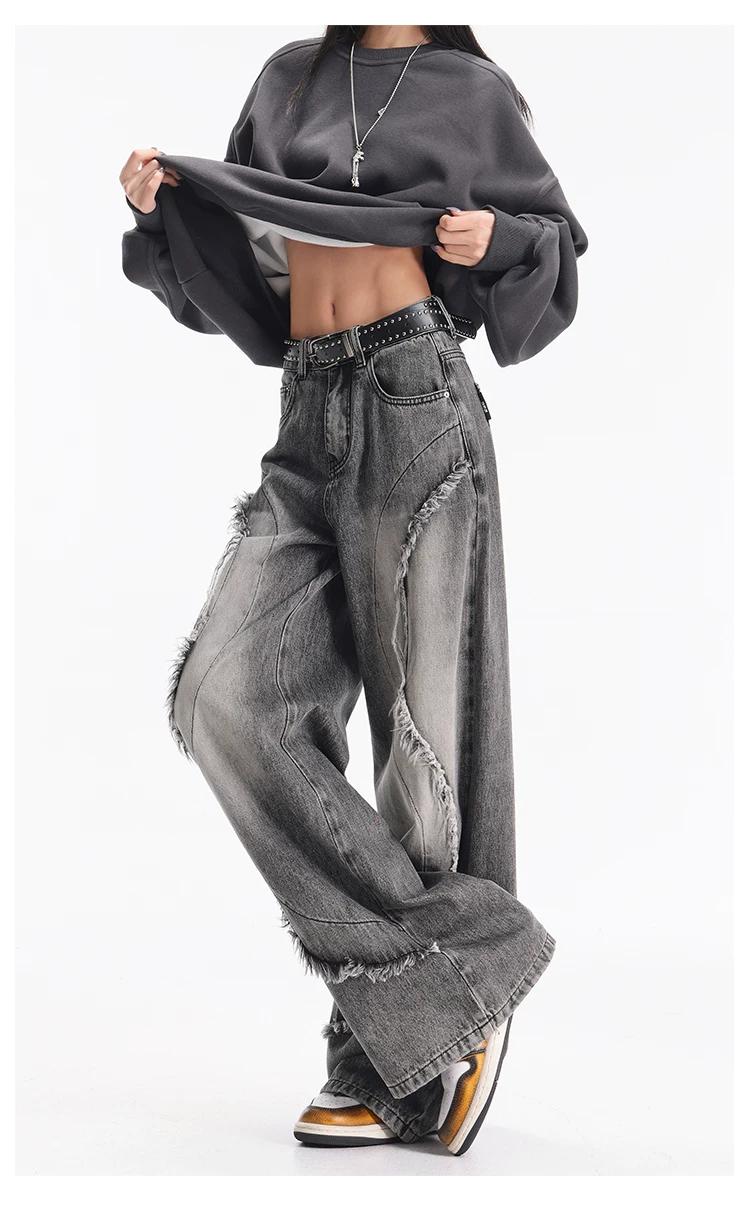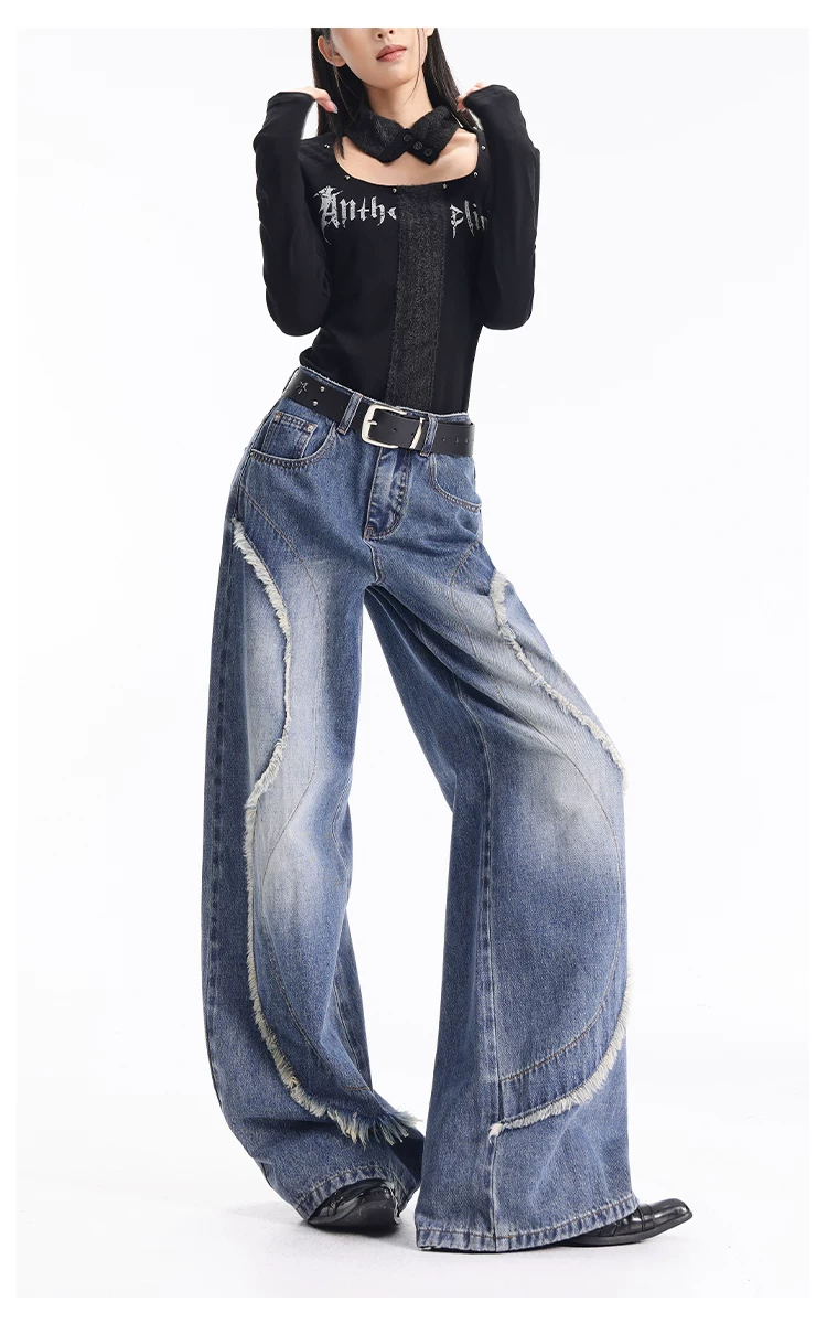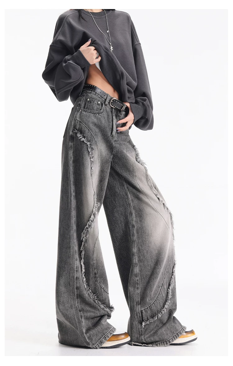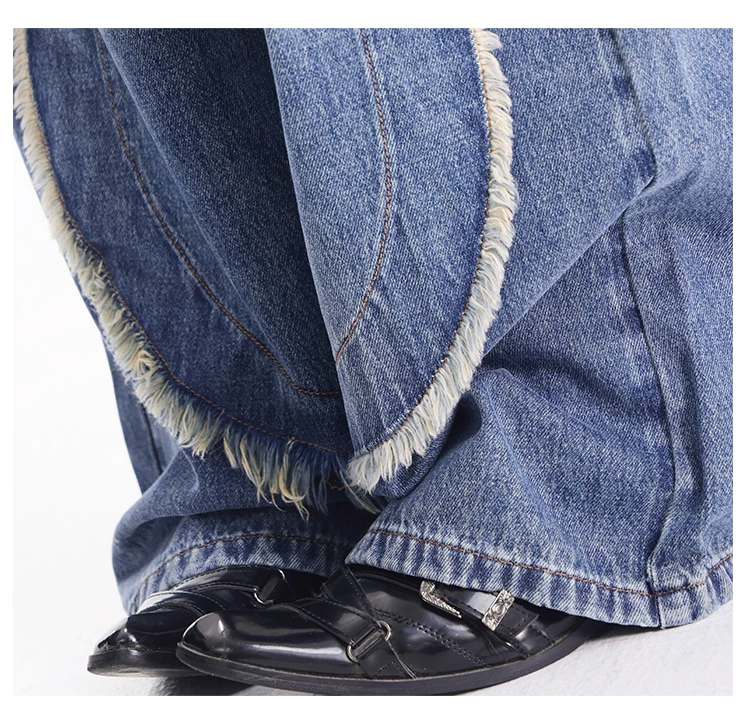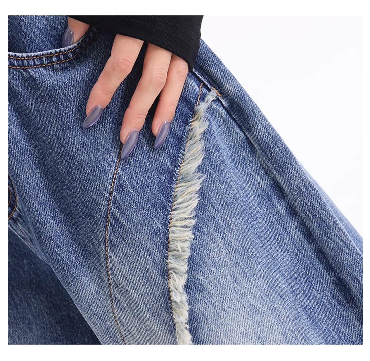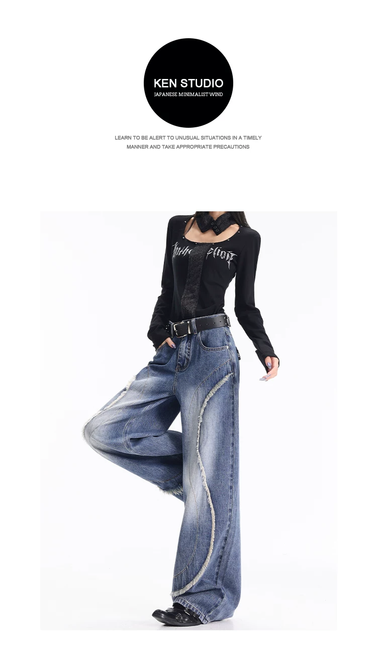 - KEN STUDIO quần jean chắp vá viền tua rua cổ điển mới mùa thu đông dành cho nữ, quần cạp cao, dáng rộng, dáng suông, quần ống rộng, dài đến sàn