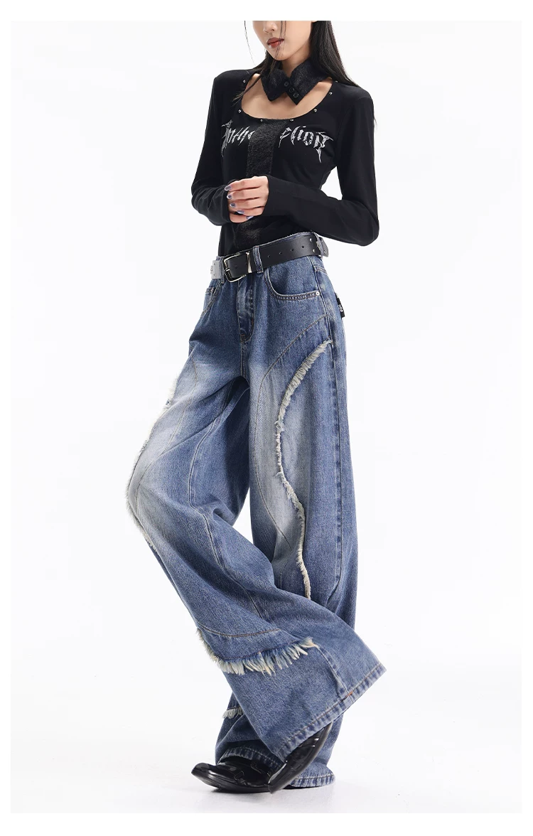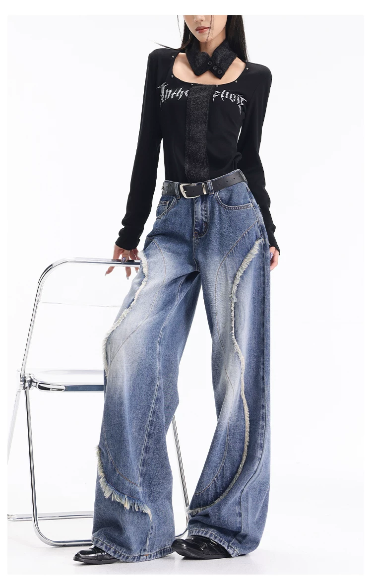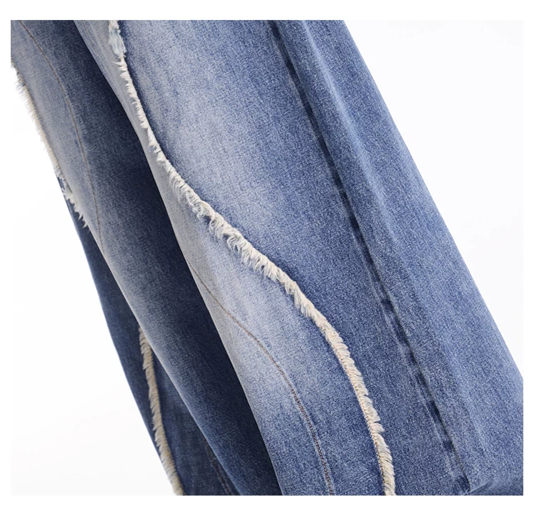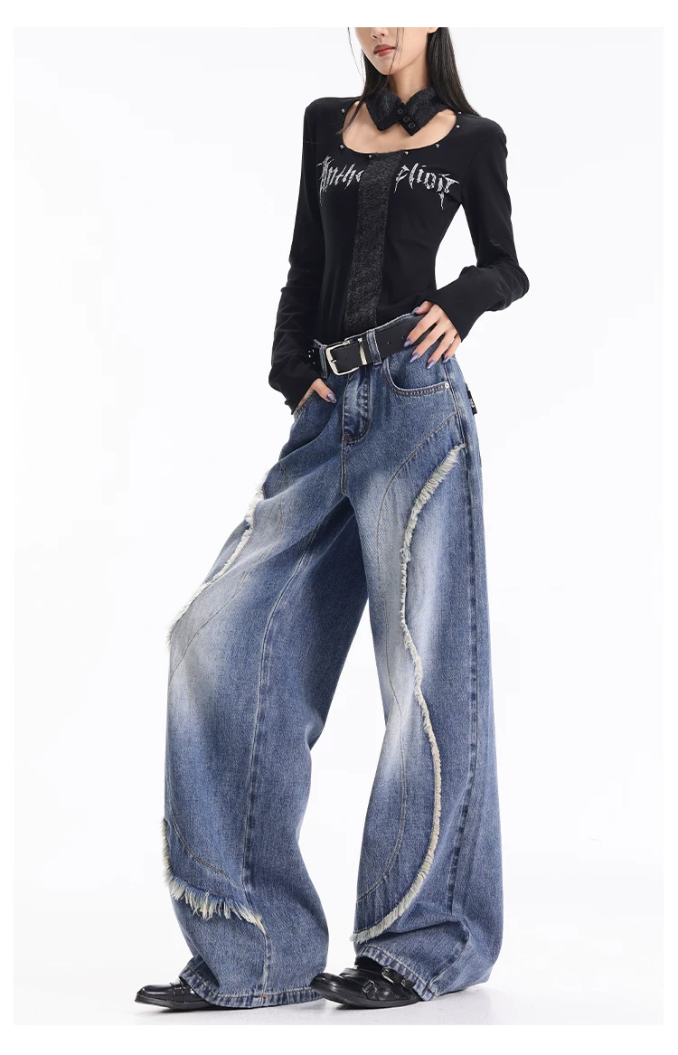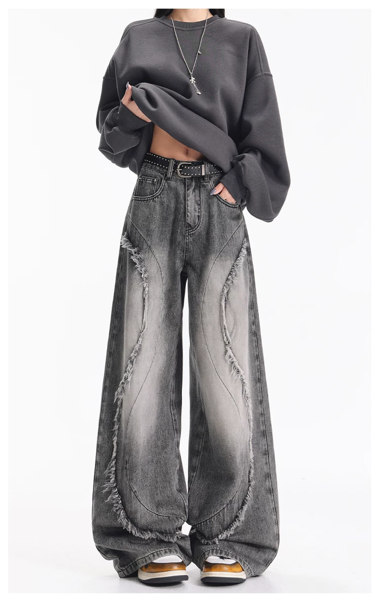 - KEN STUDIO quần jean chắp vá viền tua rua cổ điển mới mùa thu đông dành cho nữ, quần cạp cao, dáng rộng, dáng suông, quần ống rộng, dài đến sàn